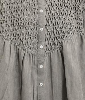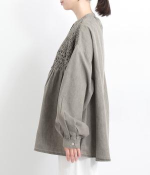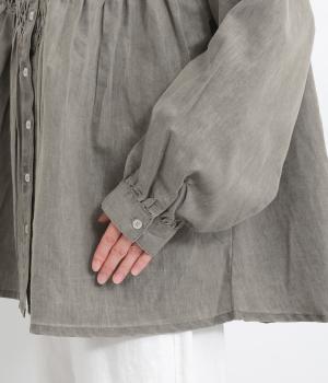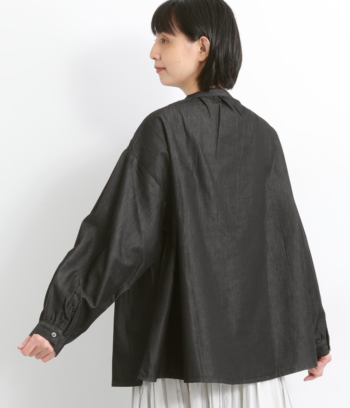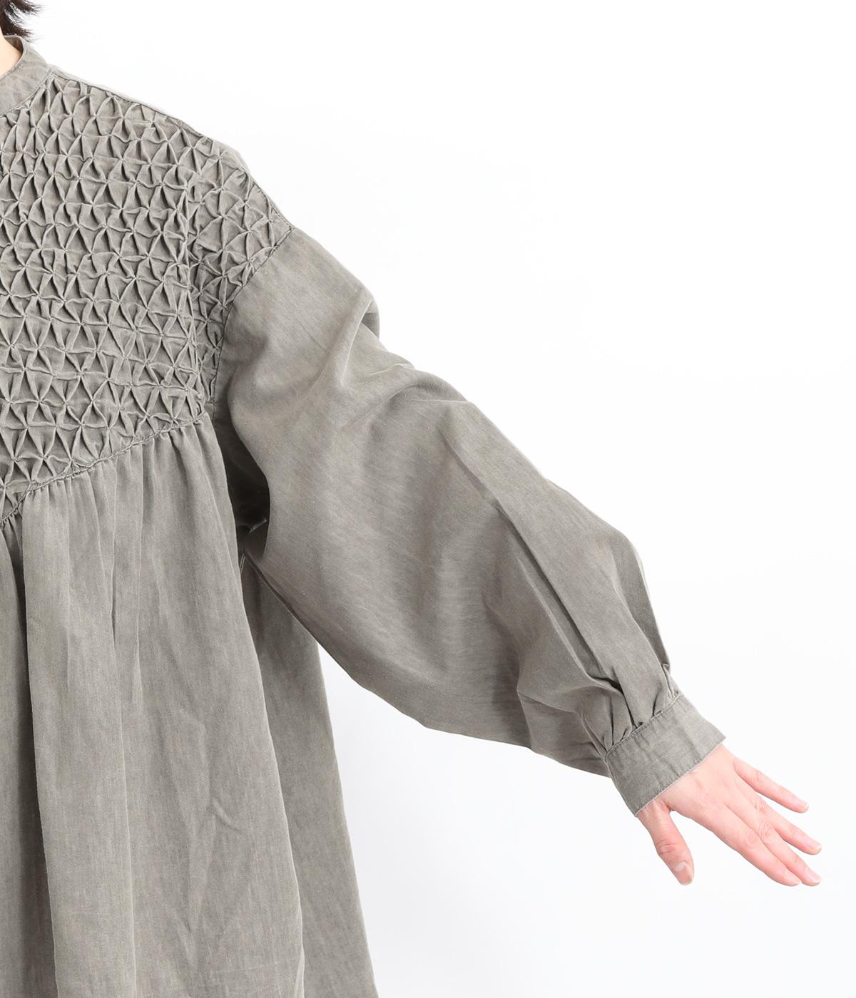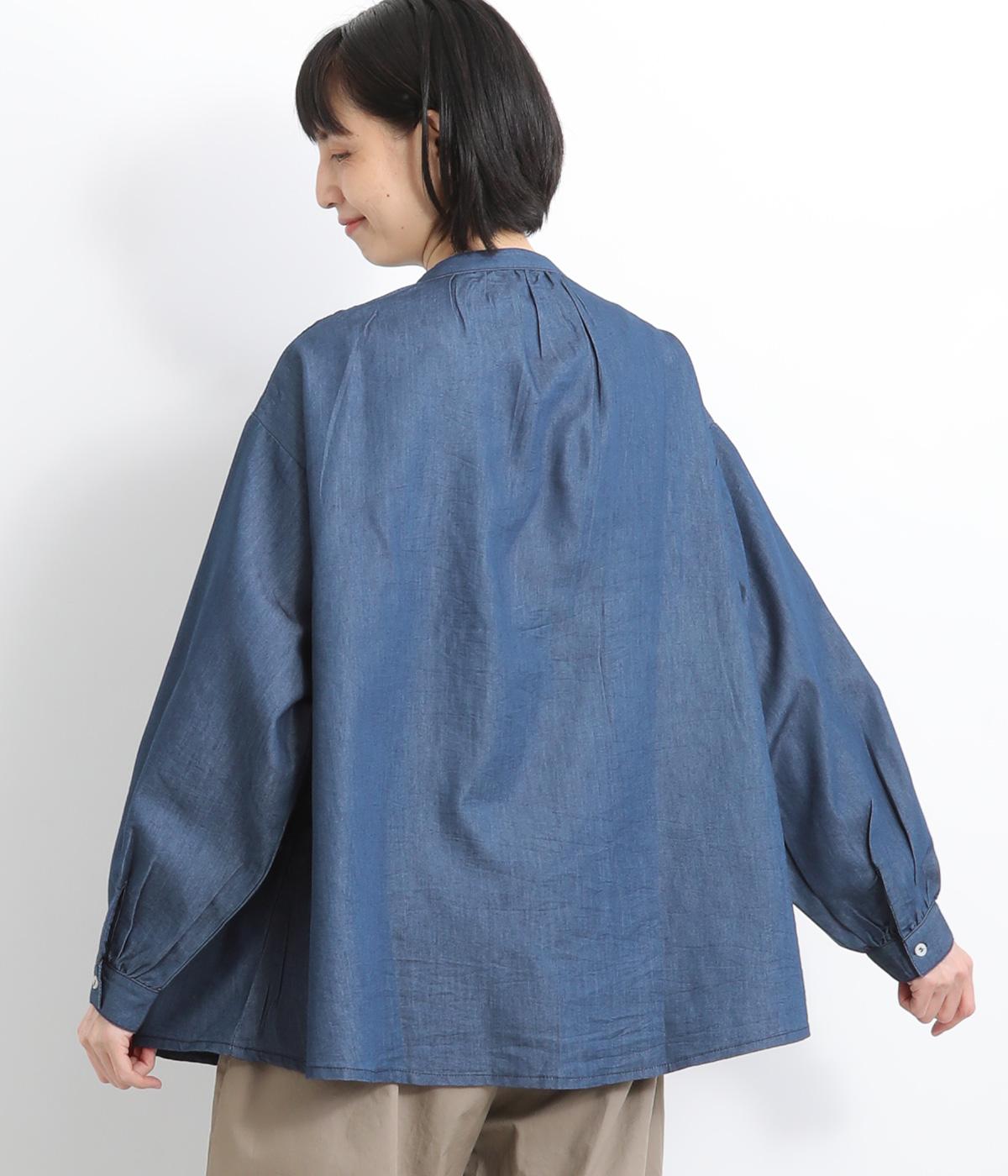 身頃上部のスモッキングディテールがアイキャッチになったデニムシャツです。フレアシルエットが着映えして、カジュアルな素材ながらフェミニンテイストに。袖口はギャザーを寄せてふわりとさせ、羽織りにもなる前あき仕様です。