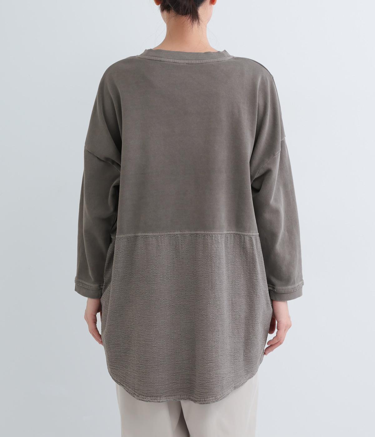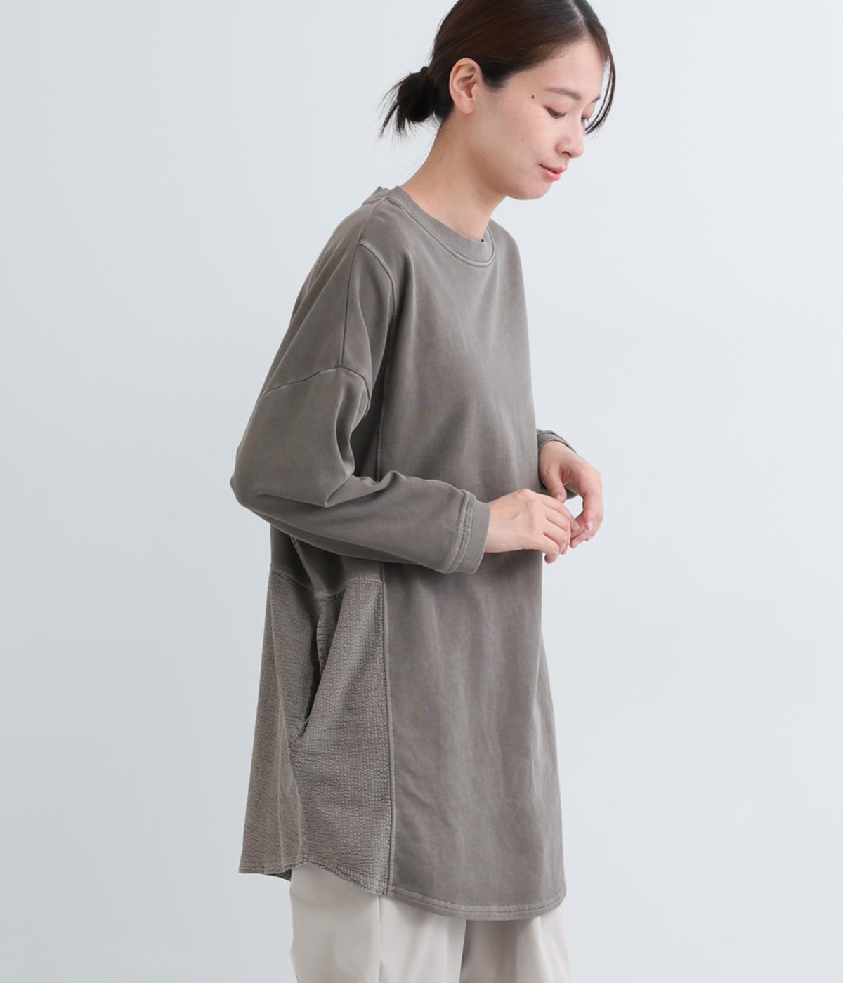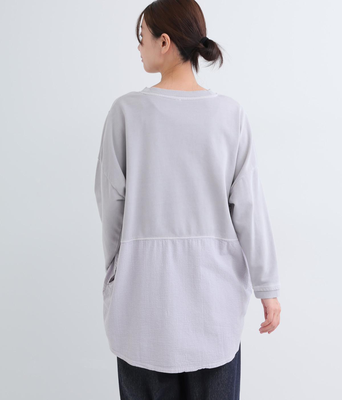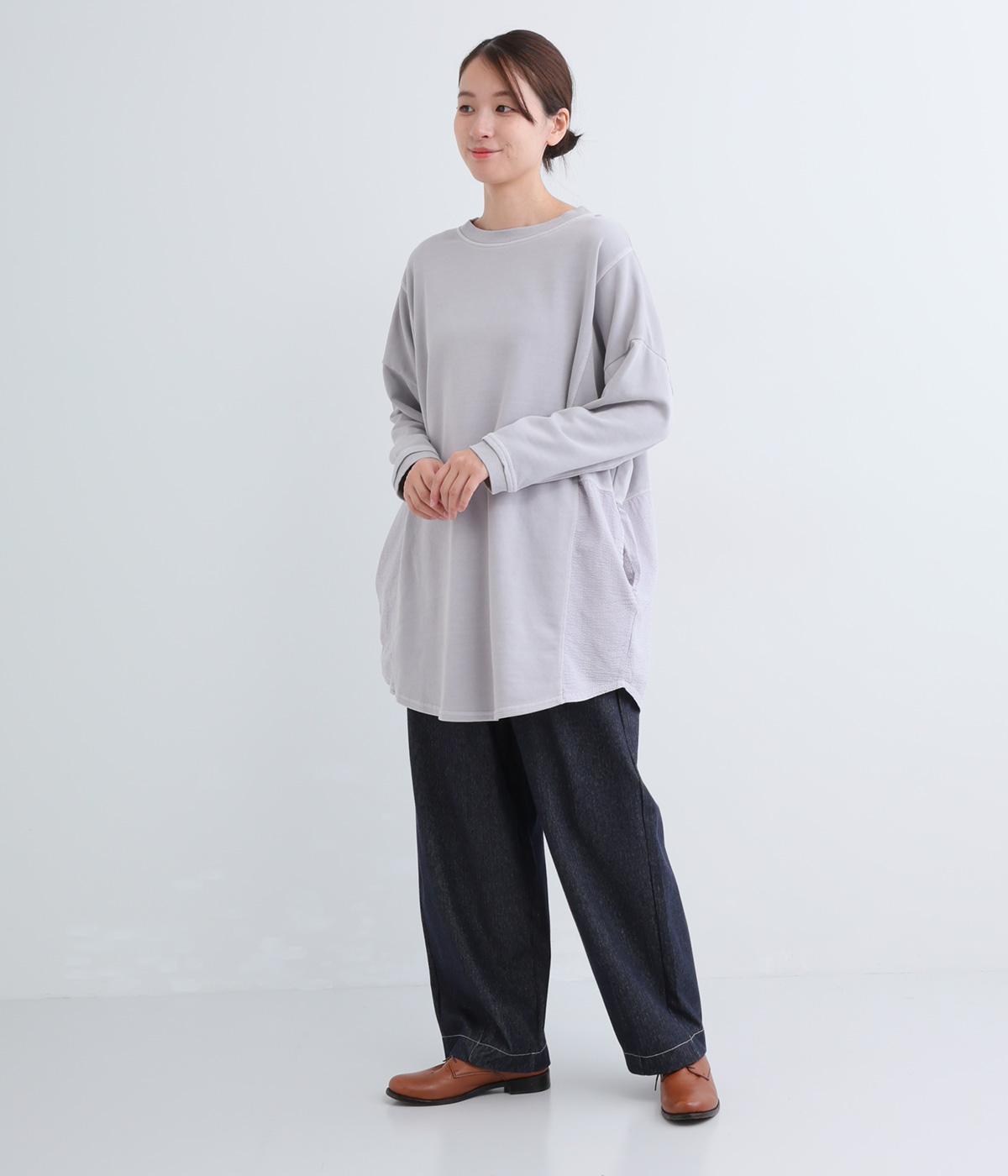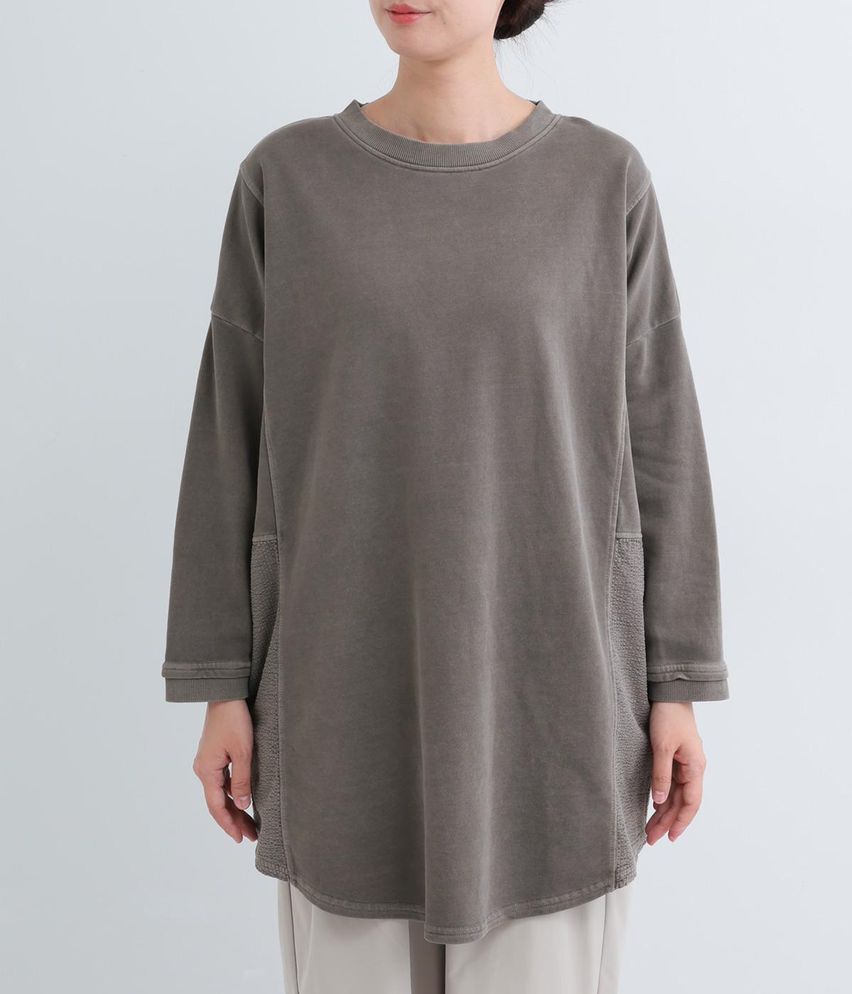 異素材のコントラストが奥行きのある表情をつくるチュニックです。ボトムスを選ばず、サッと着るだけでスタイリングが完成します。ゆったりとリラックス感のある着心地で、丸いヘムラインが全体をやわらかくまとめます。