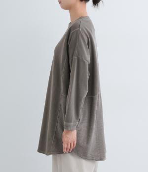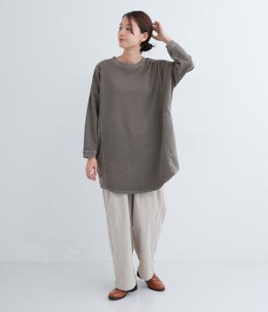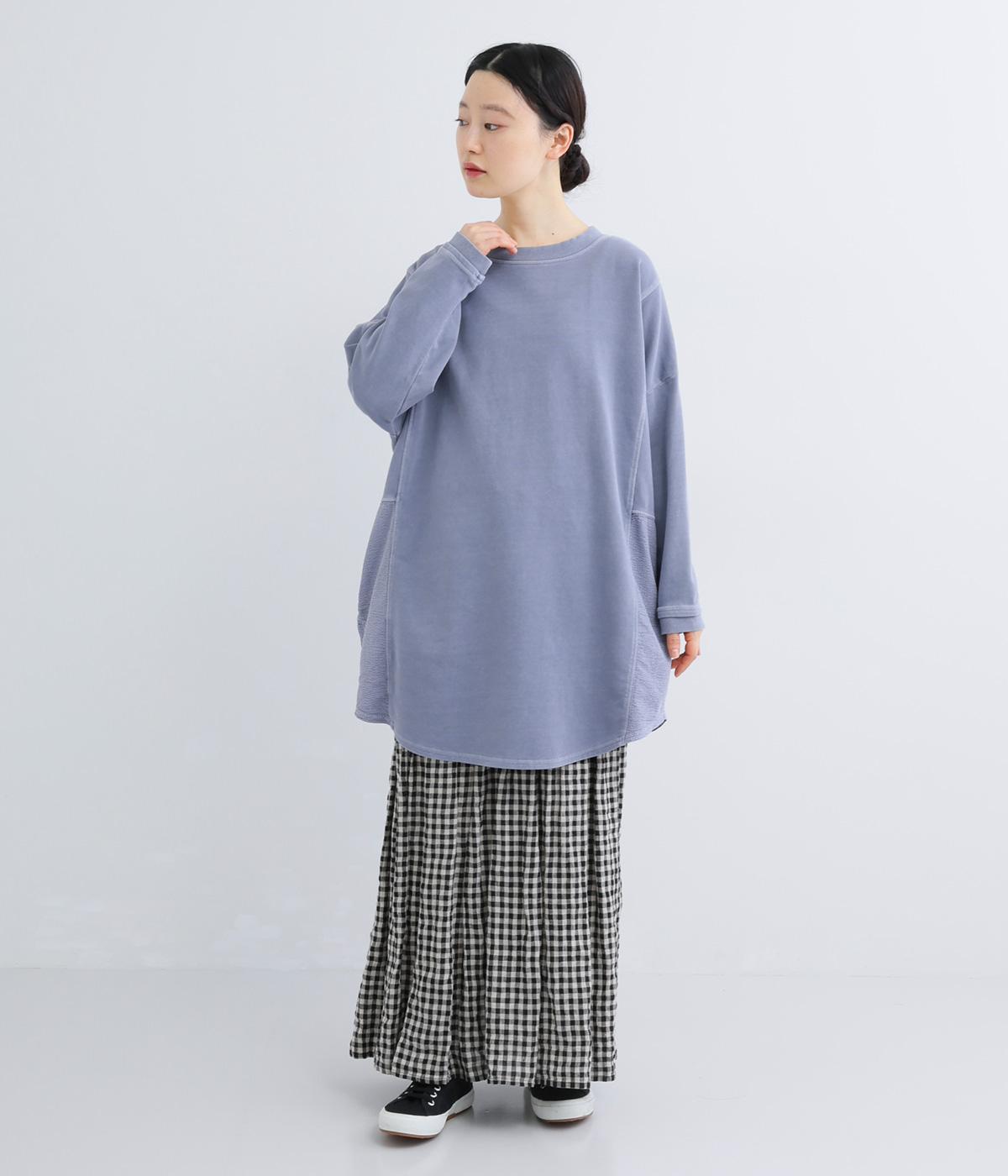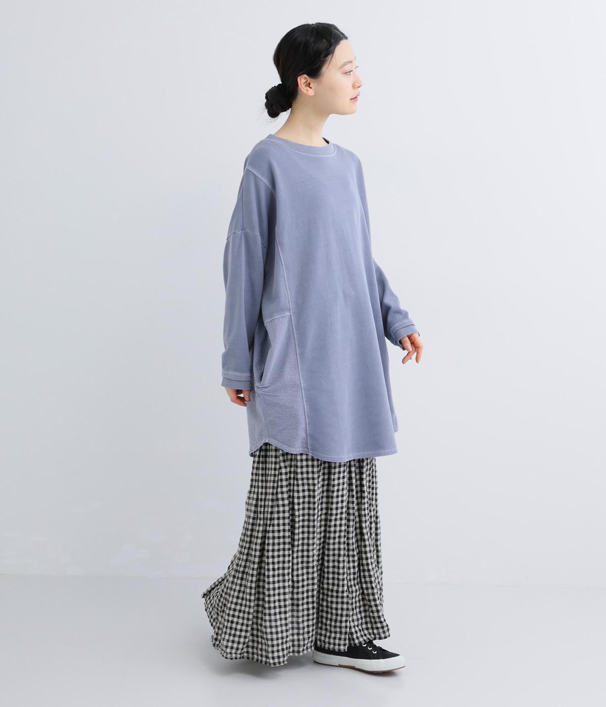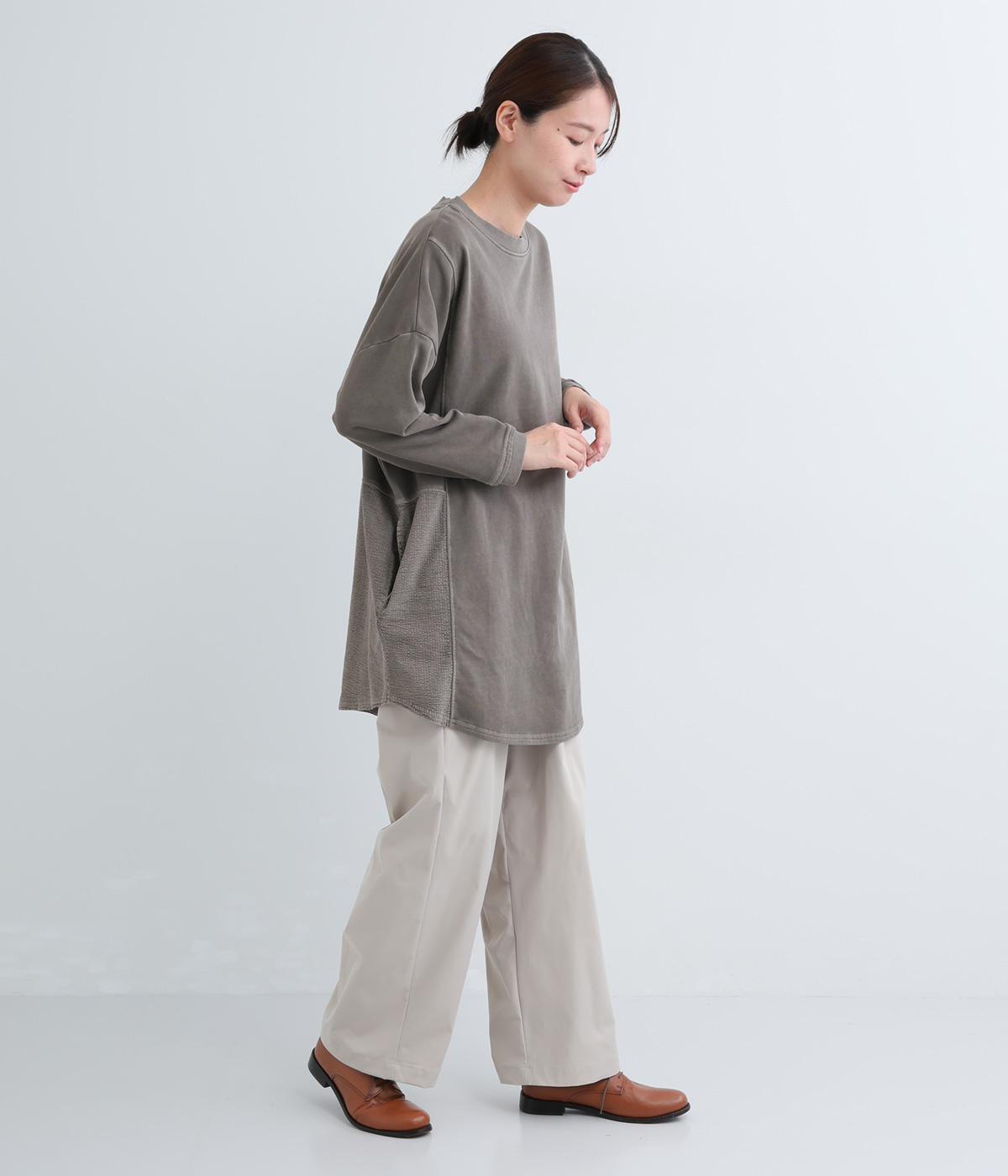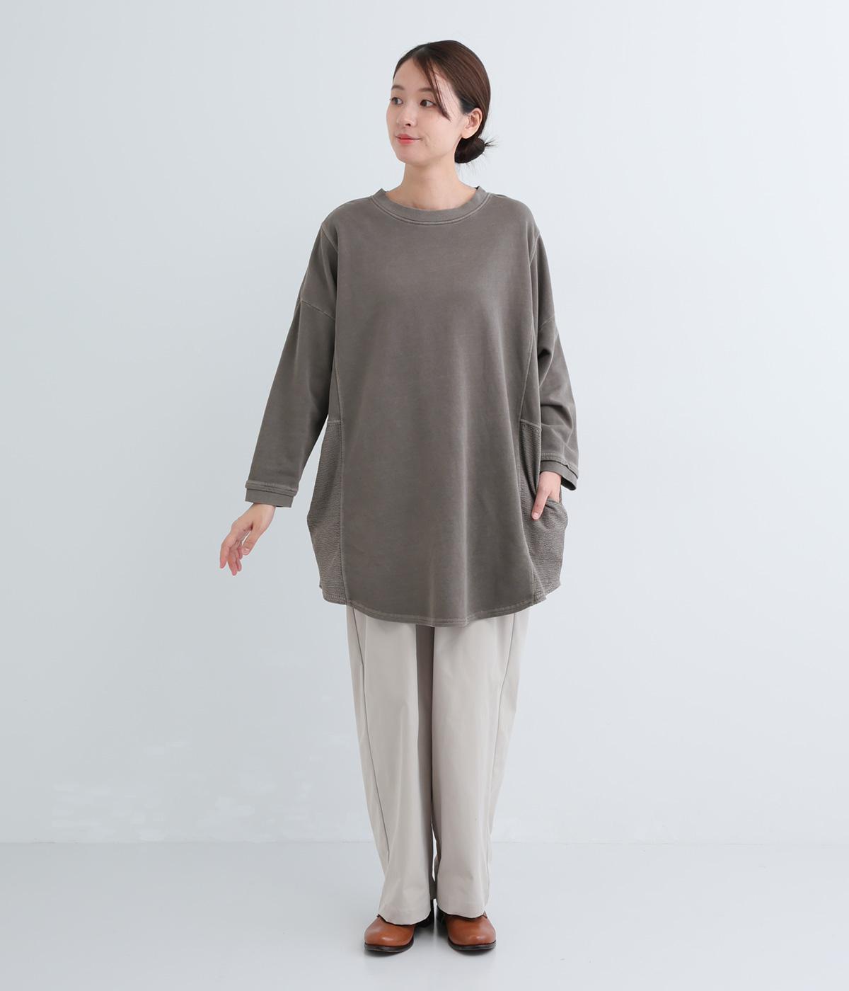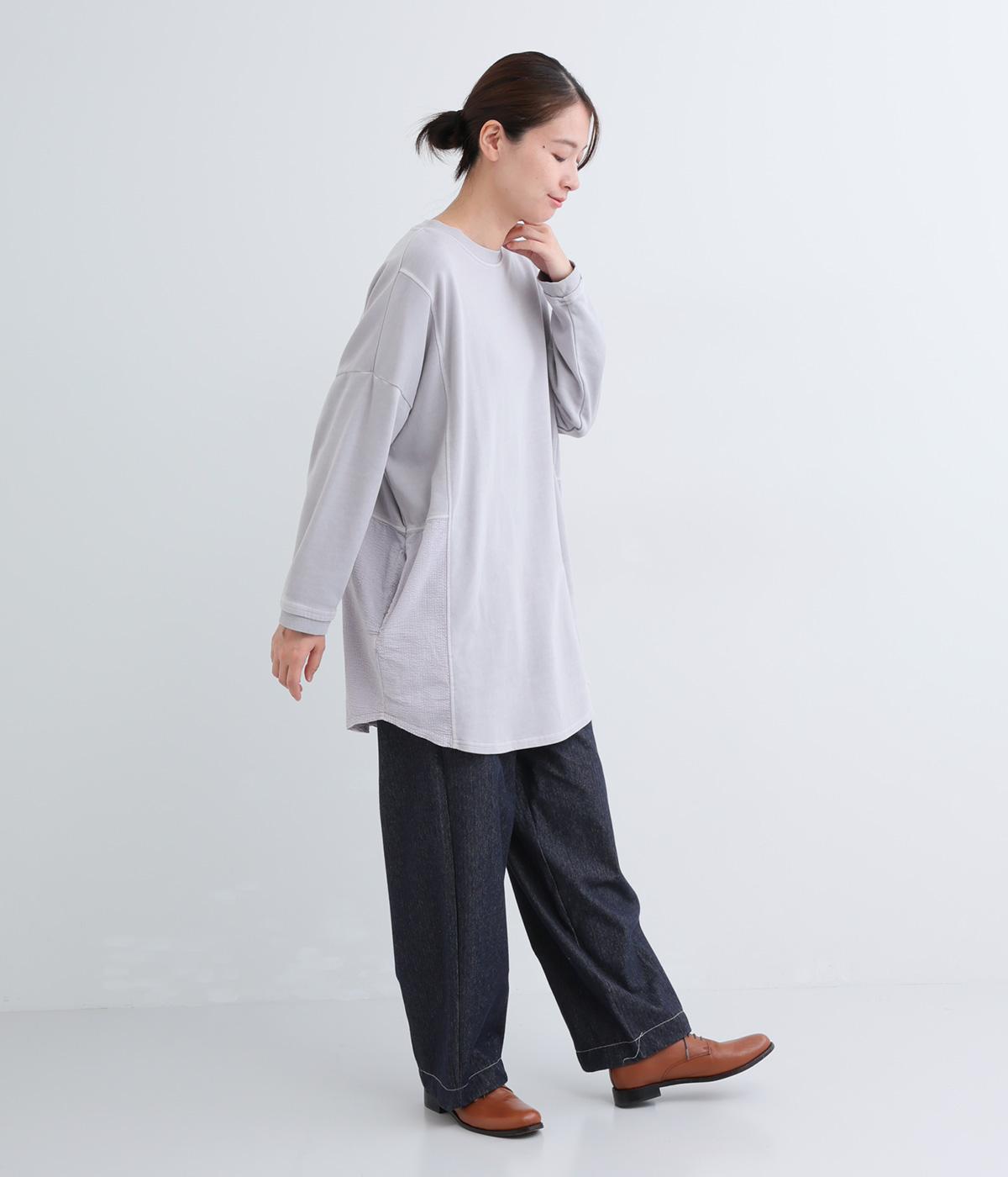異素材のコントラストが奥行きのある表情をつくるチュニックです。ボトムスを選ばず、サッと着るだけでスタイリングが完成します。ゆったりとリラックス感のある着心地で、丸いヘムラインが全体をやわらかくまとめます。