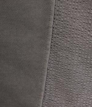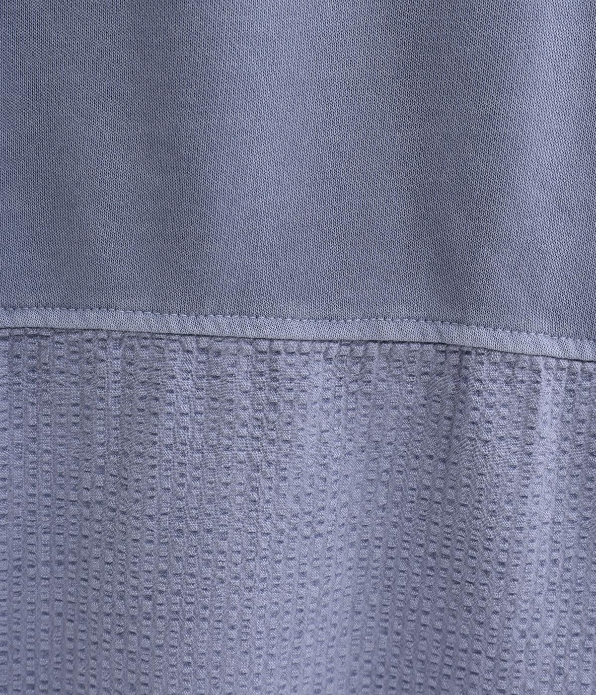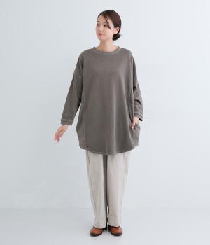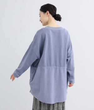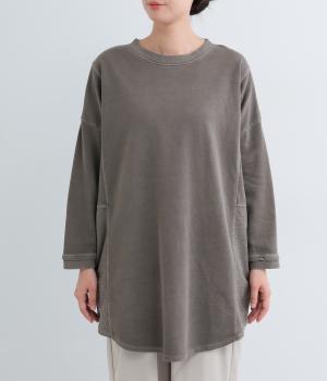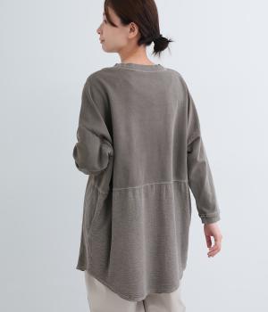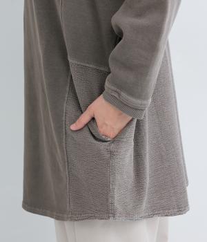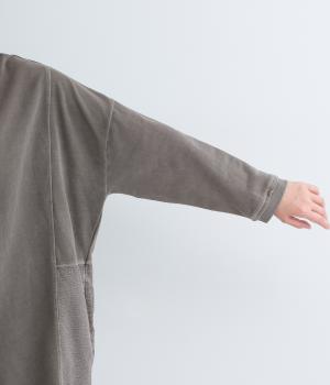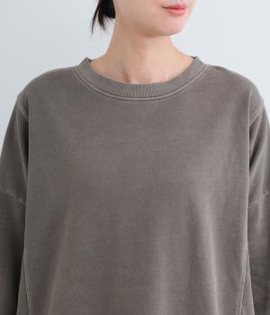 ビンテージライクな味わいのある表情が魅力の裏毛ピグメント生地です。洗濯するたびに味わい深くなり、独特な落ち感を醸します。袖や背面にはシボ感のある別布を合わせました。