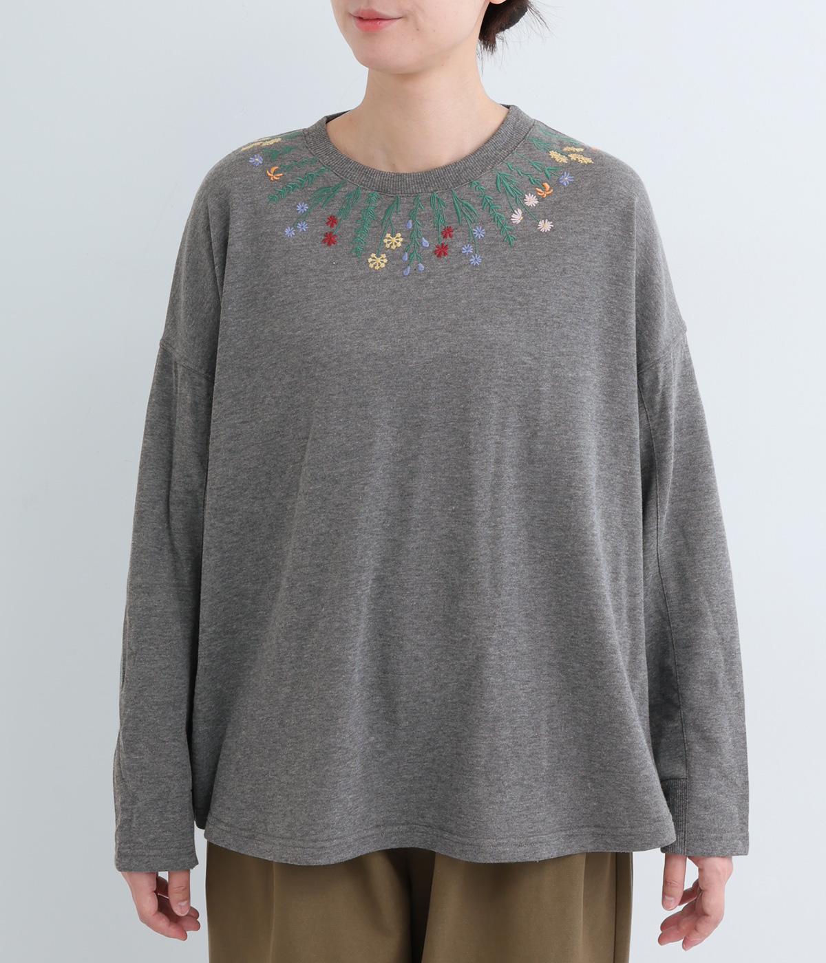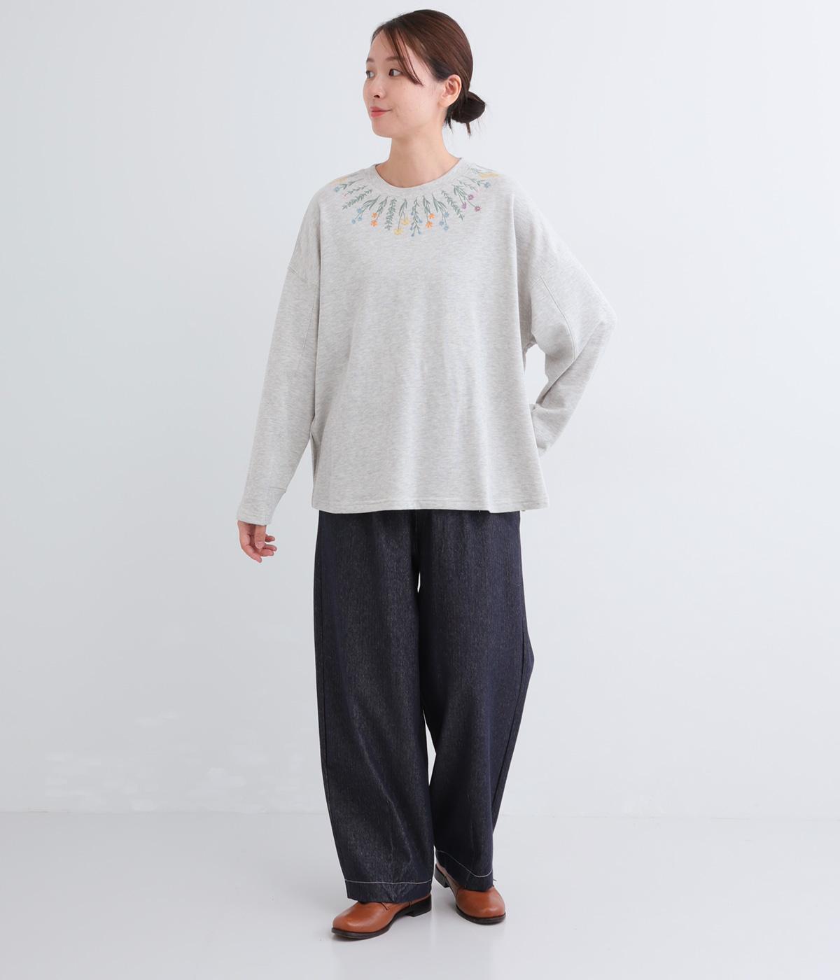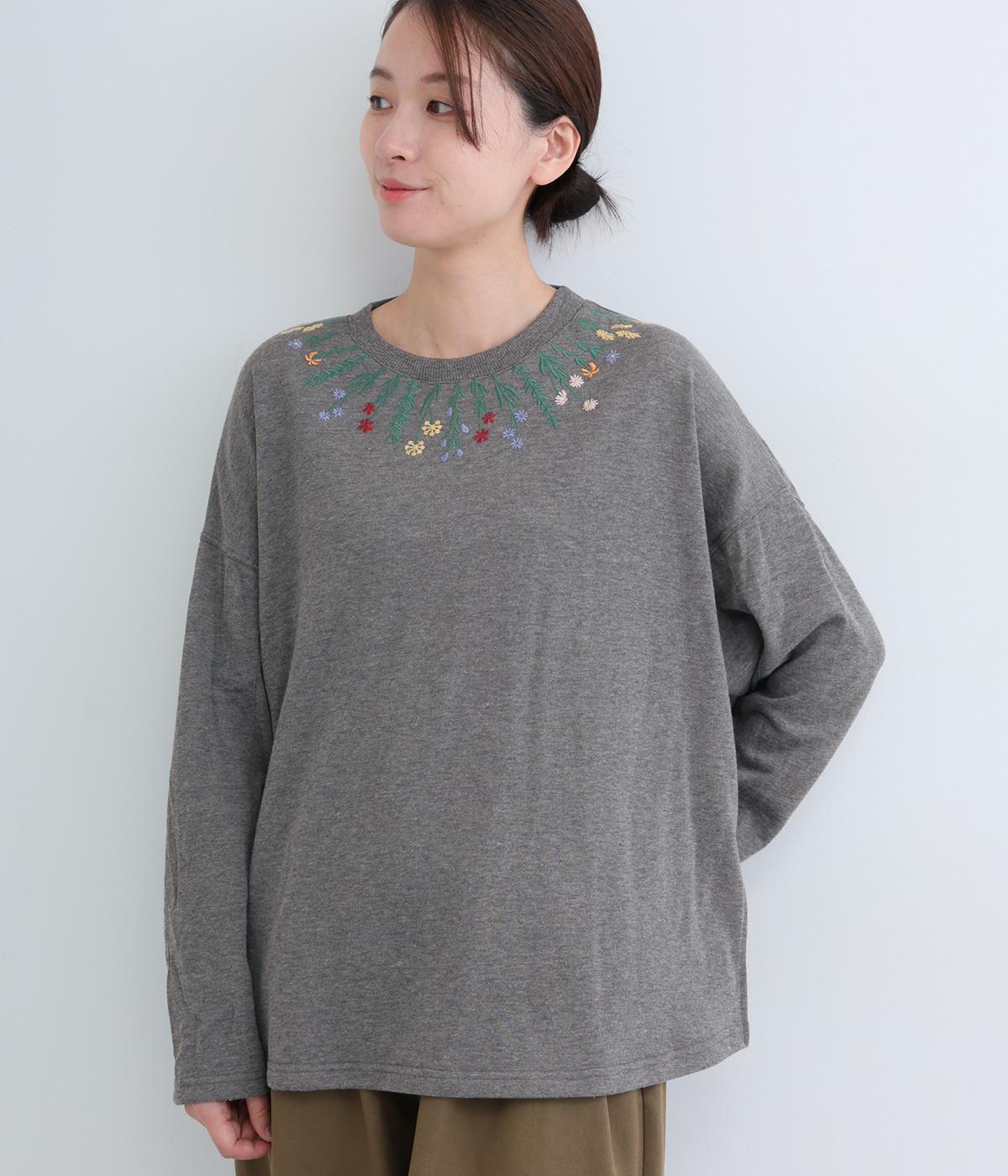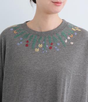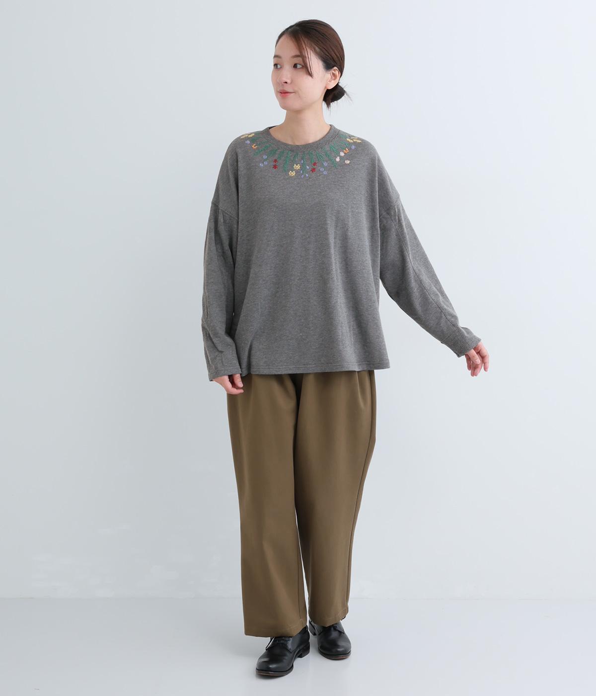 杢調のニュアンスのある色味が大人の装いにしっくりなじみます。ゆったりしたシルエットでリラックス感のある着心地です。首元のお花刺しゅうがデザインポイントで、顔まわりを華やかに見せてくれます。