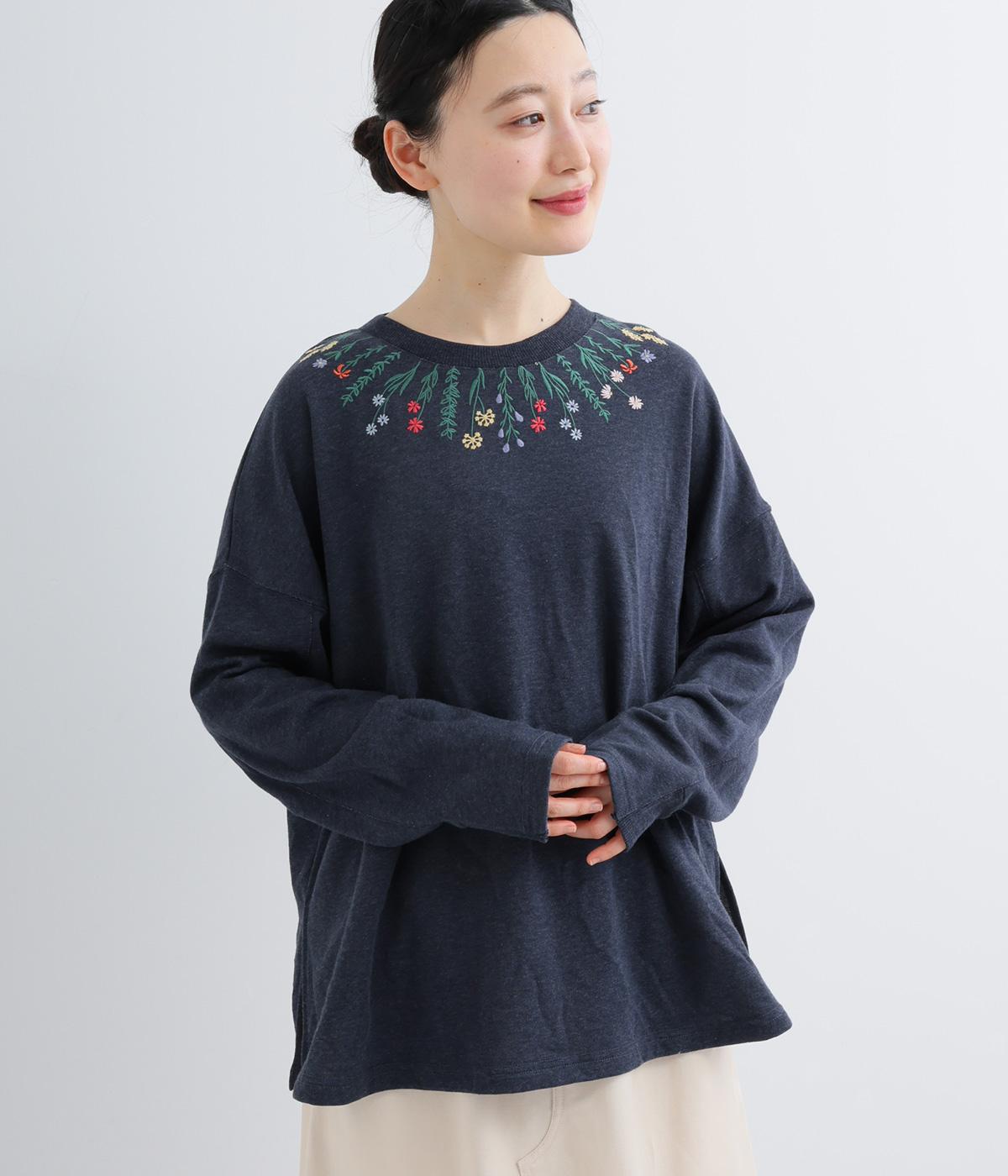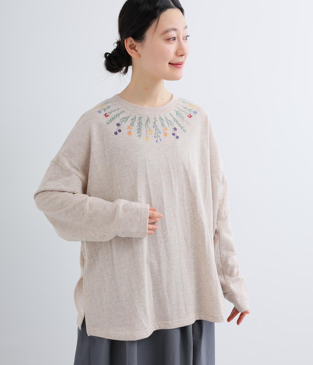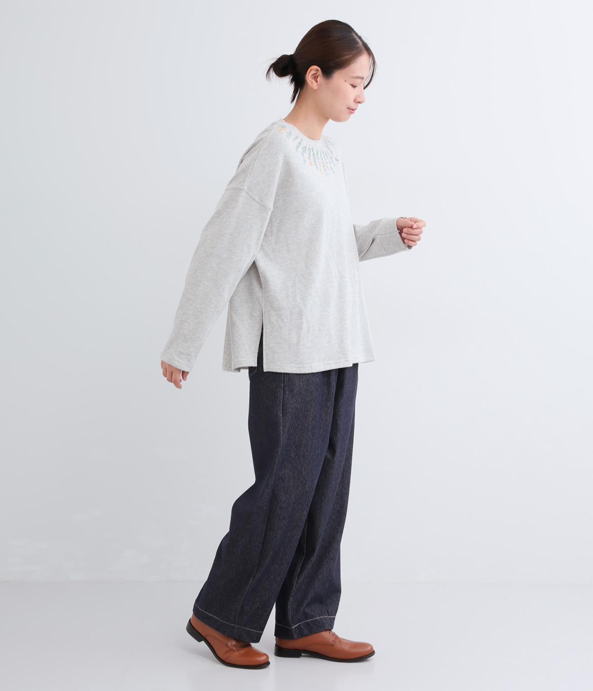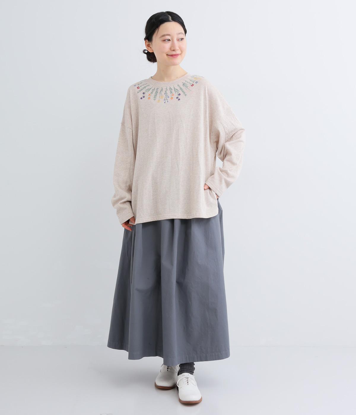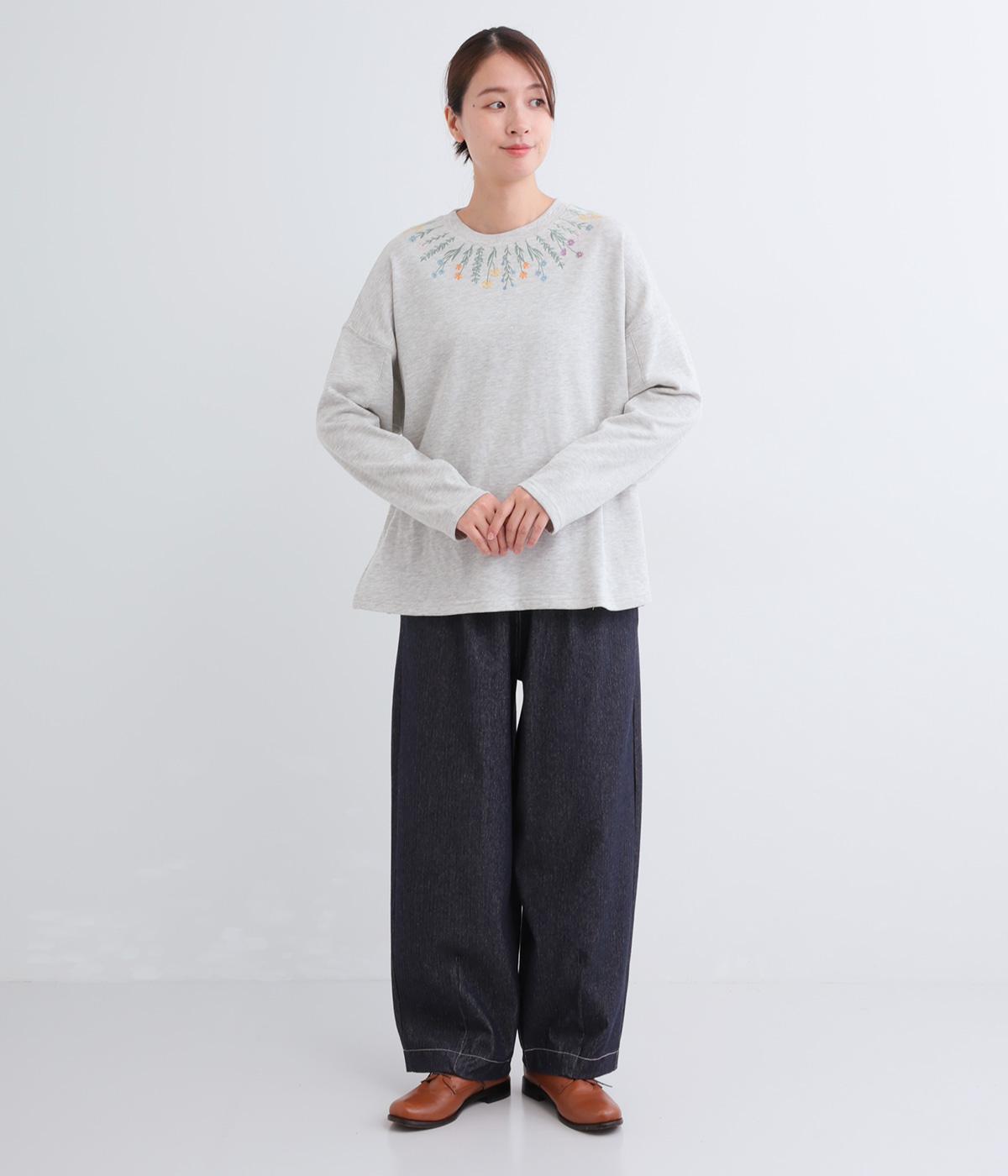杢調のニュアンスのある色味が大人の装いにしっくりなじみます。ゆったりしたシルエットでリラックス感のある着心地です。首元のお花刺しゅうがデザインポイントで、顔まわりを華やかに見せてくれます。