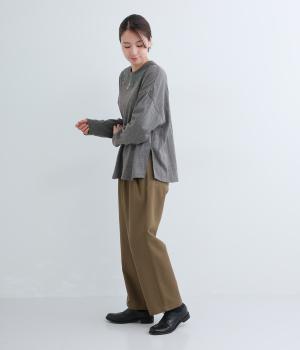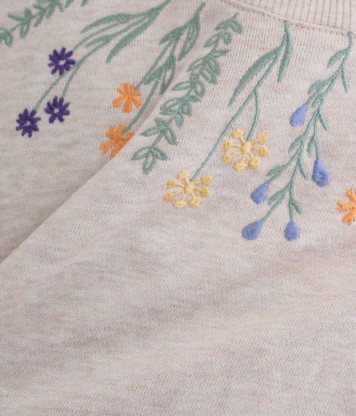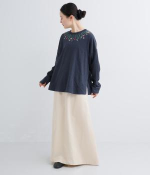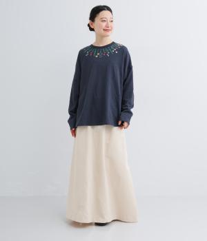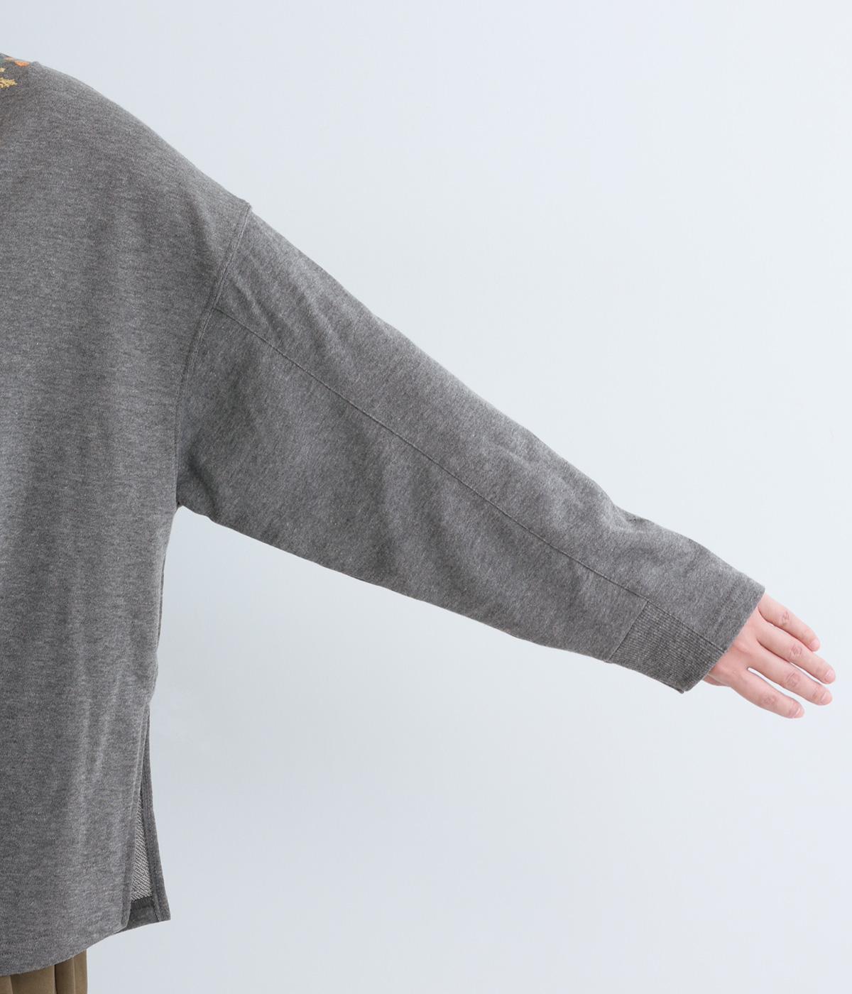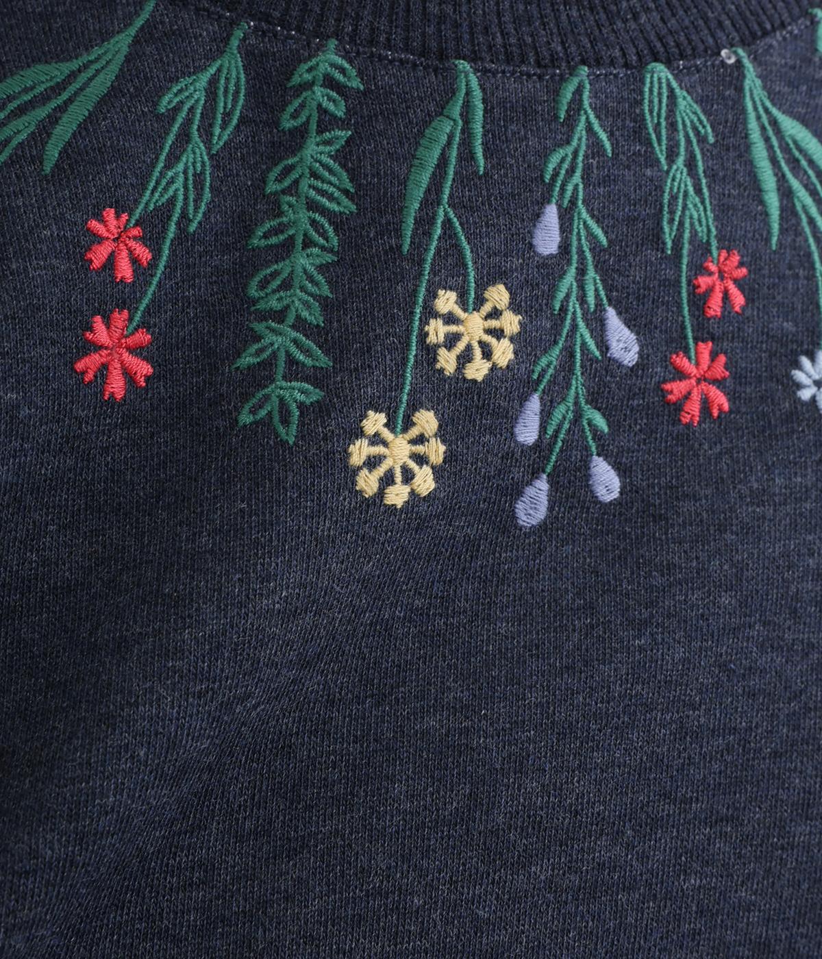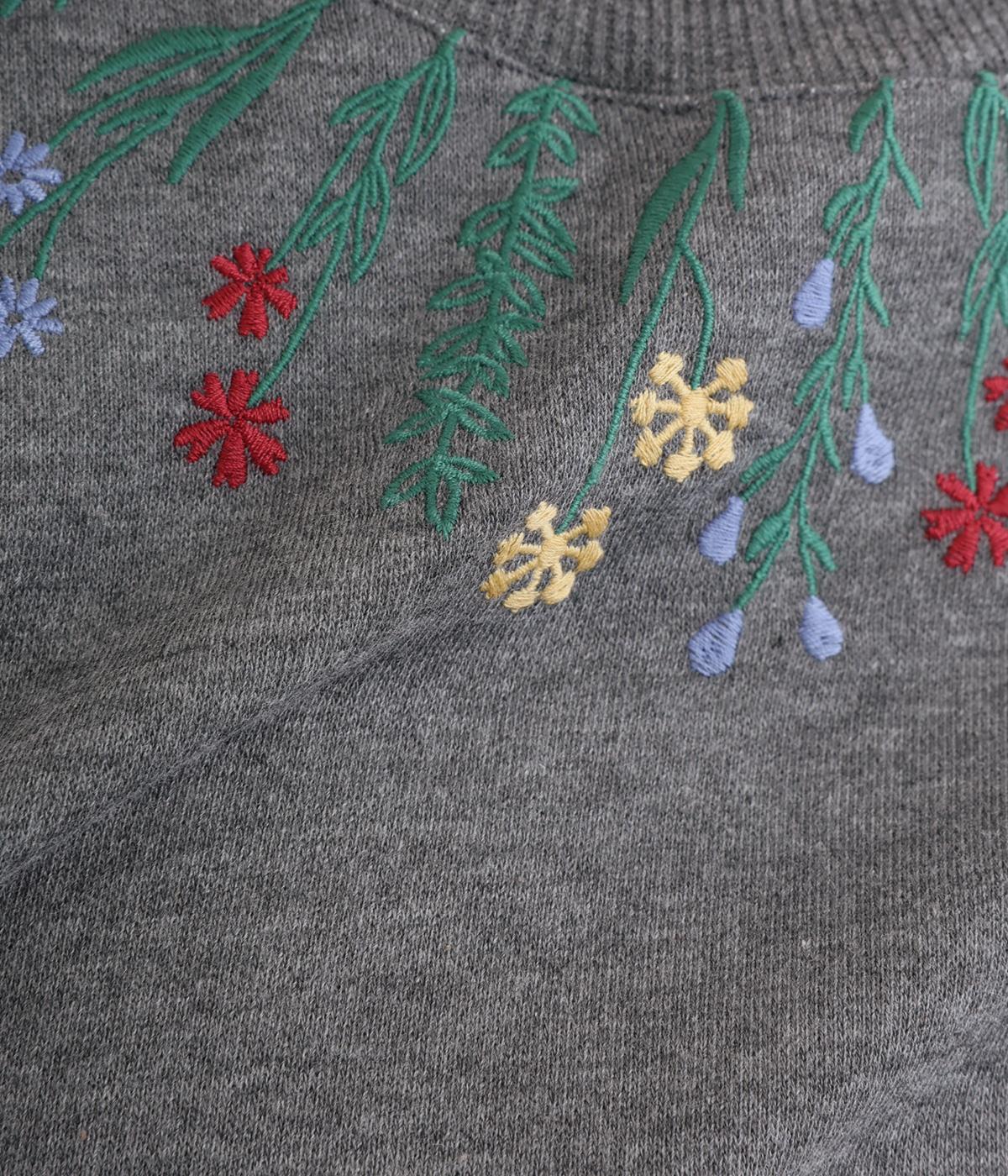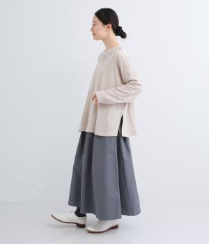 杢調のニュアンスのある色味が大人の装いにしっくりなじみます。ゆったりしたシルエットでリラックス感のある着心地です。首元のお花刺しゅうがデザインポイントで、顔まわりを華やかに見せてくれます。
