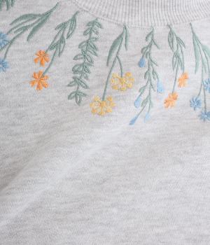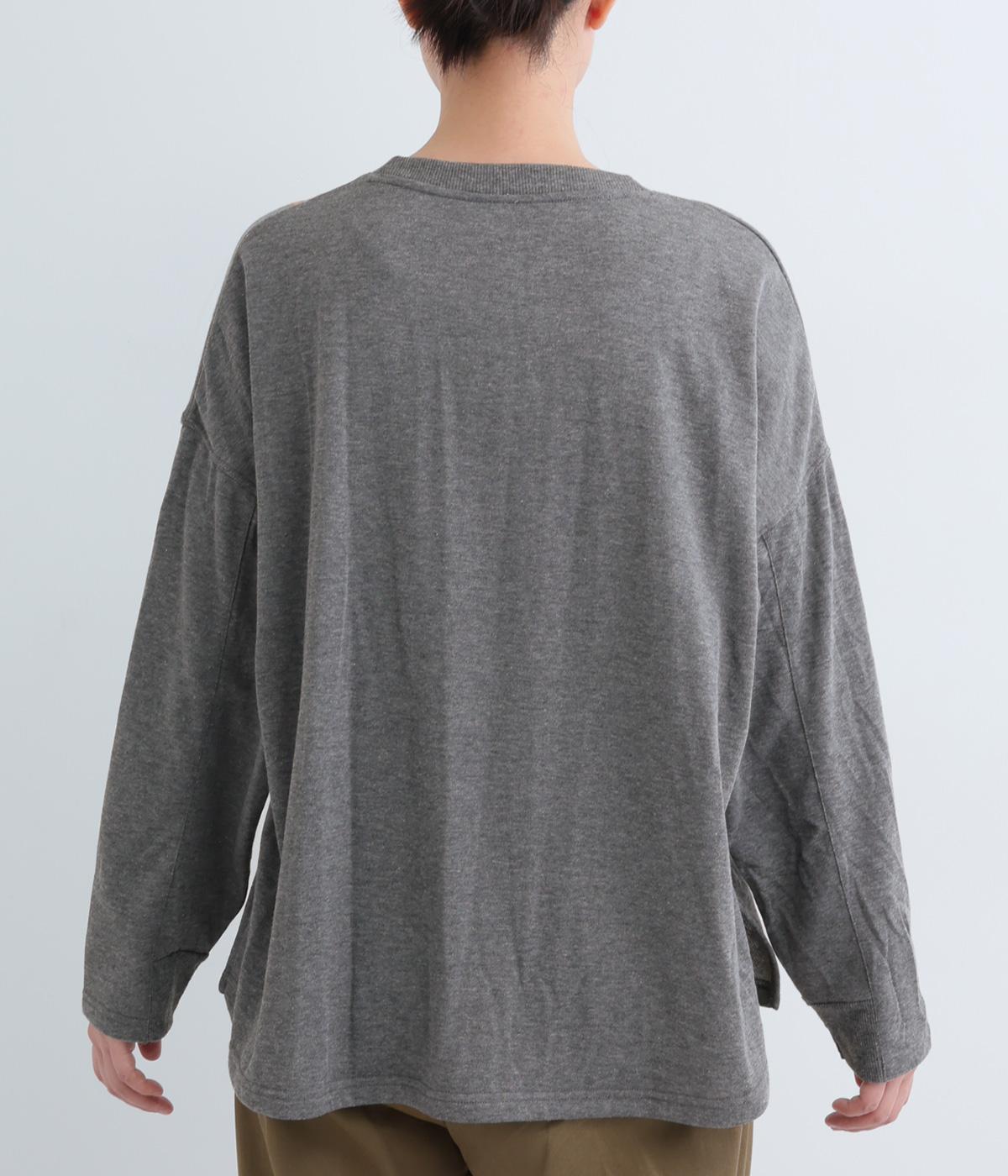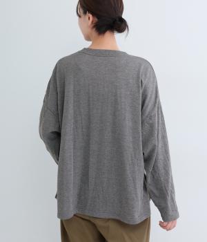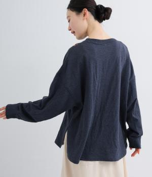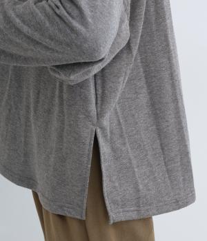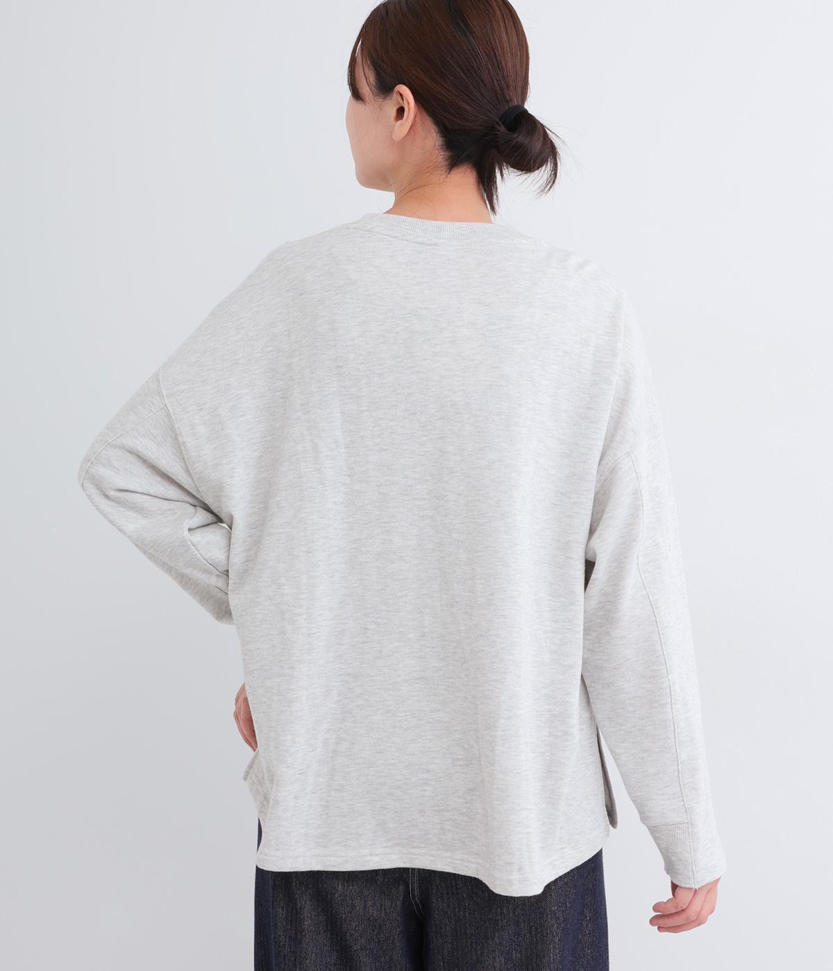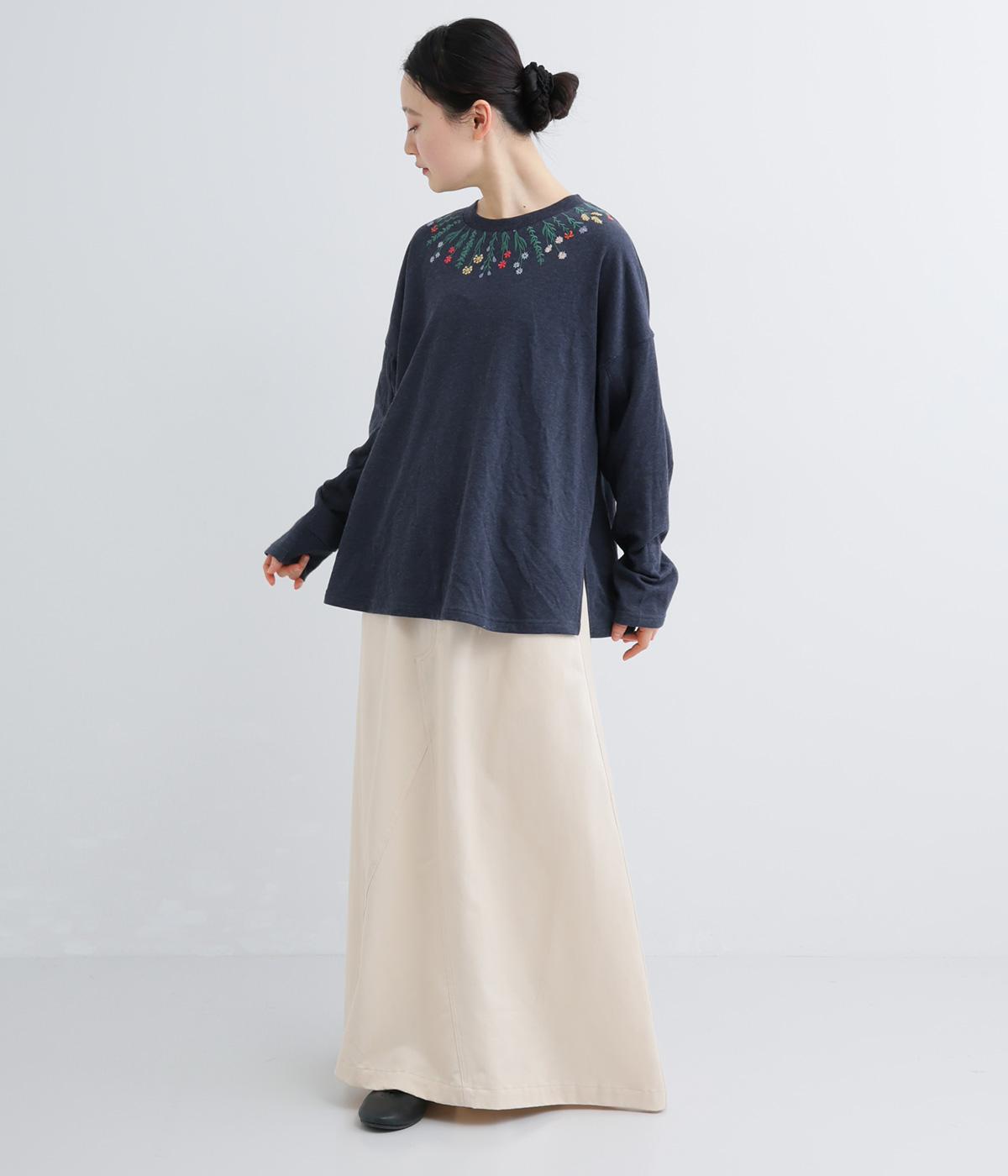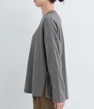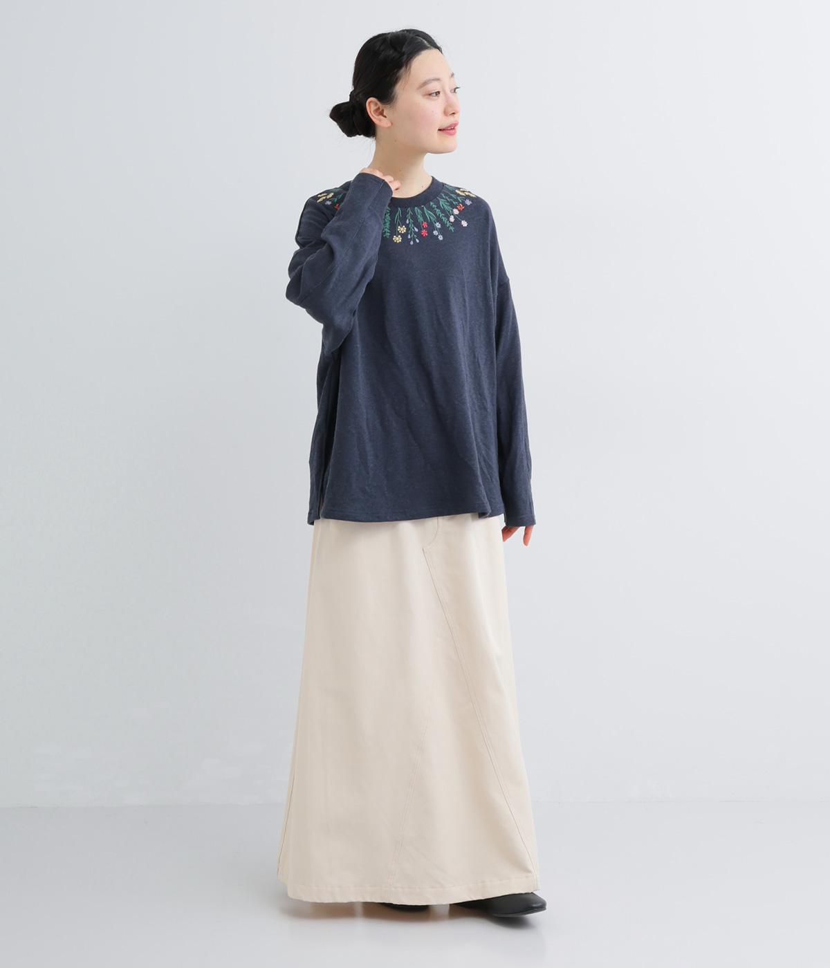 杢調のニュアンスのある色味が大人の装いにしっくりなじみます。ゆったりしたシルエットでリラックス感のある着心地です。首元のお花刺しゅうがデザインポイントで、顔まわりを華やかに見せてくれます。
