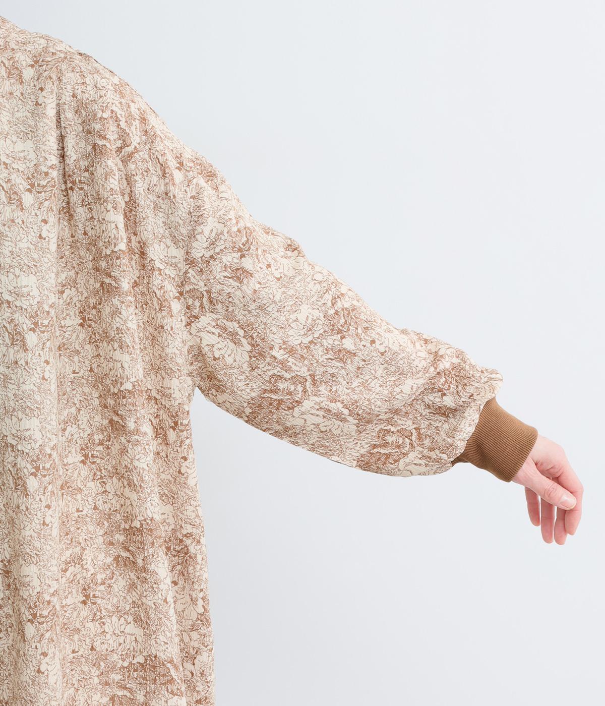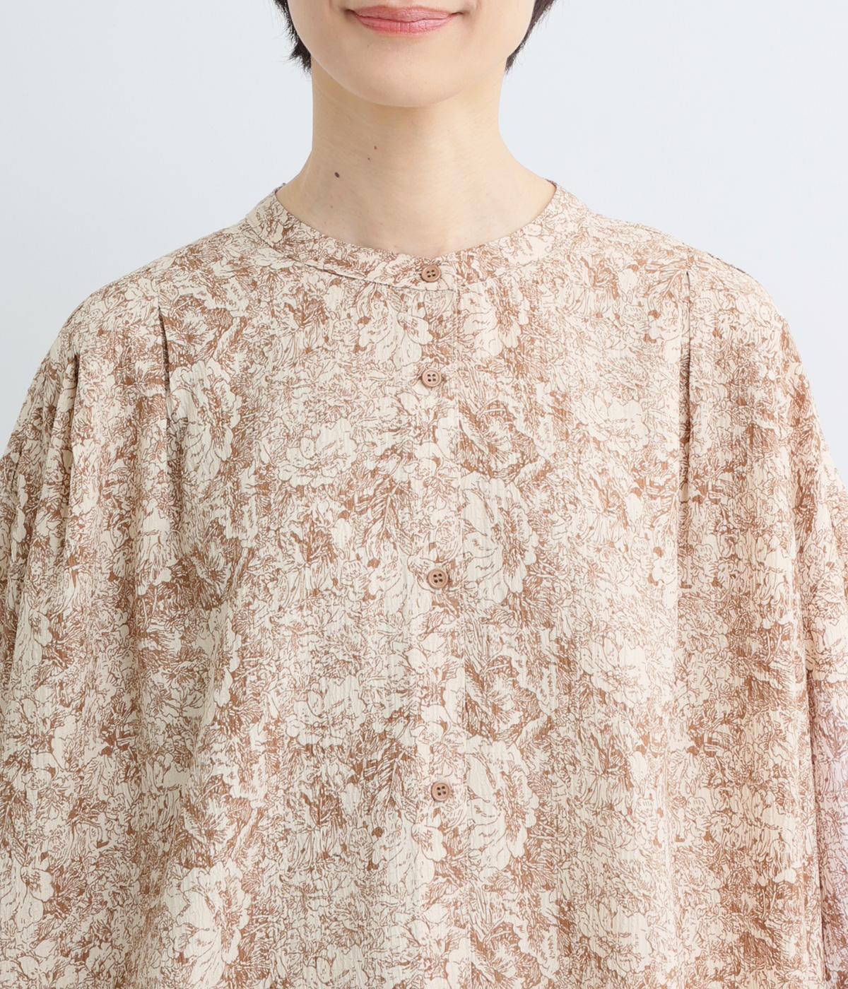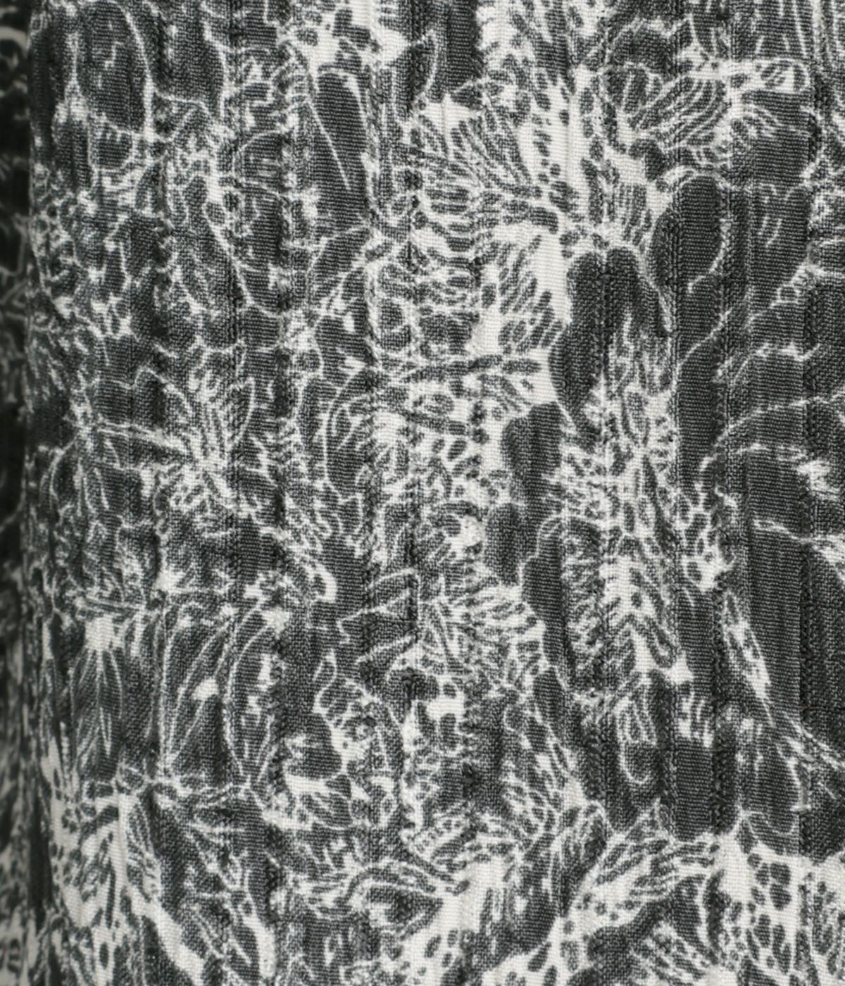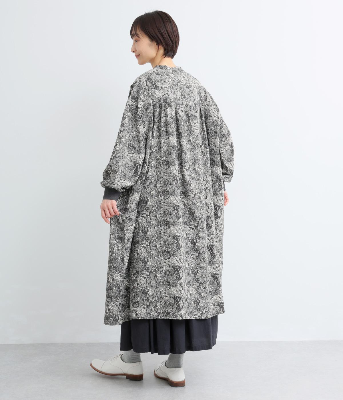 生地の風合いと細かな線で描かれた花柄が、落ち着いた雰囲気を演出します。ほどよいゆとりのあるシルエットは広がりすぎず、動くたびに優雅なラインを描きます。袖口にはリブを配し、甘い雰囲気にカジュアルさをプラスしました。