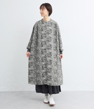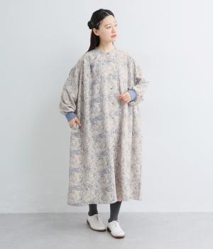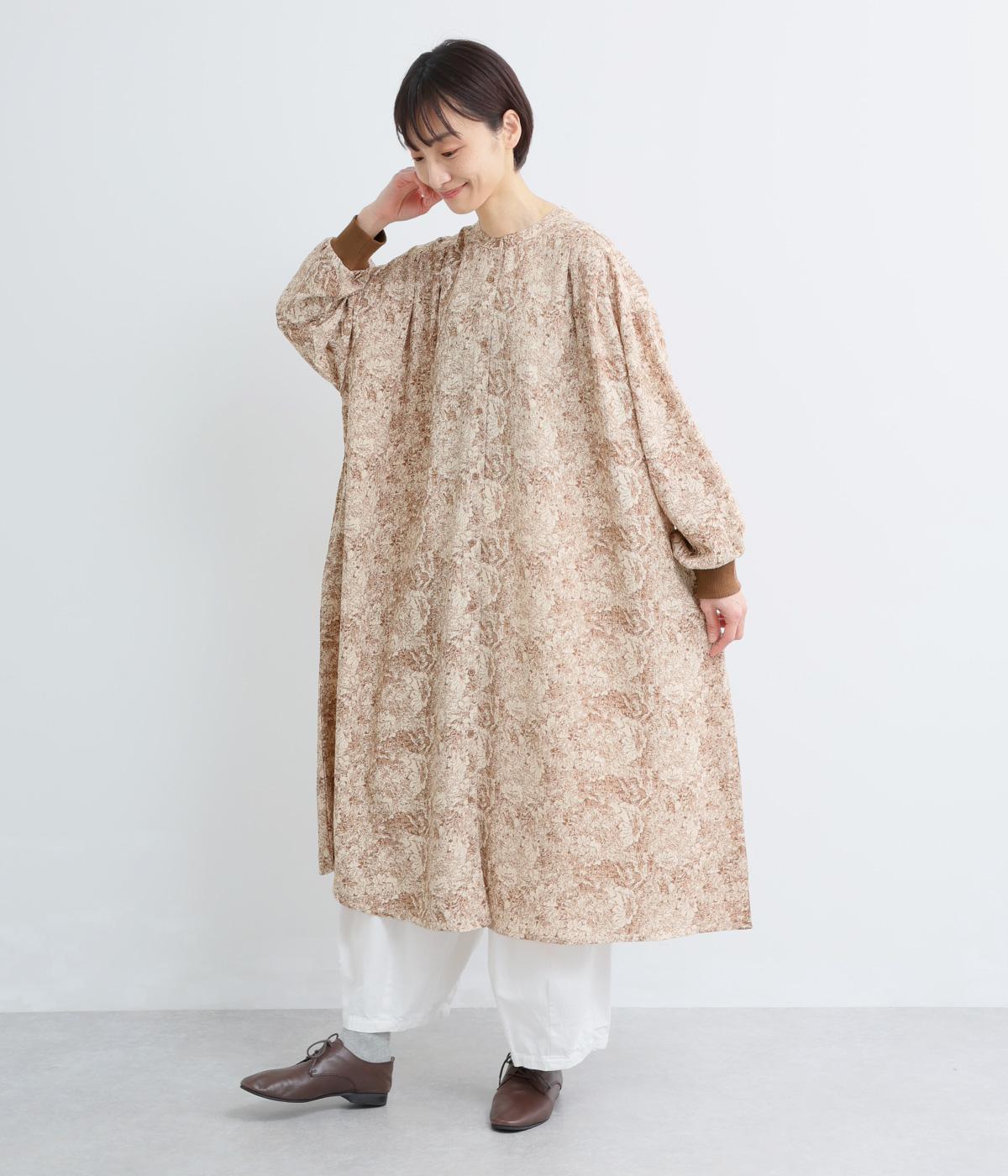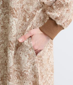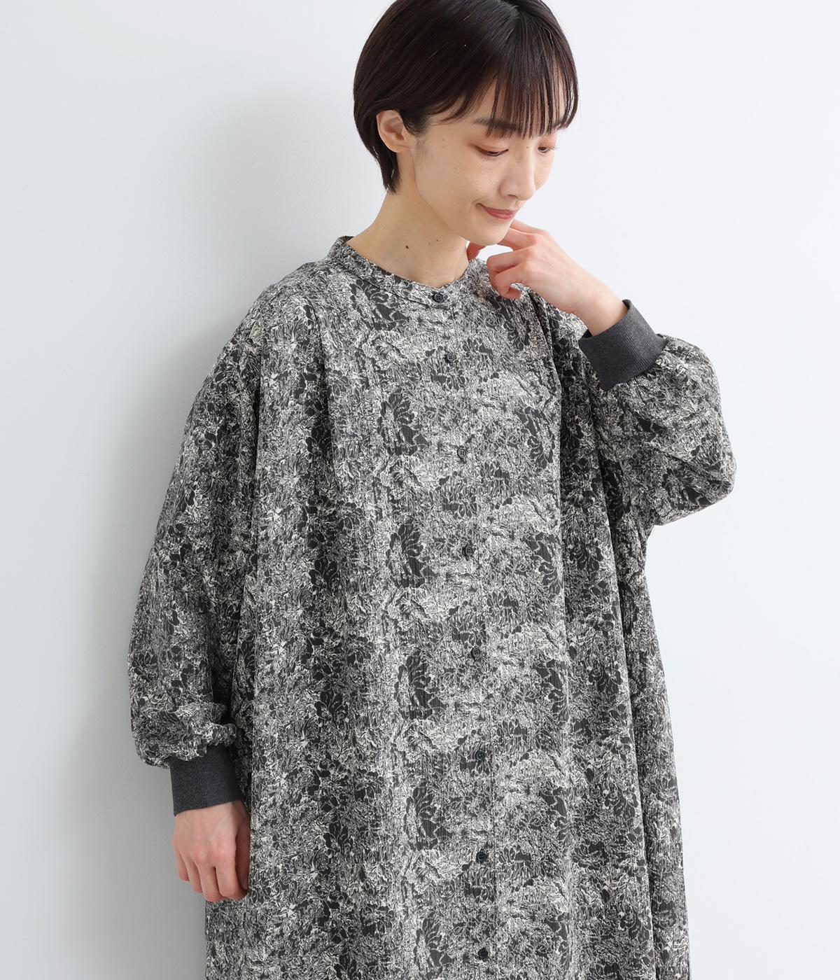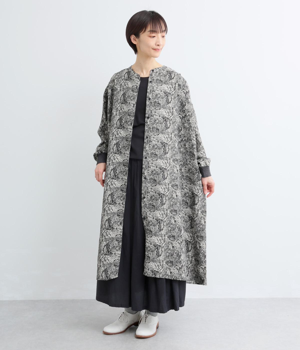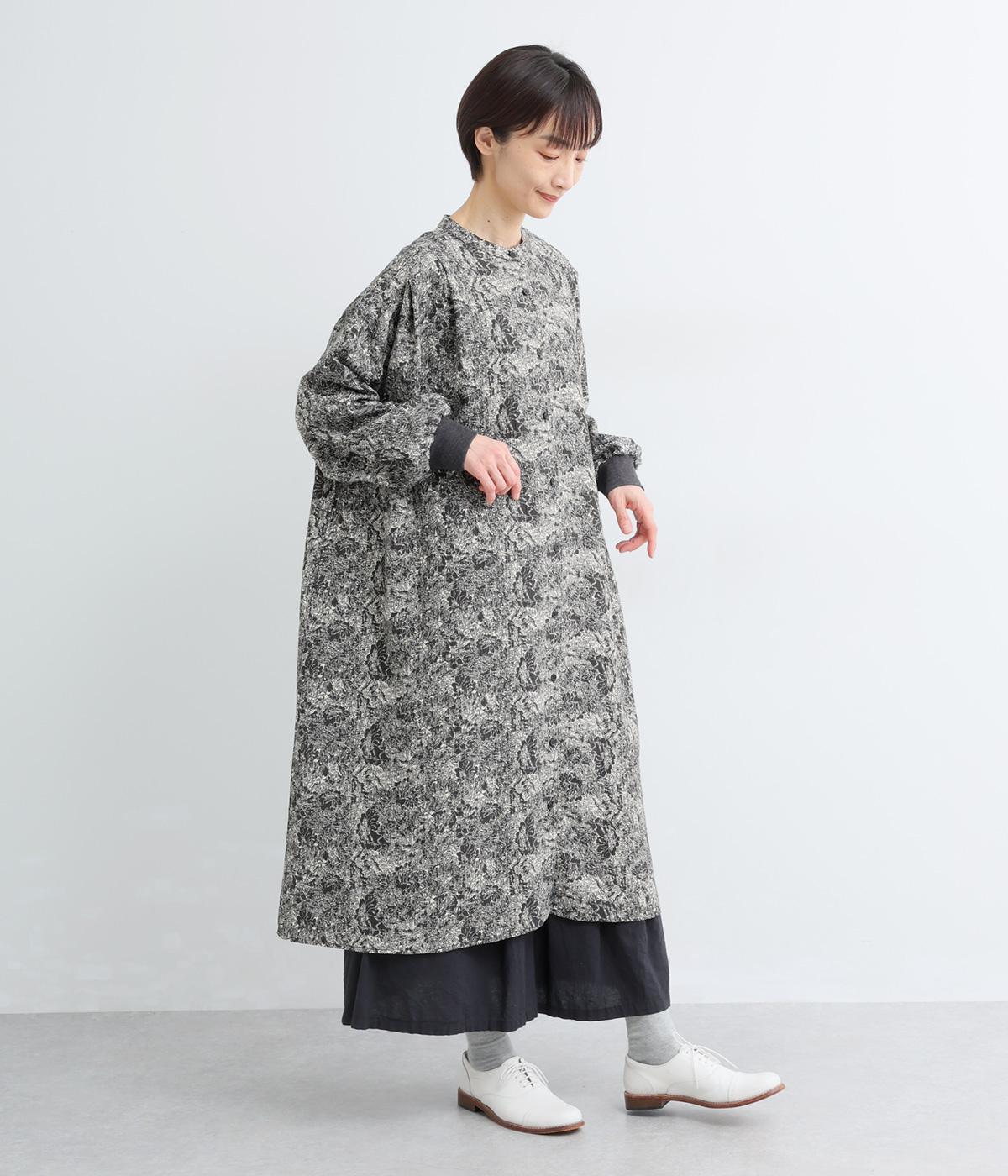 生地の風合いと細かな線で描かれた花柄が、落ち着いた雰囲気を演出します。ほどよいゆとりのあるシルエットは広がりすぎず、動くたびに優雅なラインを描きます。袖口にはリブを配し、甘い雰囲気にカジュアルさをプラスしました。