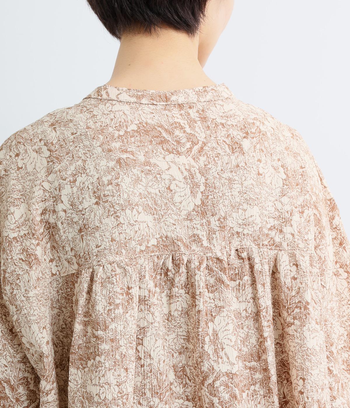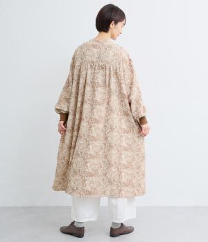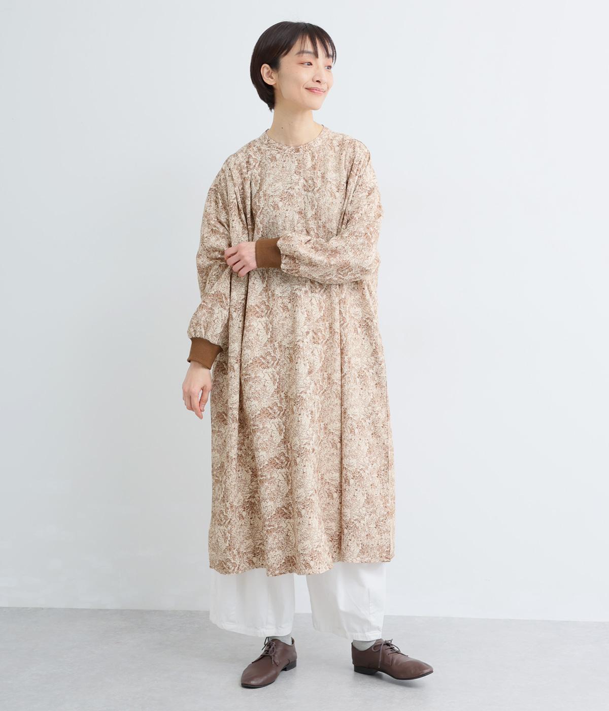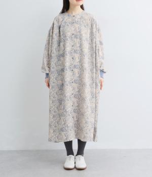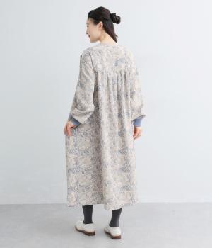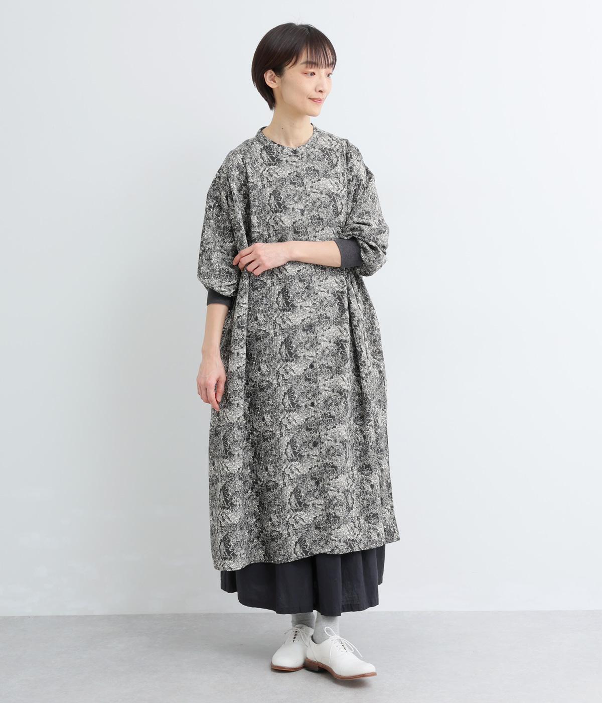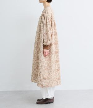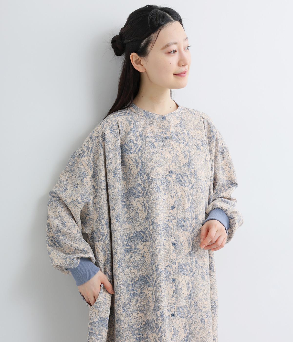 生地の風合いと細かな線で描かれた花柄が、落ち着いた雰囲気を演出します。ほどよいゆとりのあるシルエットは広がりすぎず、動くたびに優雅なラインを描きます。袖口にはリブを配し、甘い雰囲気にカジュアルさをプラスしました。
