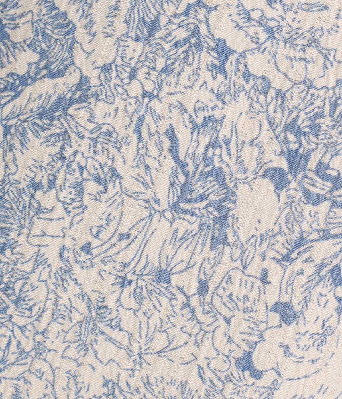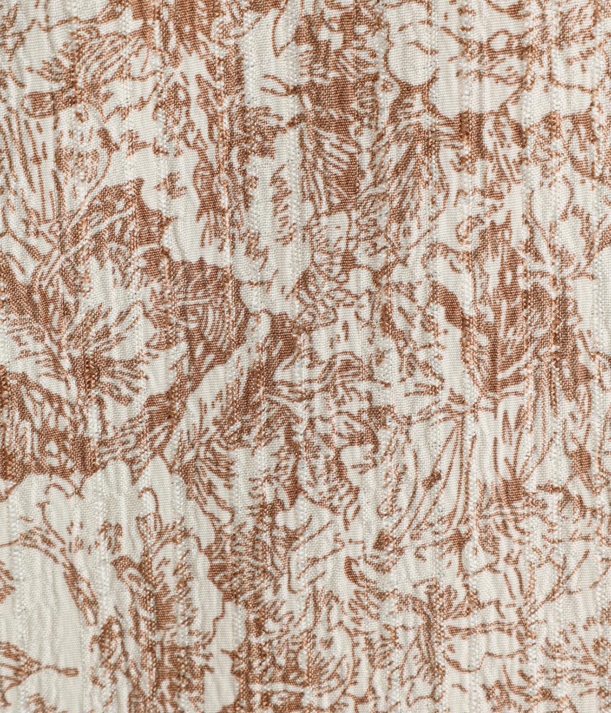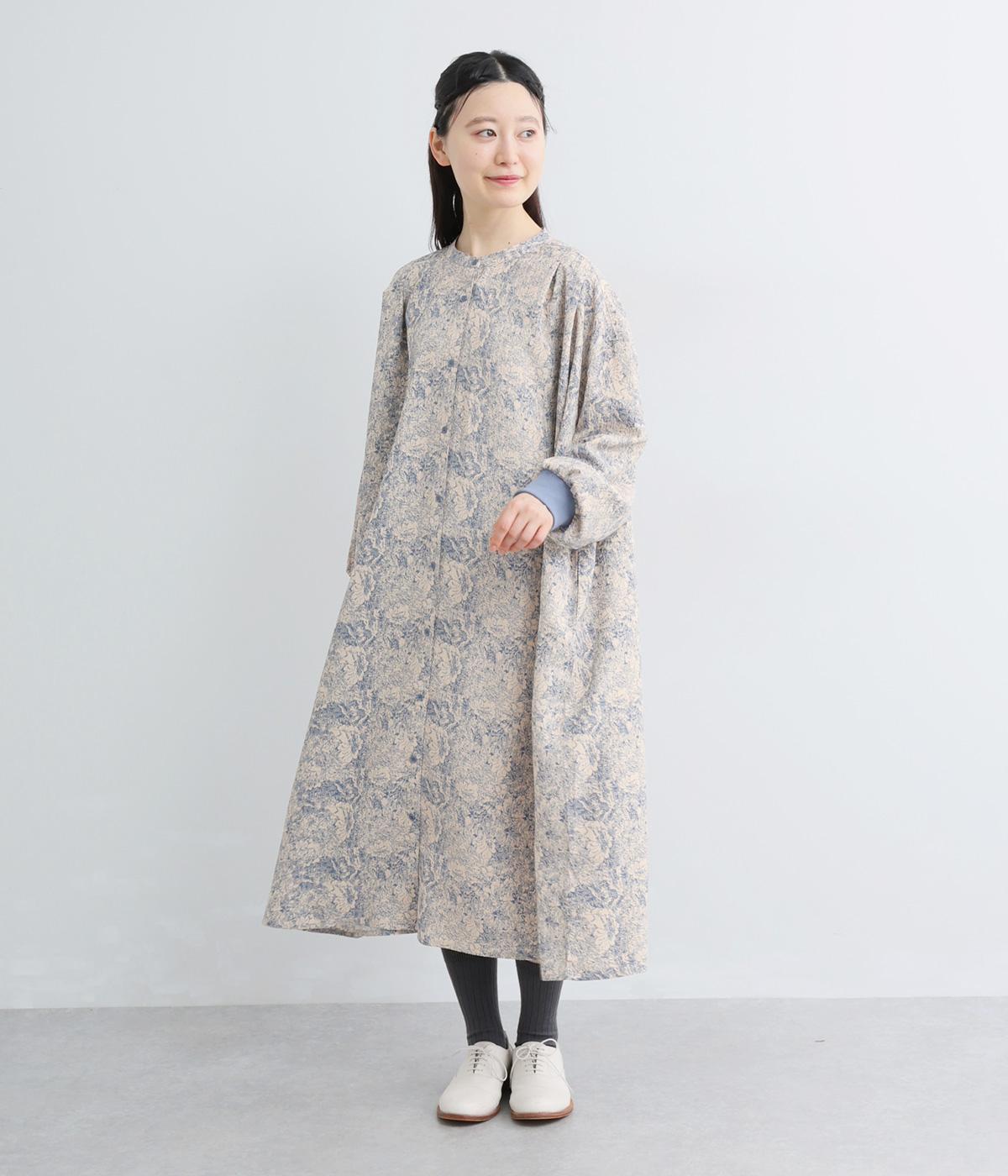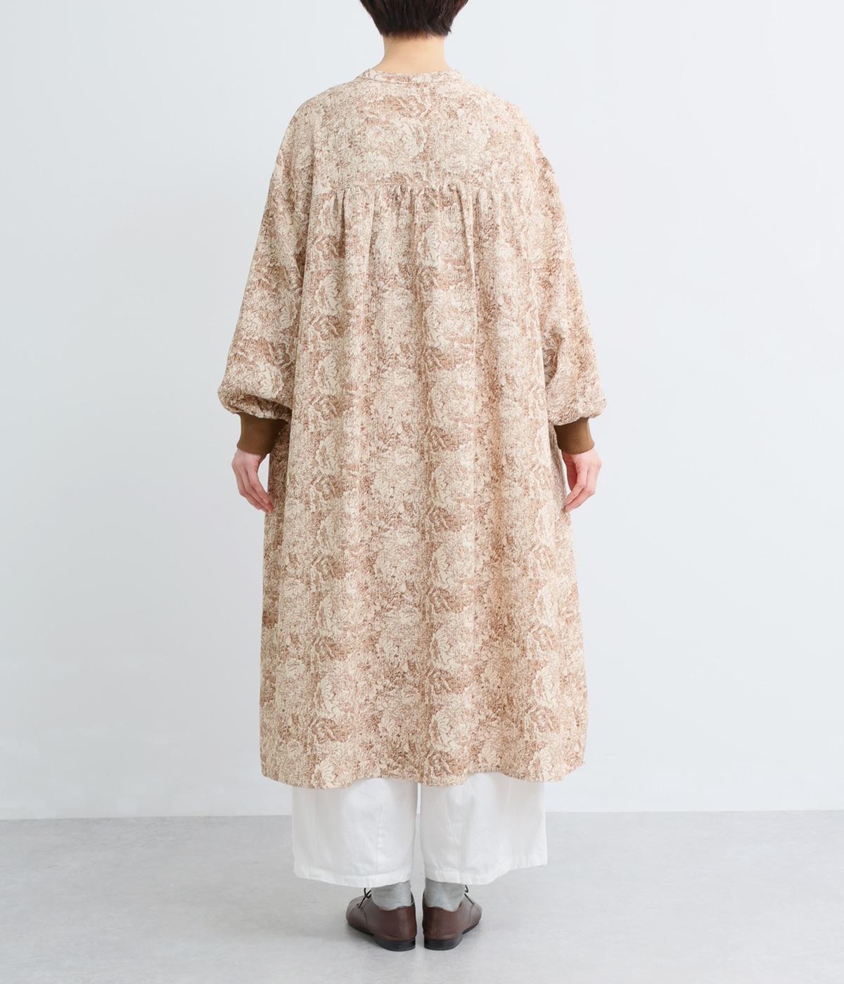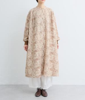 生地の風合いと細かな線で描かれた花柄が、落ち着いた雰囲気を演出します。ほどよいゆとりのあるシルエットは広がりすぎず、動くたびに優雅なラインを描きます。袖口にはリブを配し、甘い雰囲気にカジュアルさをプラスしました。
