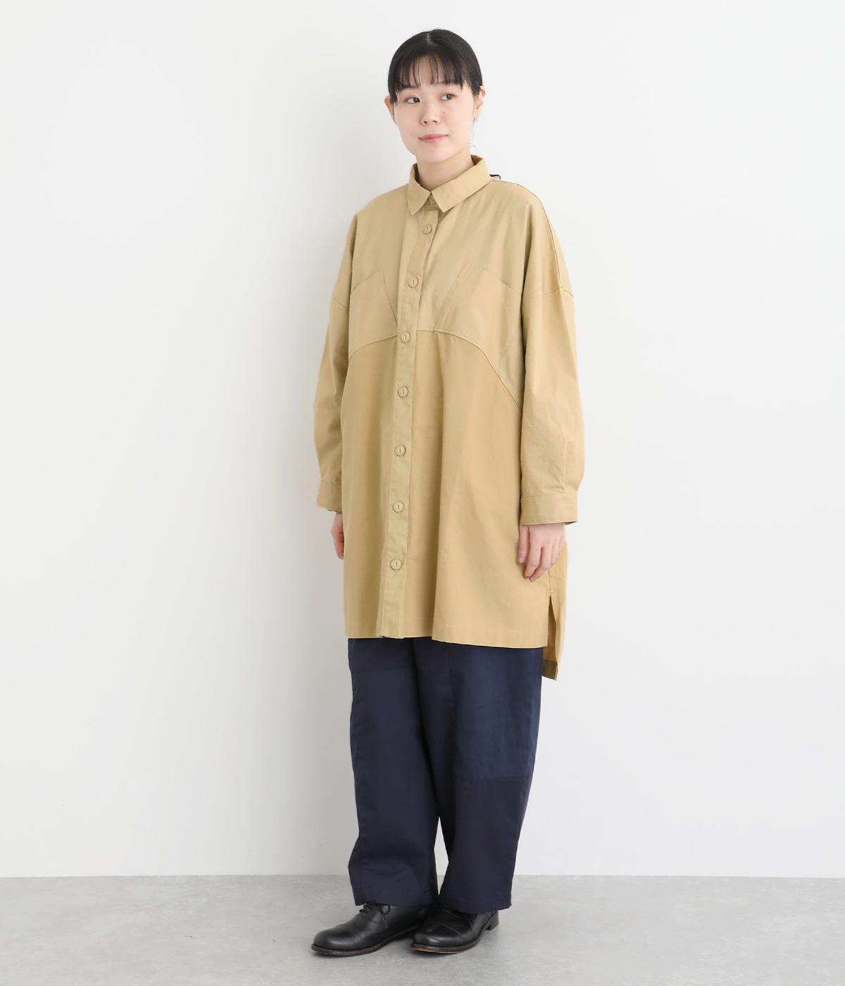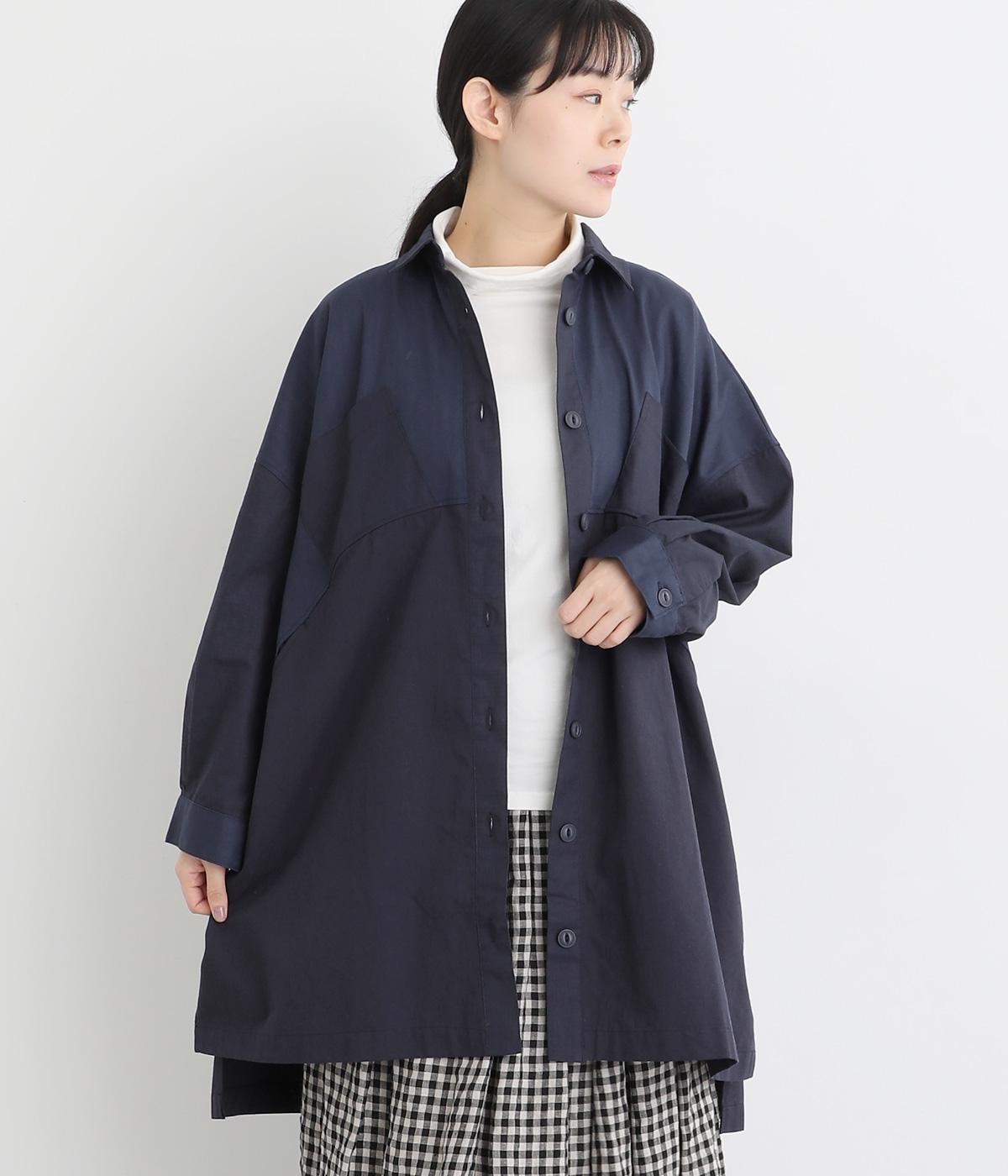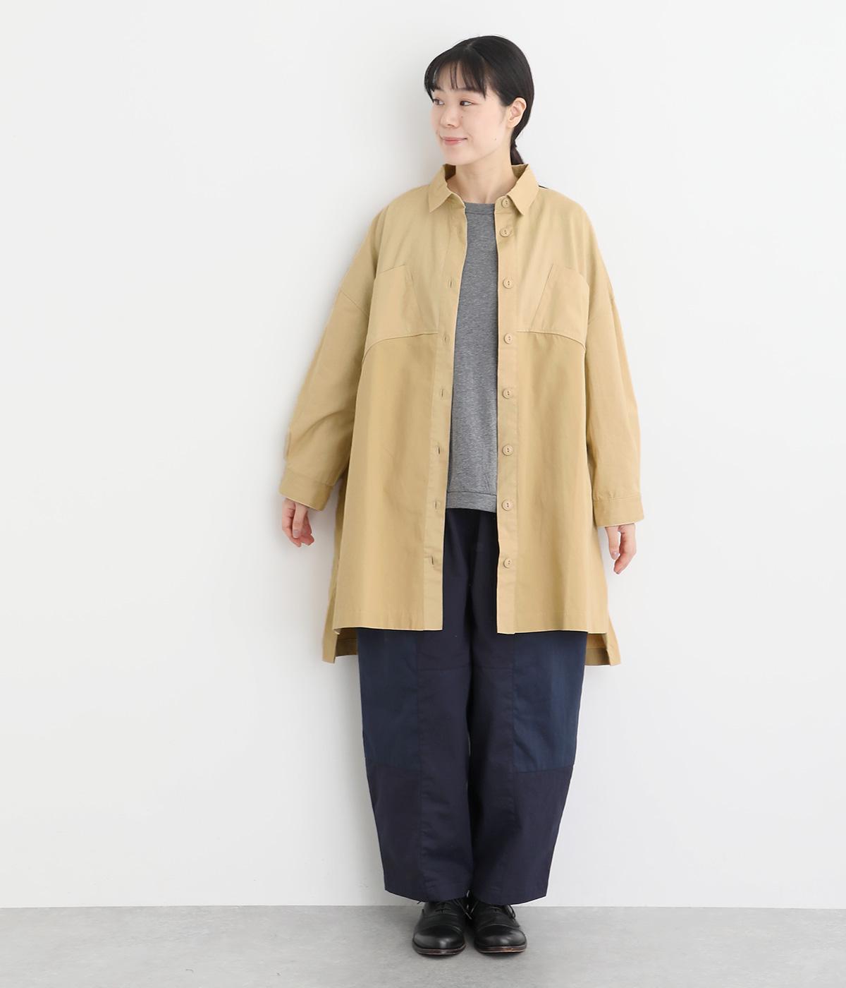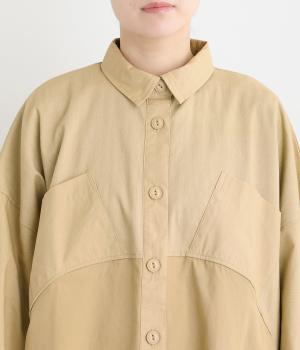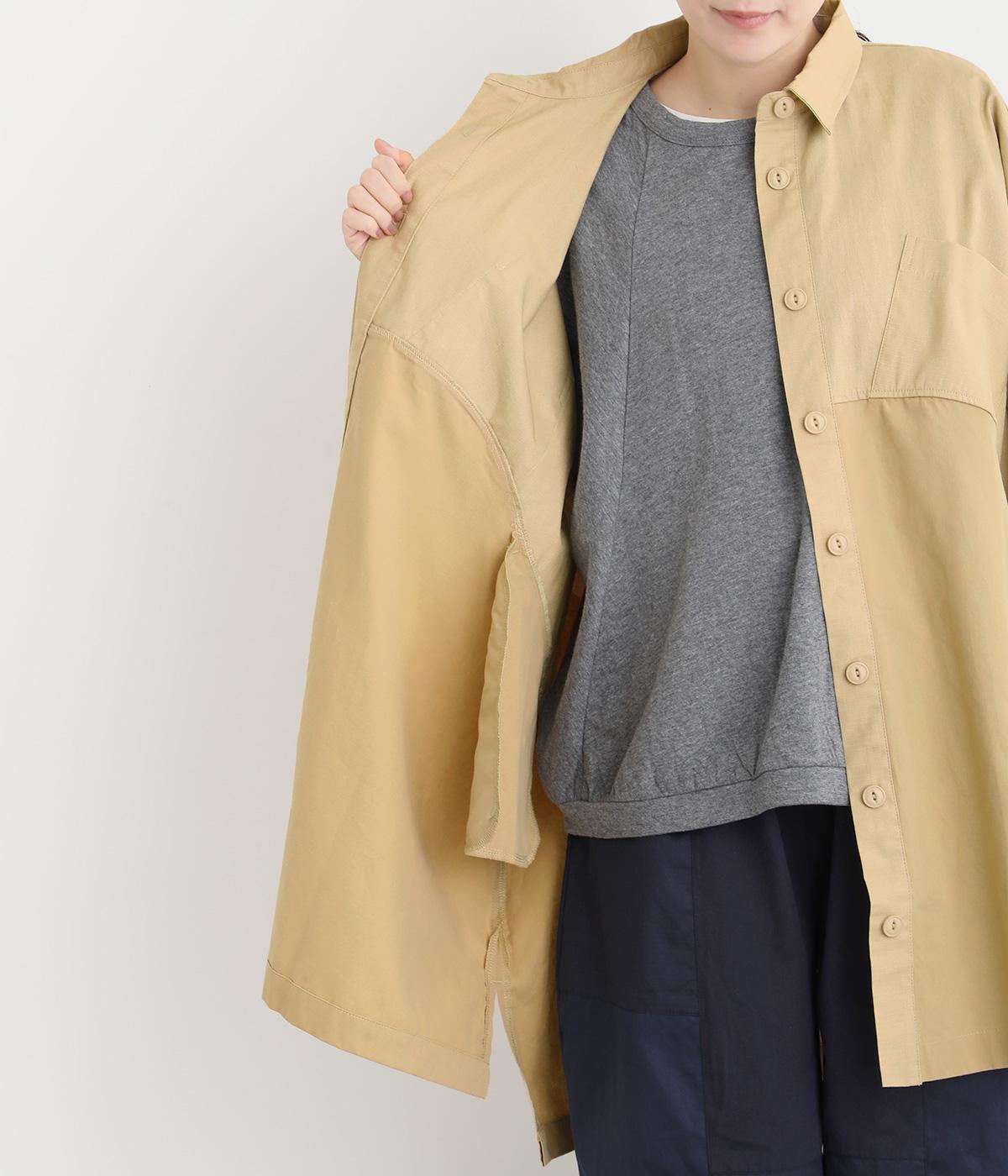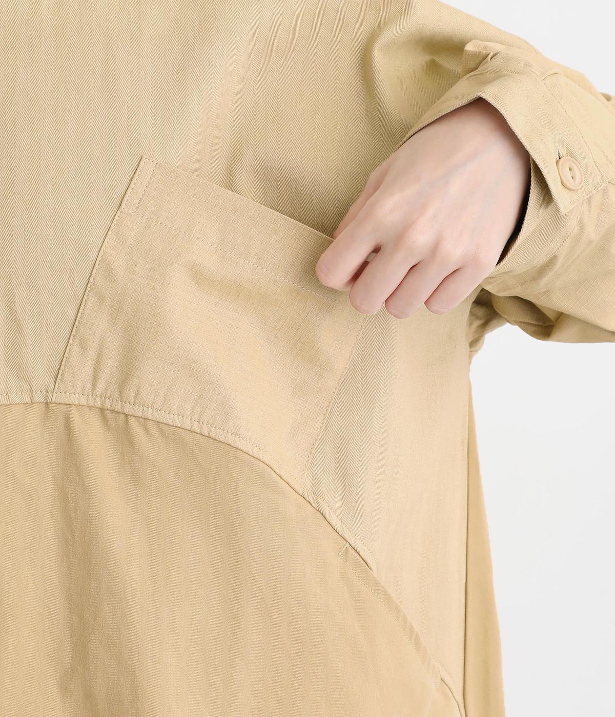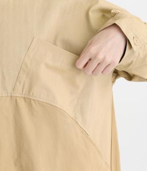 ワークテイストなシャツは羽織り使いもできるよう、オーバーサイズに仕上げました。異素材切り替えでさり気なく表情をつけつつ、同色系にまとめて大人な雰囲気に。曲線に沿ったポケットなど、ディテールに遊び心が感じられるデザインです。