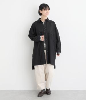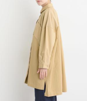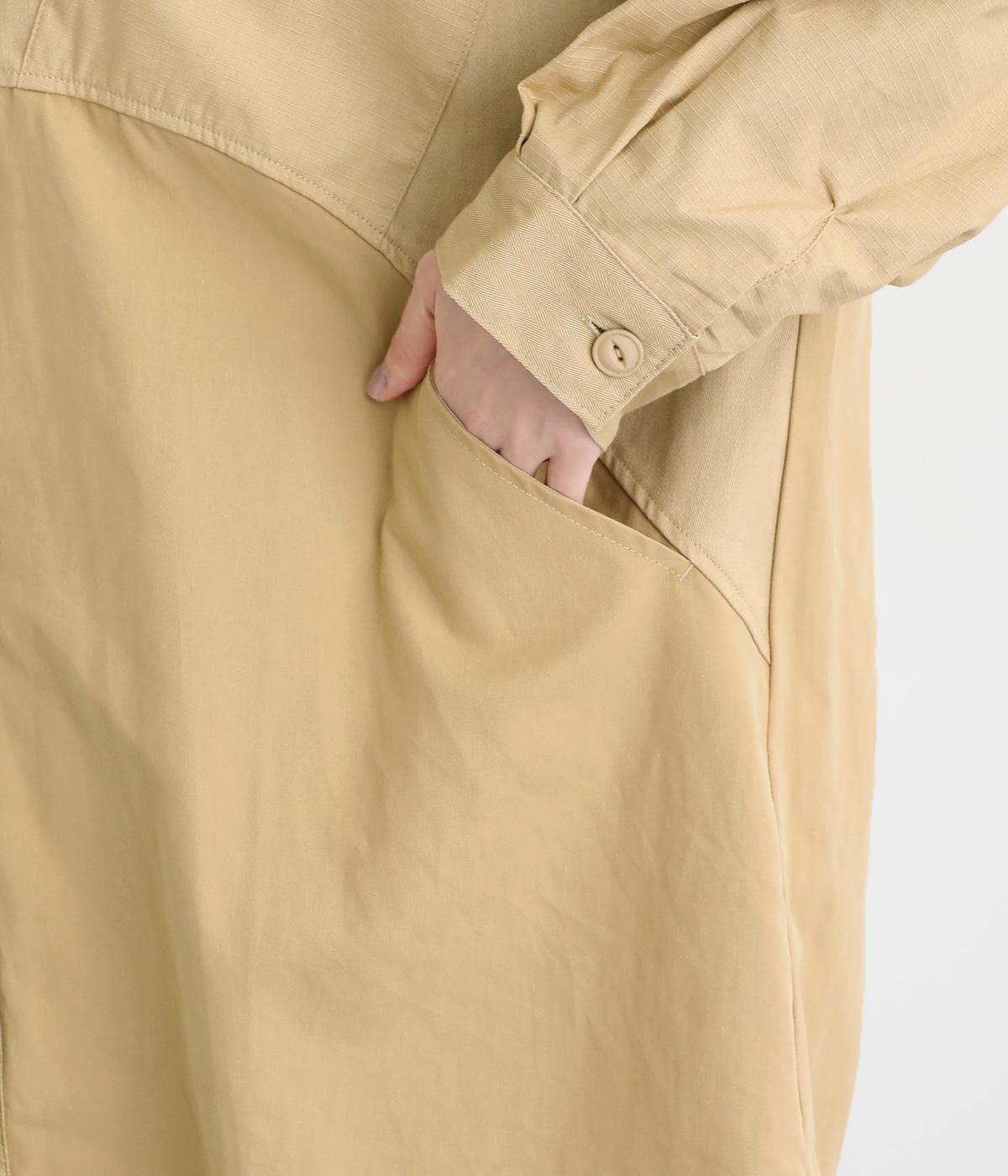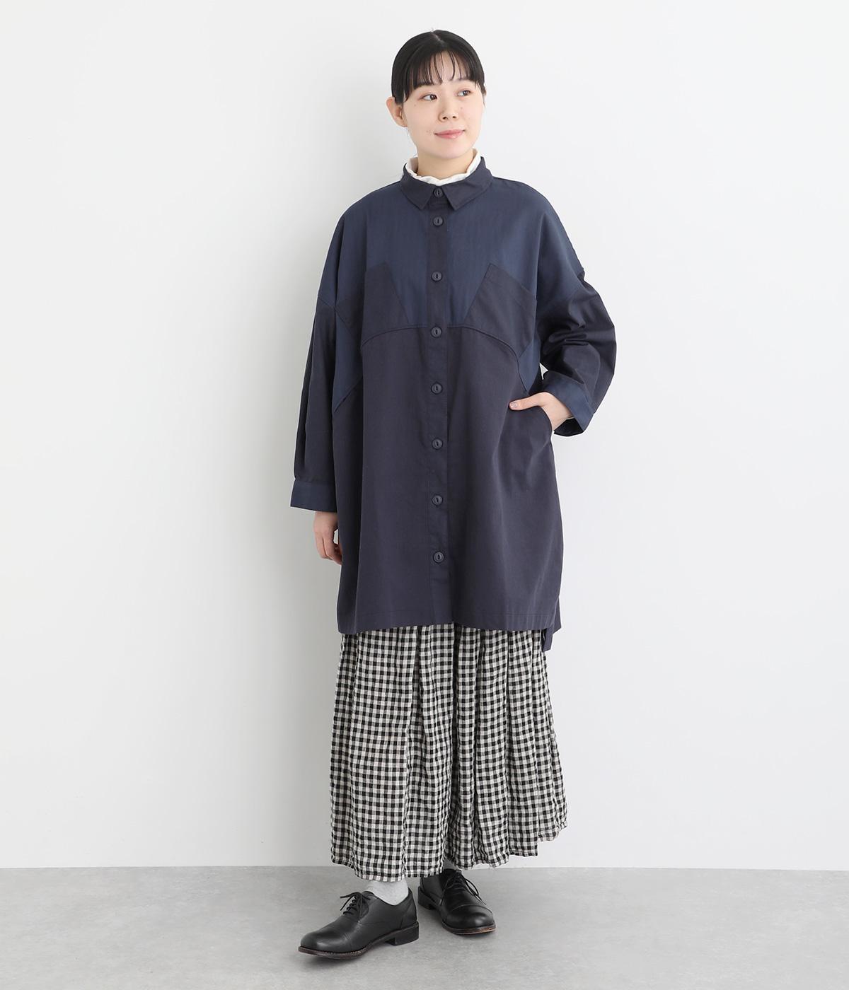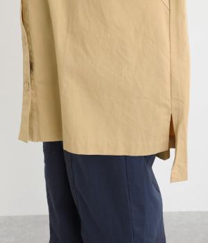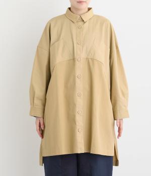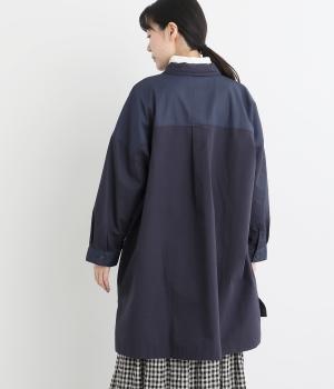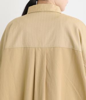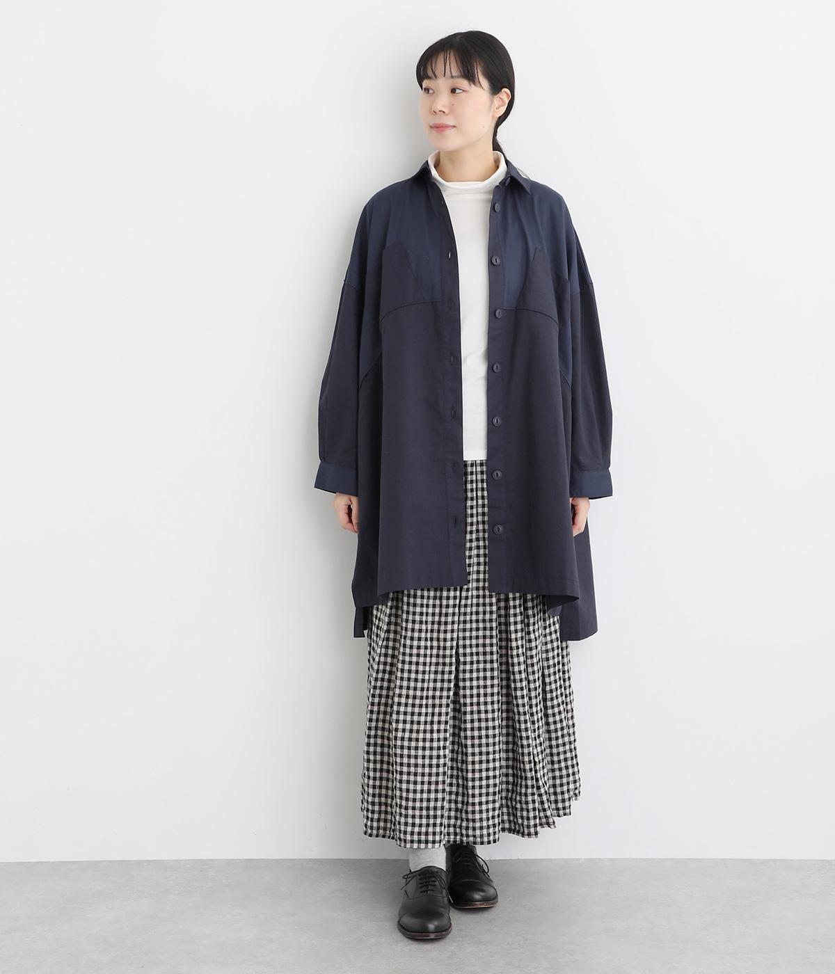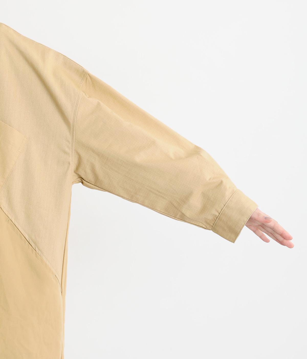 ワークテイストなシャツは羽織り使いもできるよう、オーバーサイズに仕上げました。異素材切り替えでさり気なく表情をつけつつ、同色系にまとめて大人な雰囲気に。曲線に沿ったポケットなど、ディテールに遊び心が感じられるデザインです。