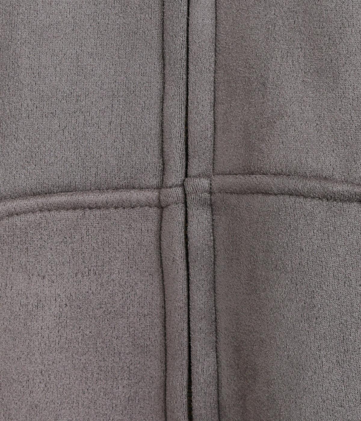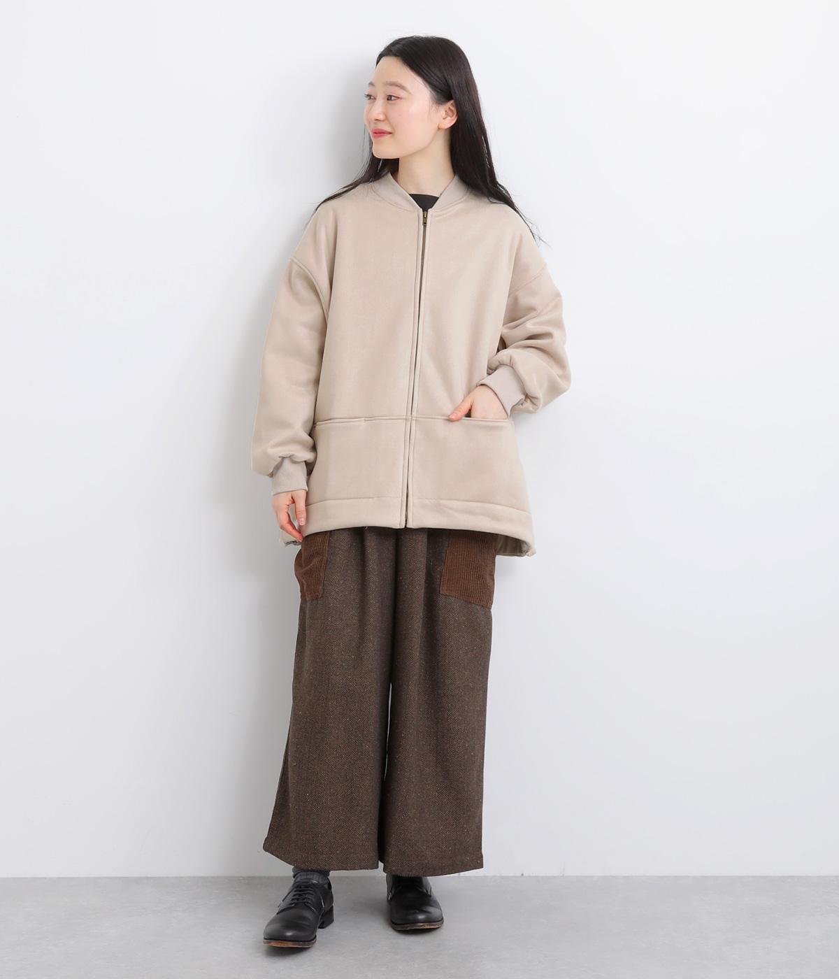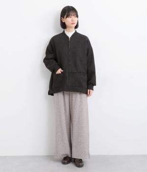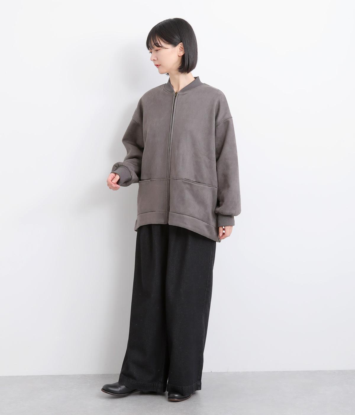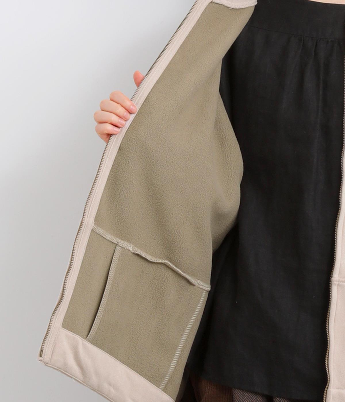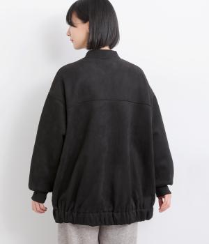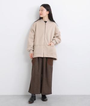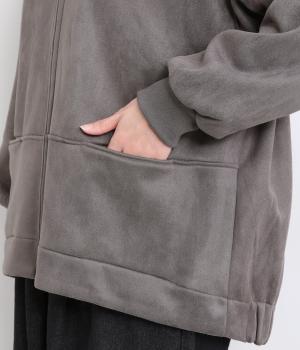 表側はフェイクスエードならではの微起毛がなめらかで、しっとりとした手ざわりが魅力。光の当たり方でやわらかな陰影が生まれ、上品な表情を見せます。裏地には、ふんわりとあたたかなフリースを重ねました。軽さもありつつほどよいハリで、シルエットがきれいにきまる素材です。