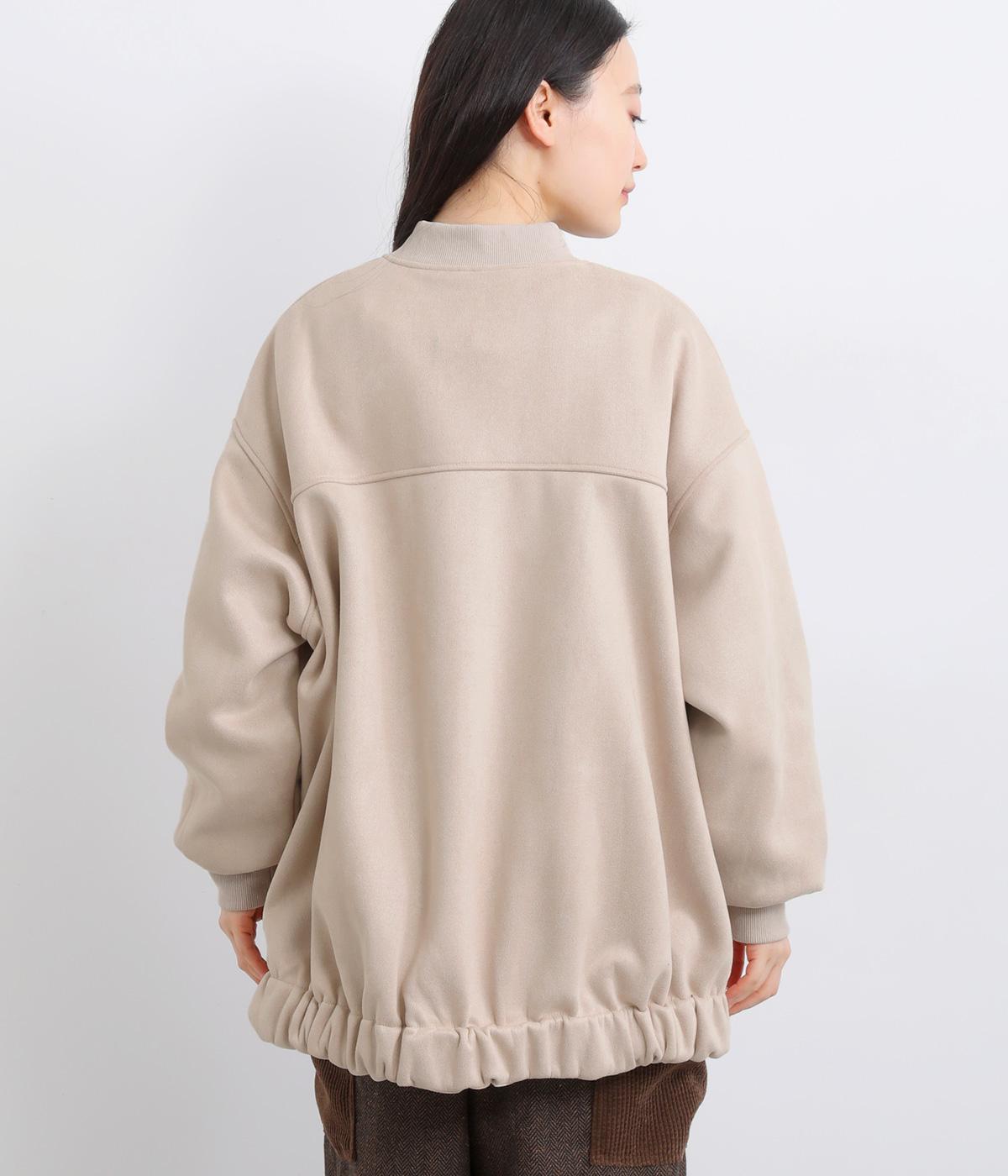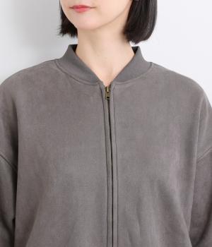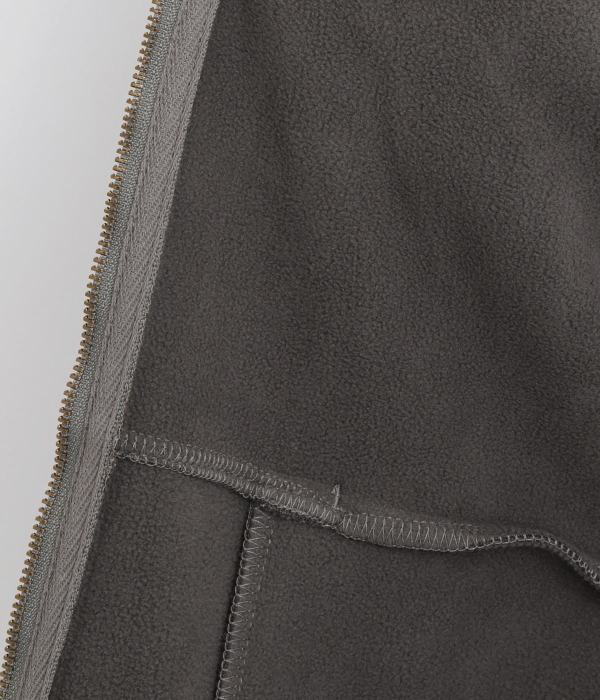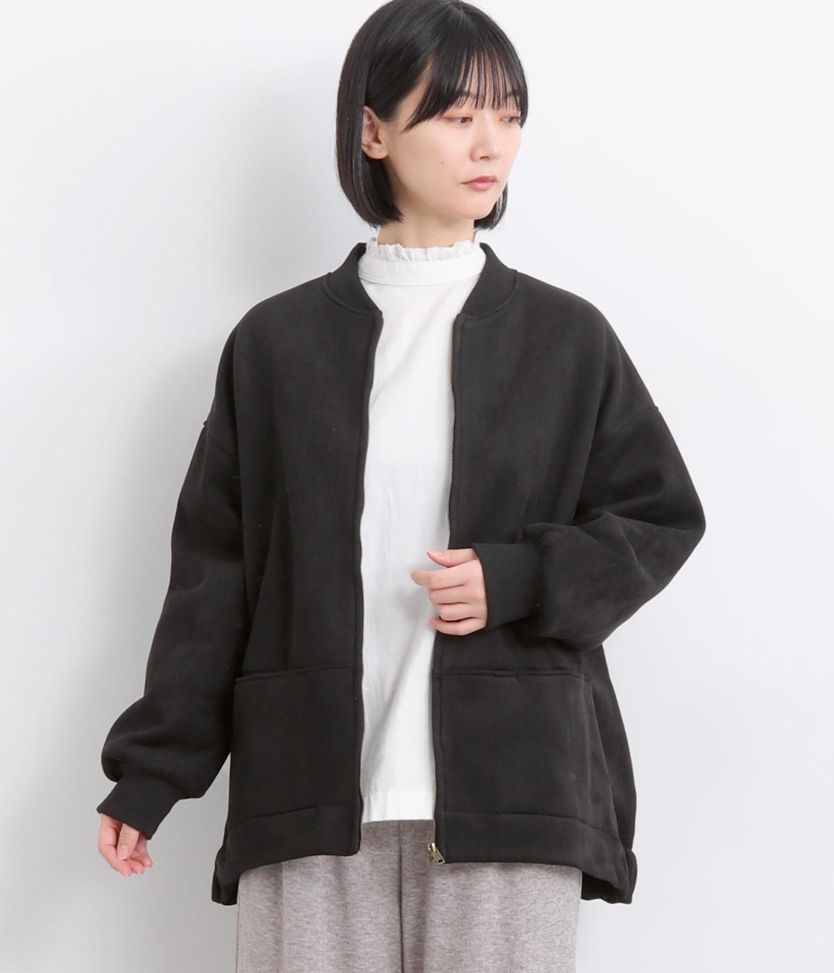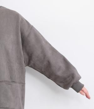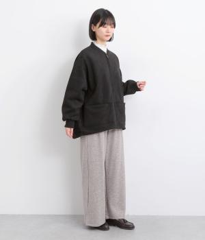 表側はフェイクスエードならではの微起毛がなめらかで、しっとりとした手ざわりが魅力。光の当たり方でやわらかな陰影が生まれ、上品な表情を見せます。裏地には、ふんわりとあたたかなフリースを重ねました。軽さもありつつほどよいハリで、シルエットがきれいにきまる素材です。