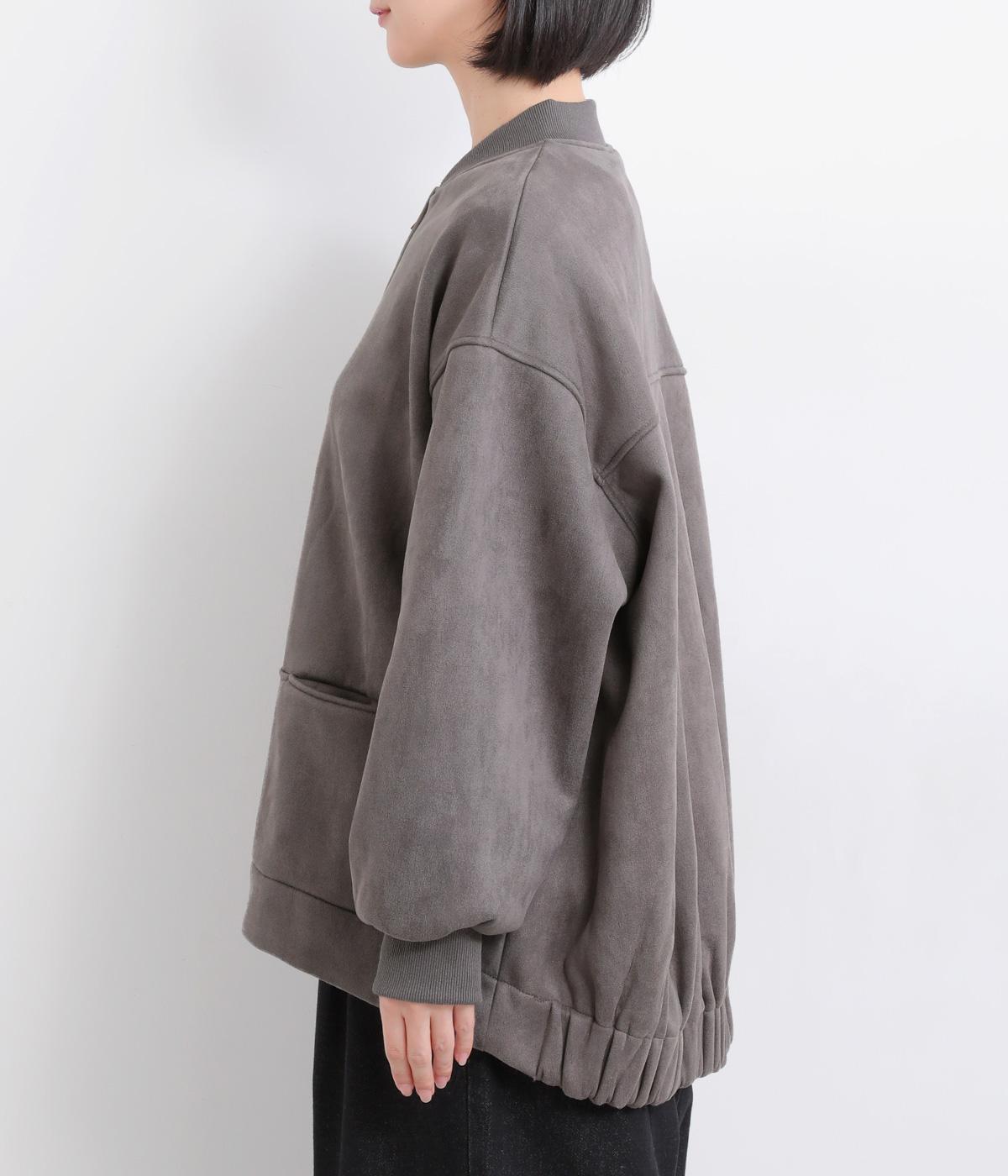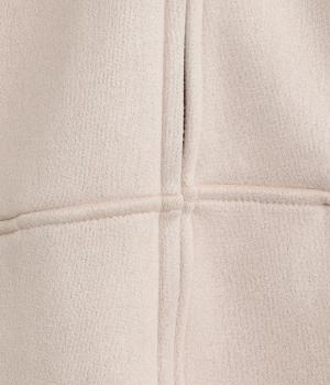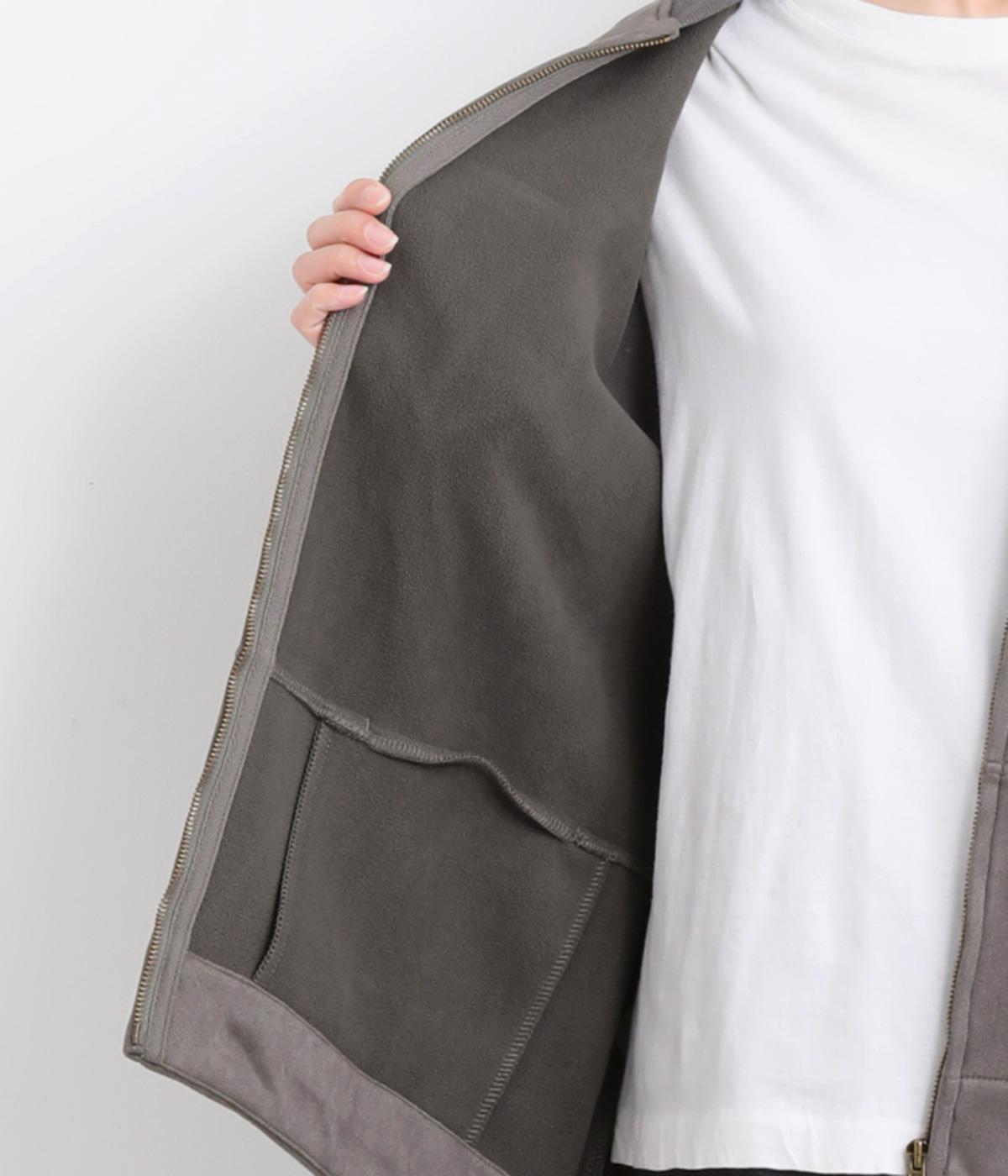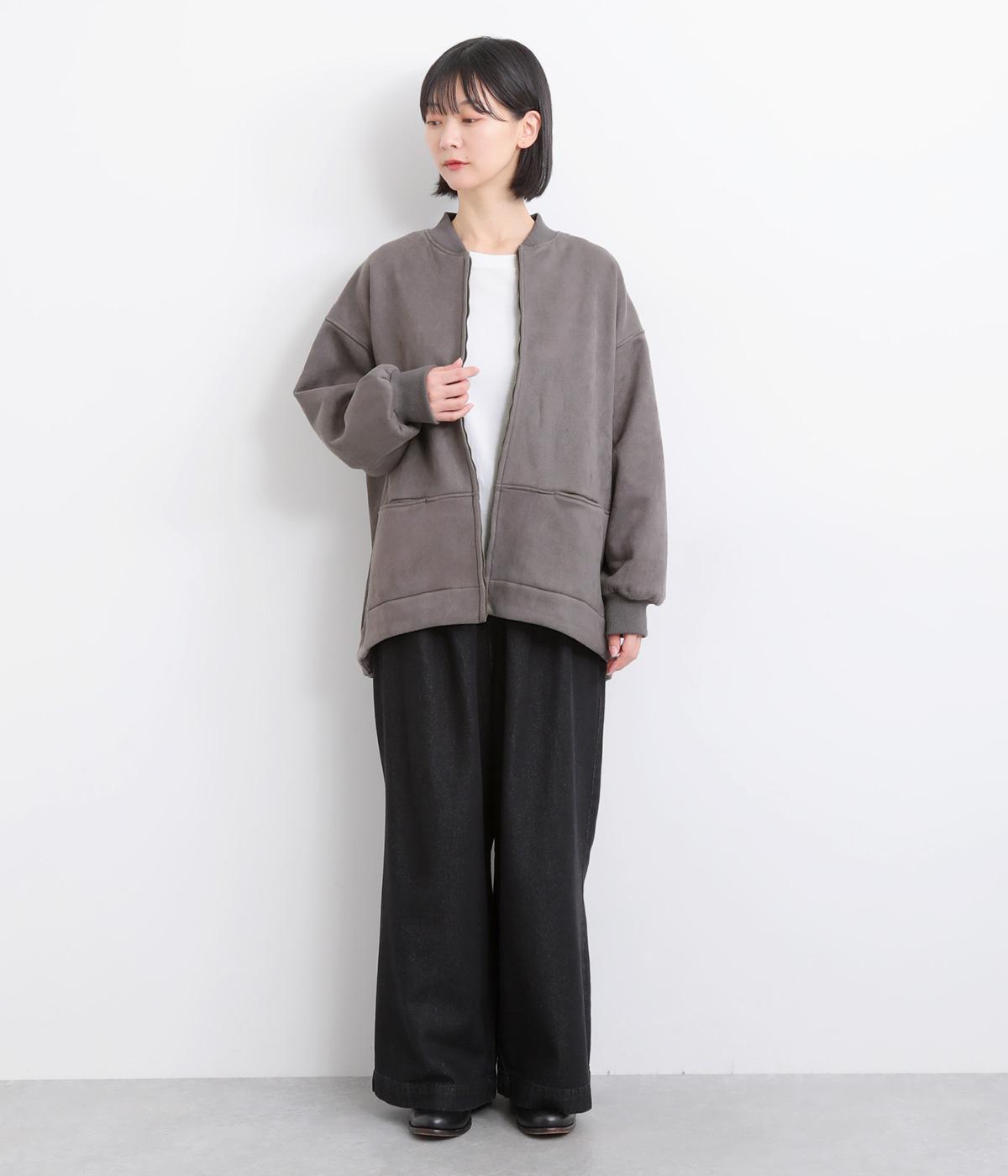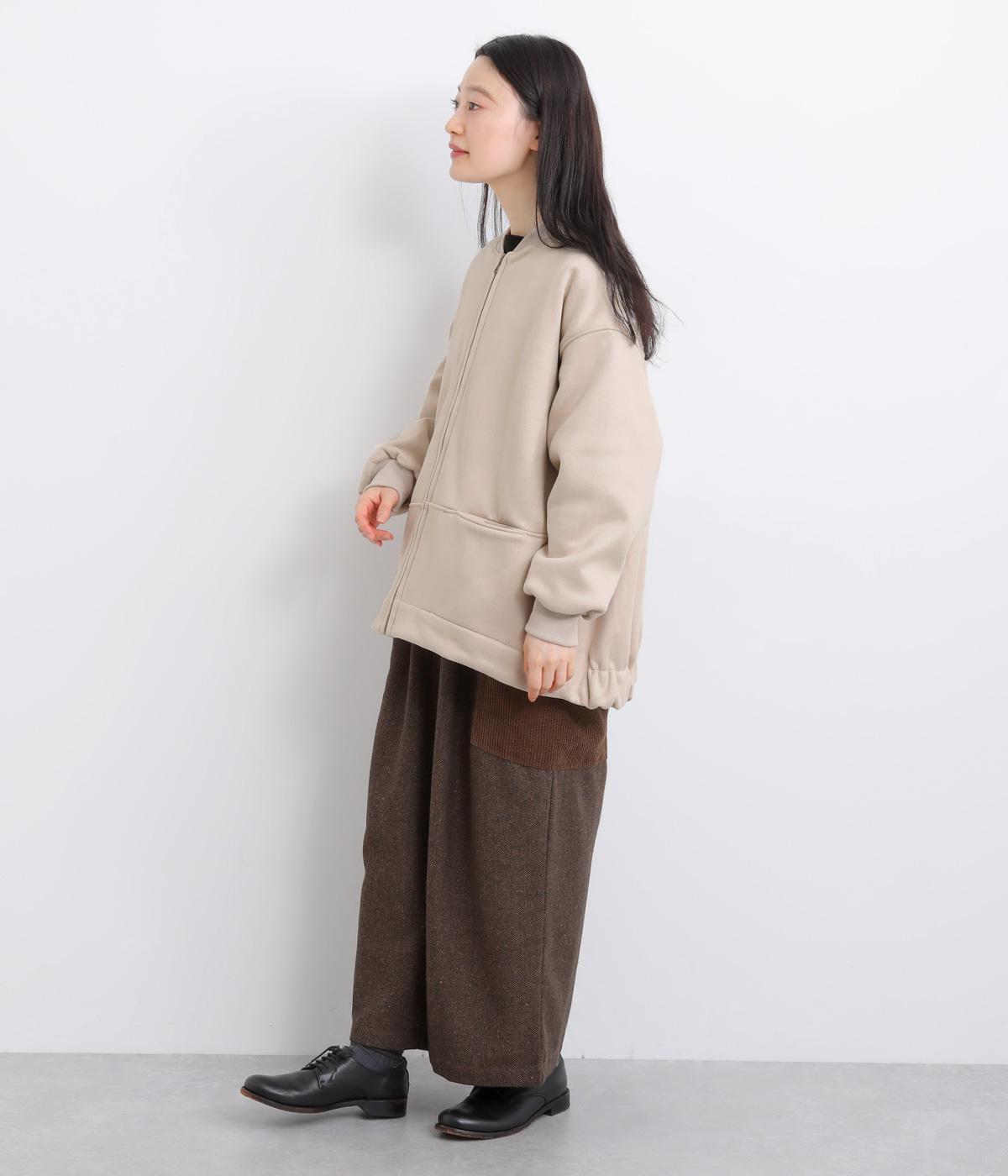 表側はフェイクスエードならではの微起毛がなめらかで、しっとりとした手ざわりが魅力。光の当たり方でやわらかな陰影が生まれ、上品な表情を見せます。裏地には、ふんわりとあたたかなフリースを重ねました。軽さもありつつほどよいハリで、シルエットがきれいにきまる素材です。