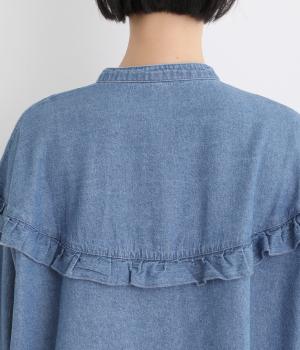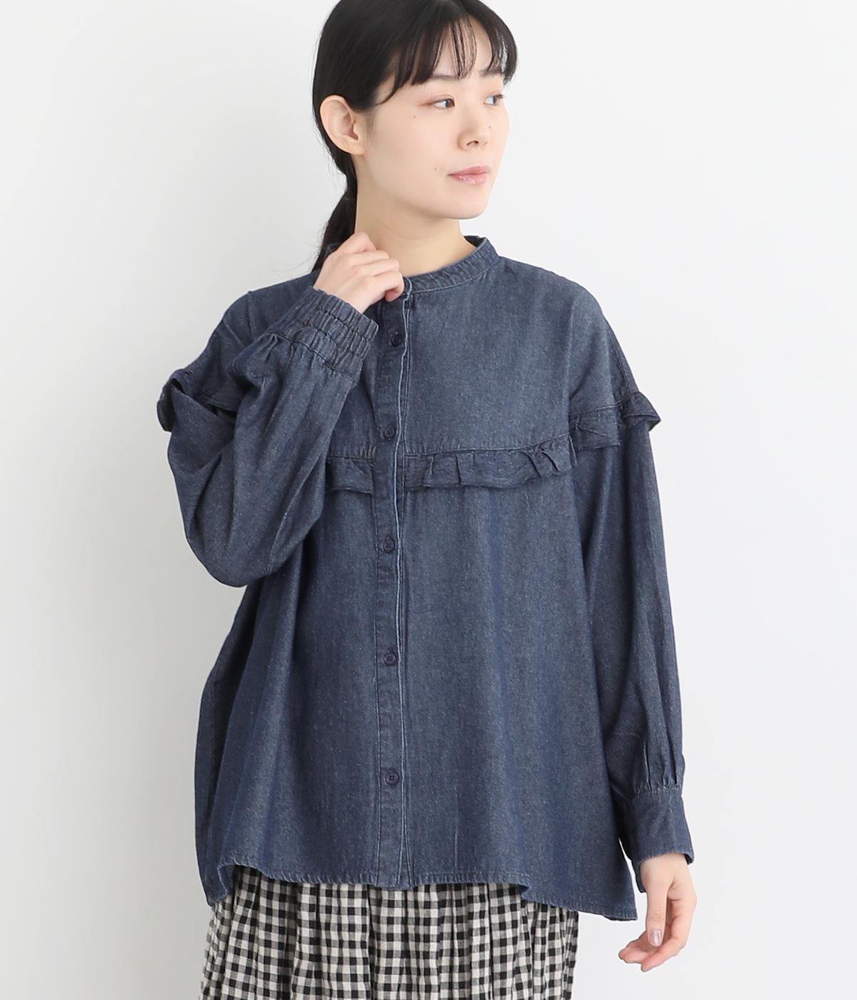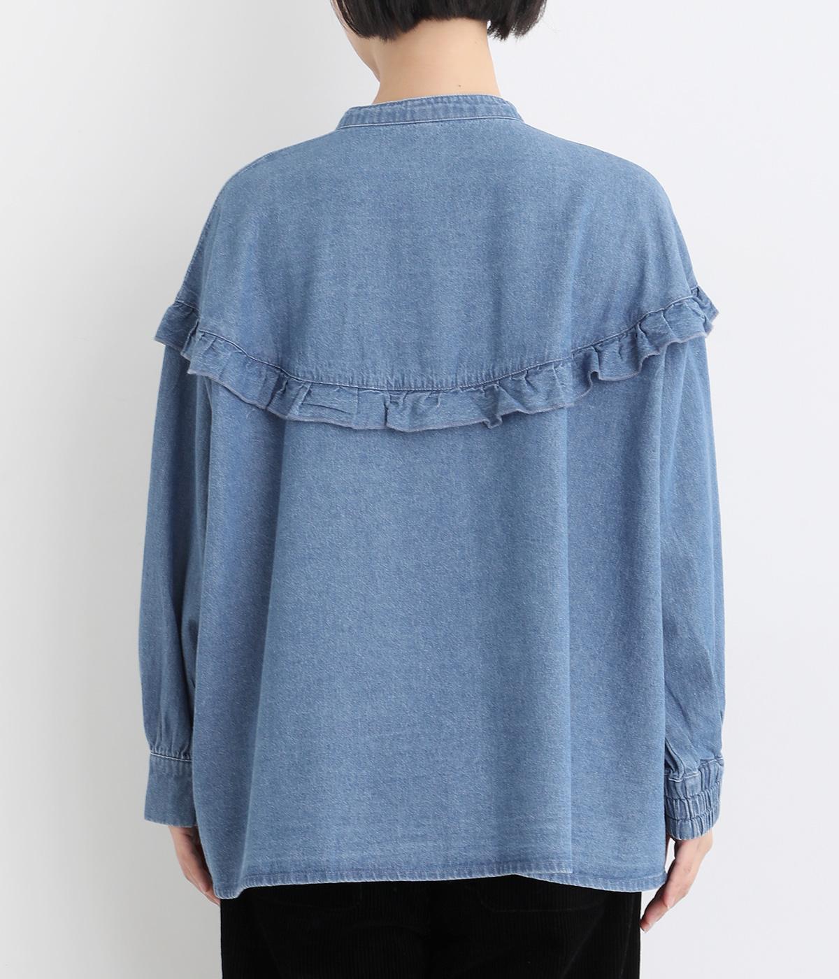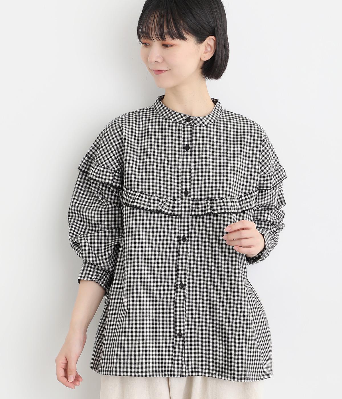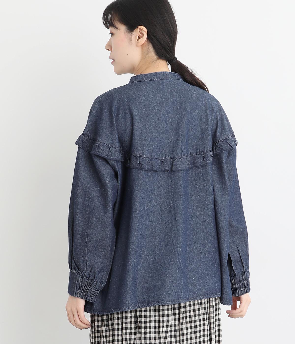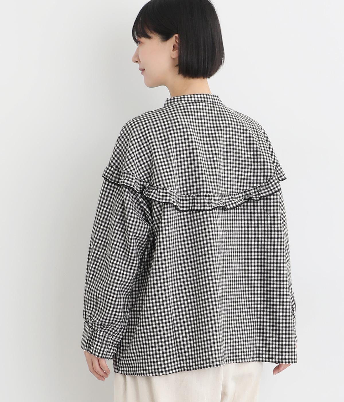 前後にかけたヨーク切り替えのフリルデザインがさり気なく甘さを足して目を惹きます。顔まわりはバンドカラーですっきりバランスよくまとめ、羽織り使いも可能。袖口は部分的にゴムを入れているので腕も通しやすく、たくし上げのアレンジも◎。