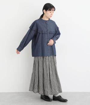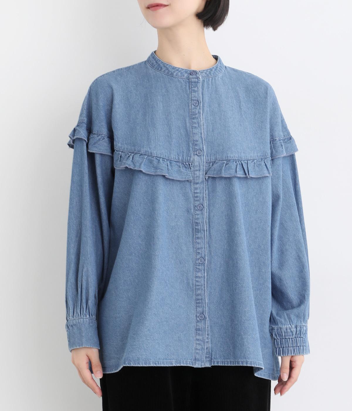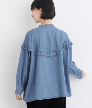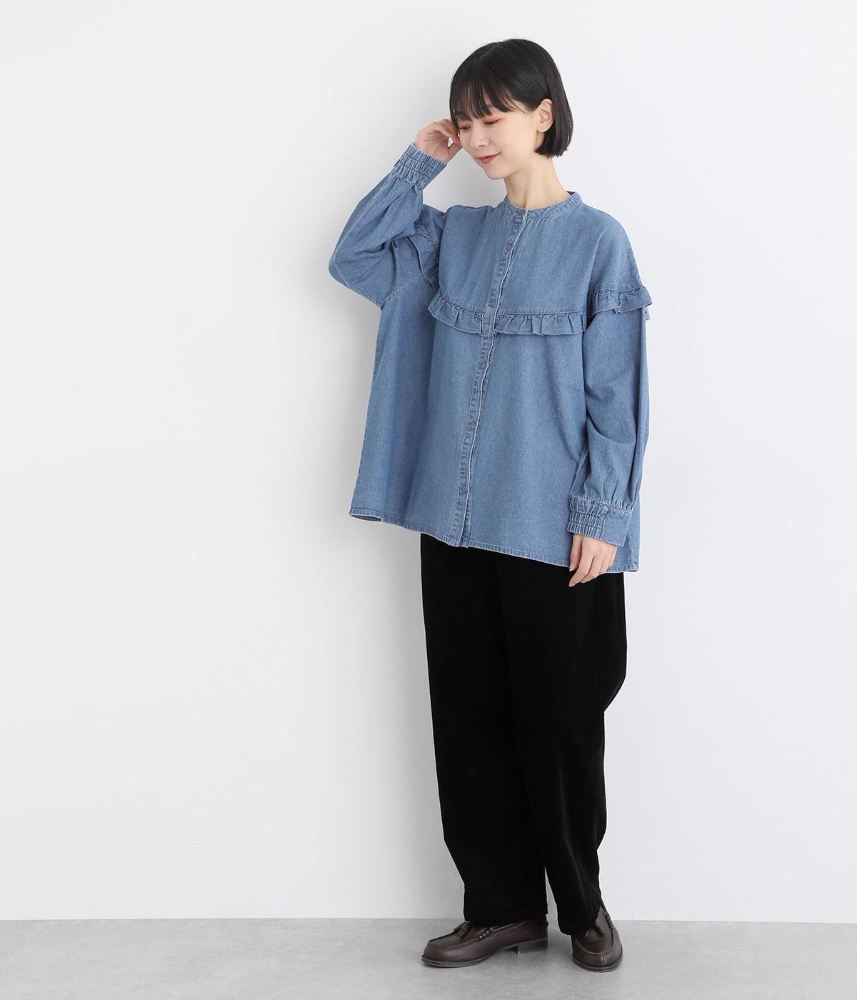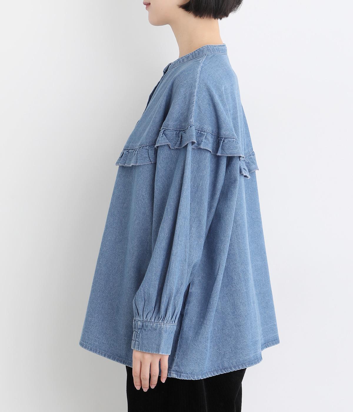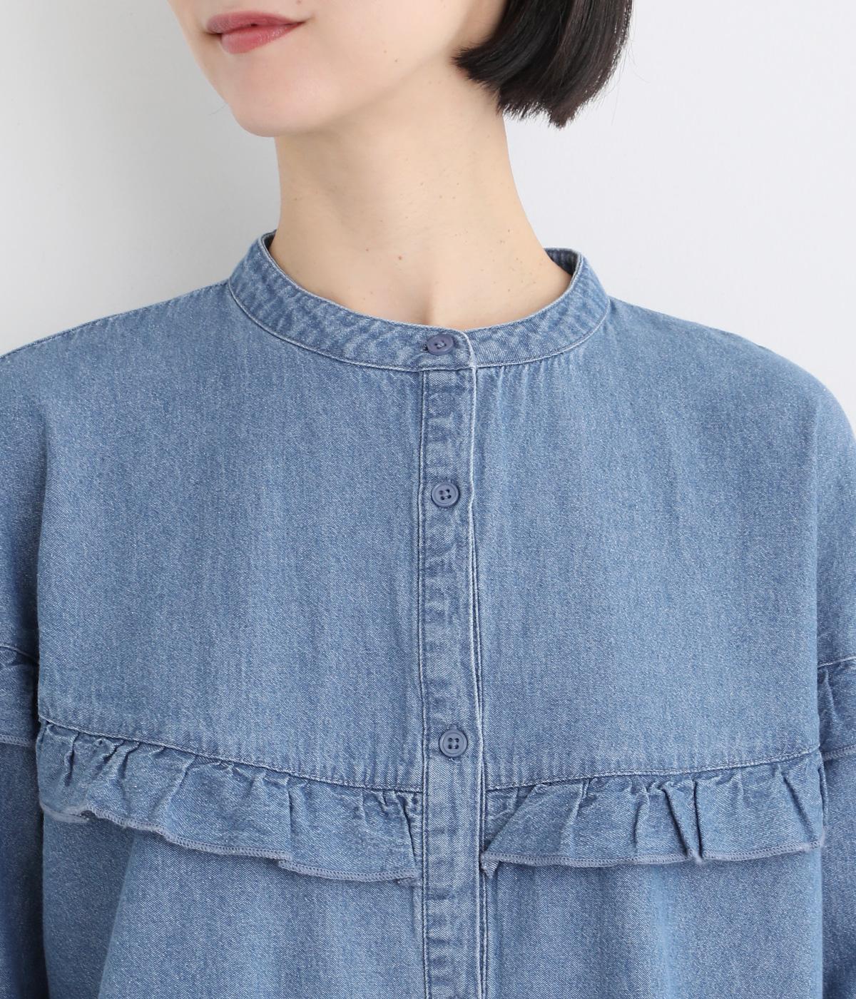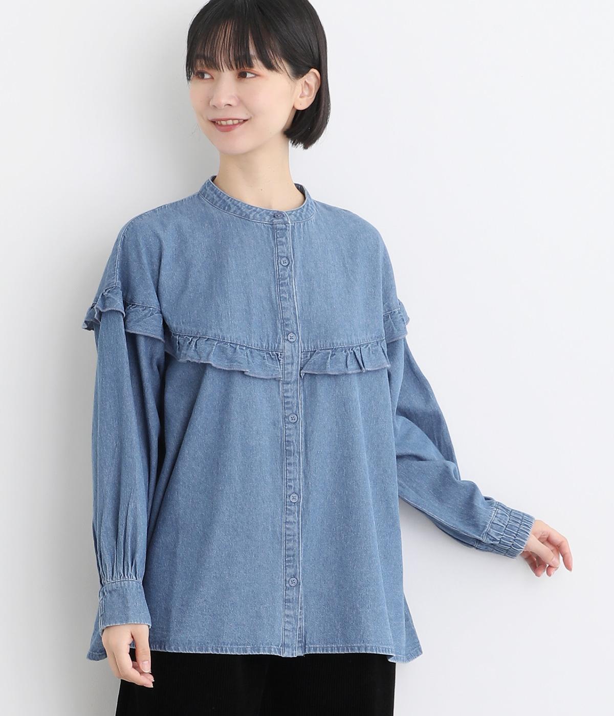 前後にかけたヨーク切り替えのフリルデザインがさり気なく甘さを足して目を惹きます。顔まわりはバンドカラーですっきりバランスよくまとめ、羽織り使いも可能。袖口は部分的にゴムを入れているので腕も通しやすく、たくし上げのアレンジも◎。
