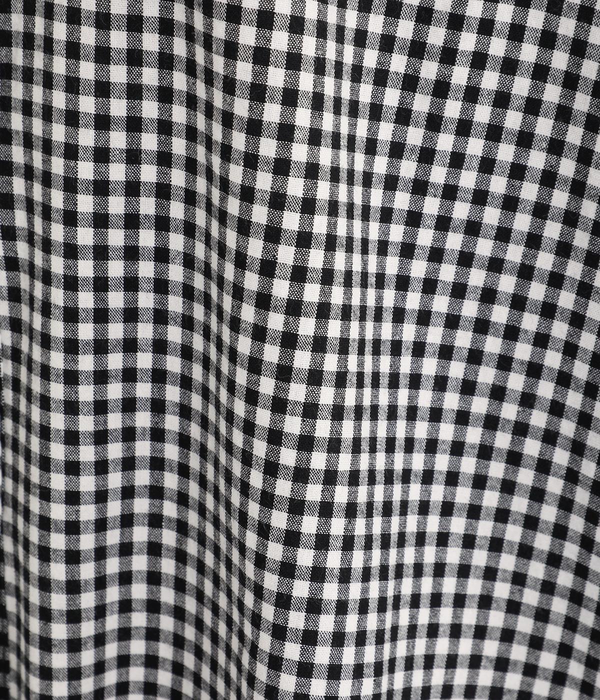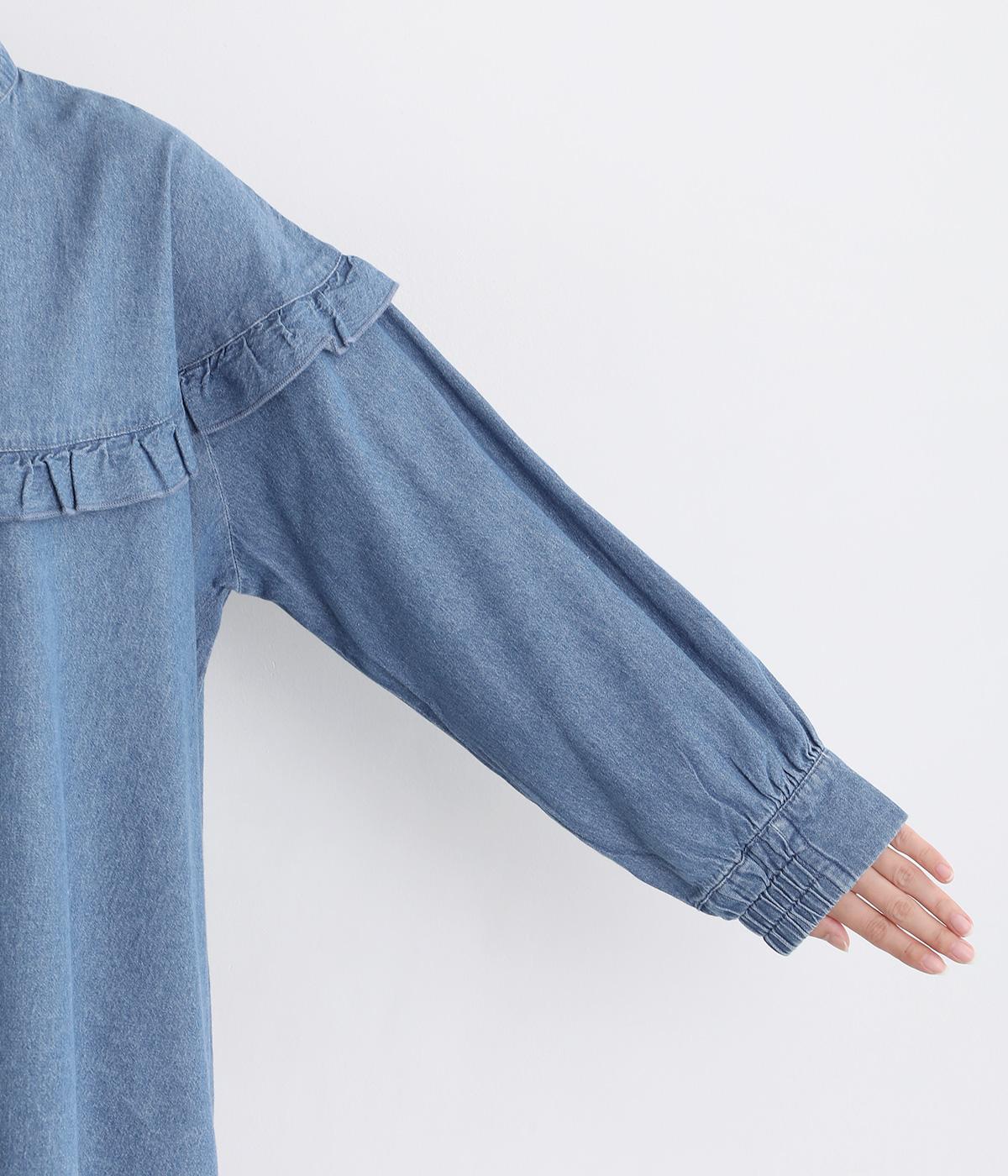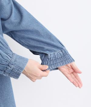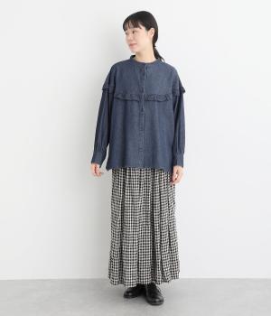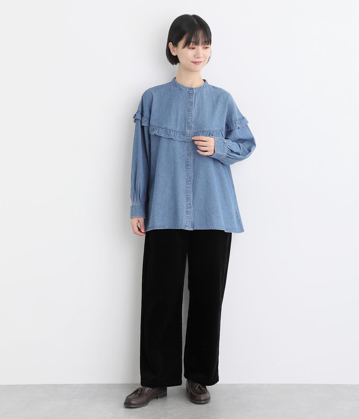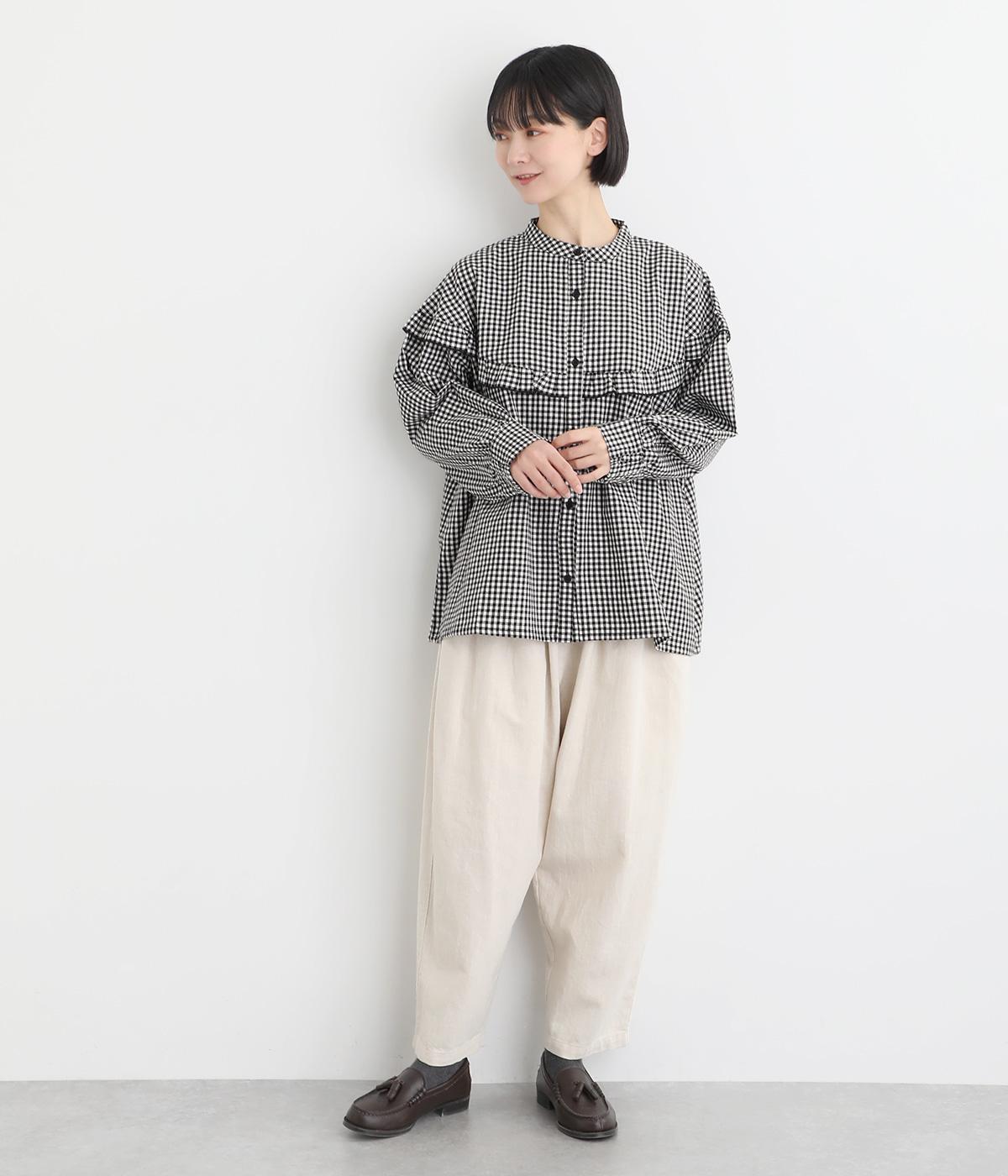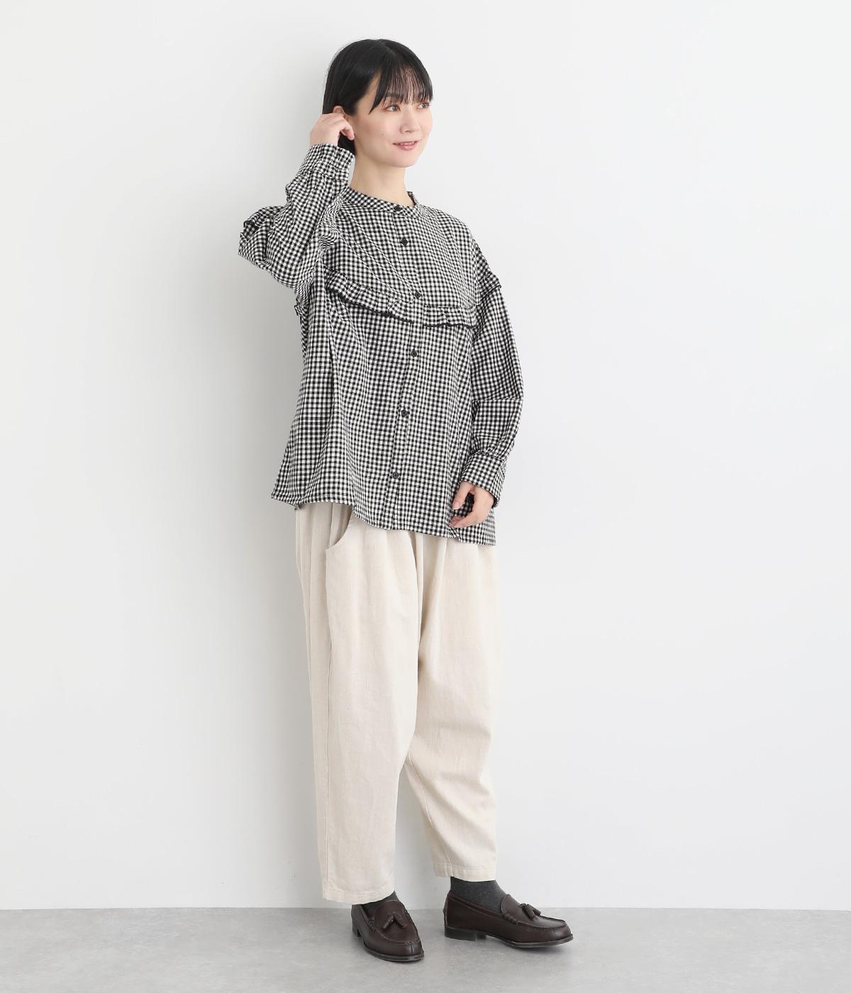 前後にかけたヨーク切り替えのフリルデザインがさり気なく甘さを足して目を惹きます。顔まわりはバンドカラーですっきりバランスよくまとめ、羽織り使いも可能。袖口は部分的にゴムを入れているので腕も通しやすく、たくし上げのアレンジも◎。