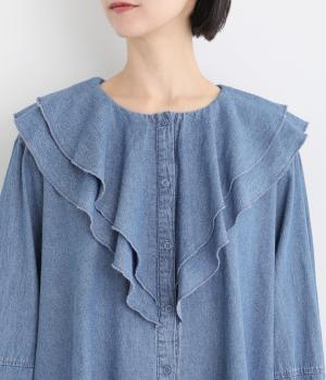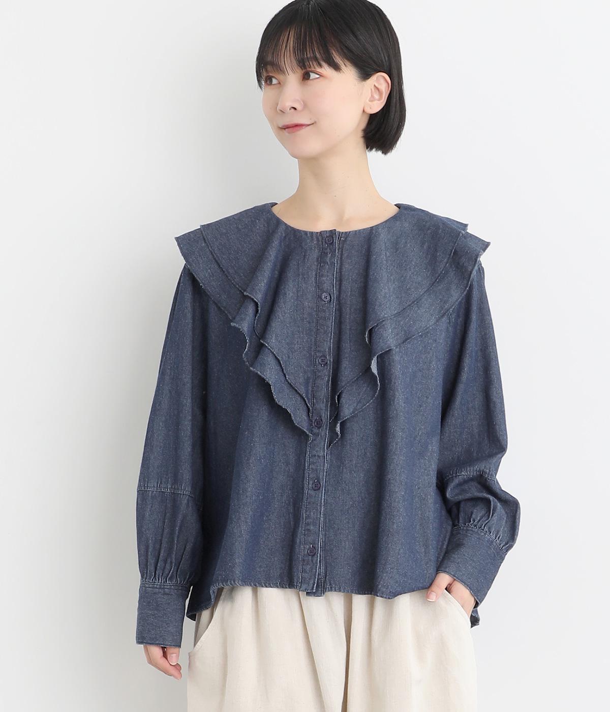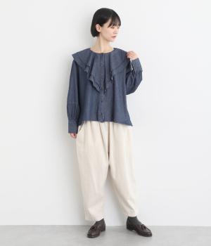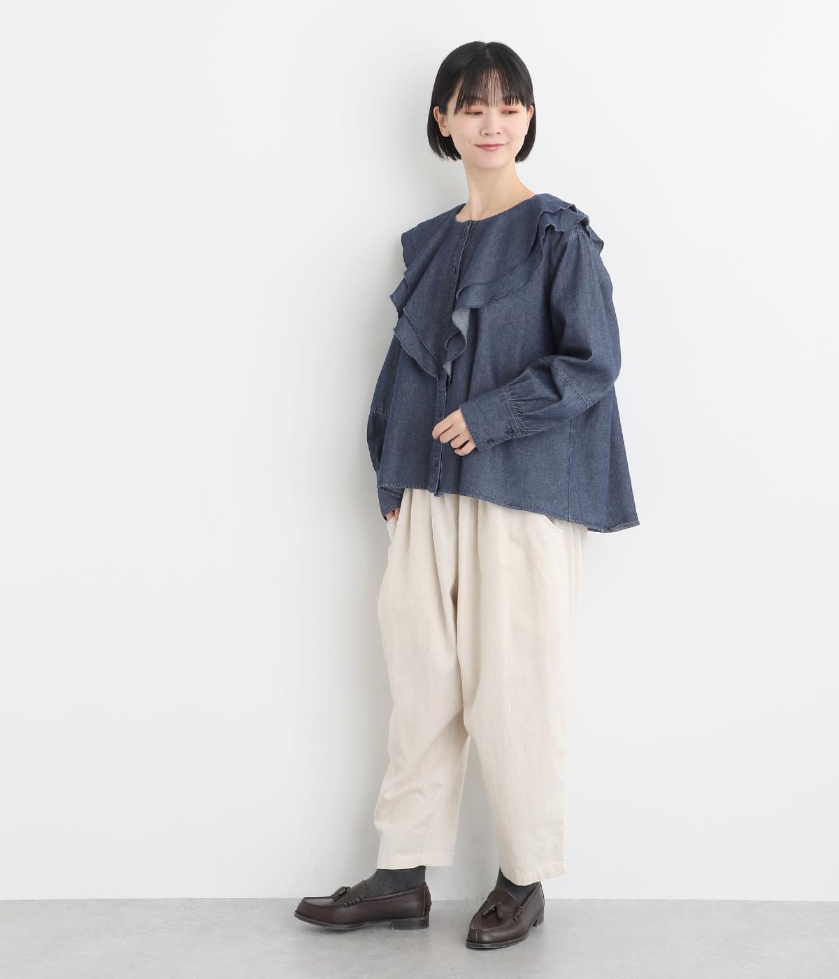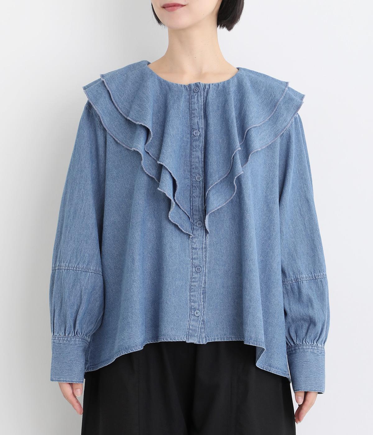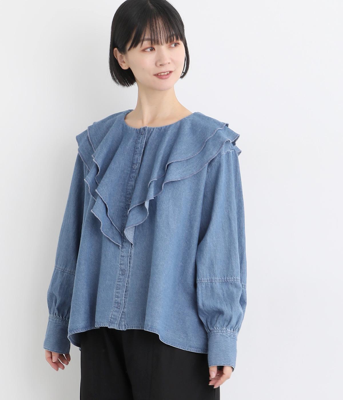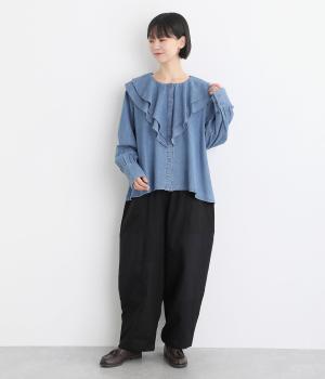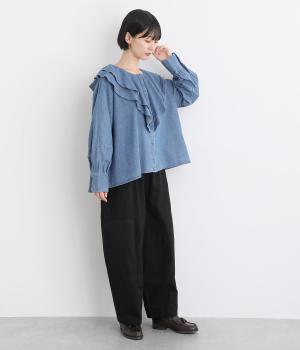 襟ぐりから前立てにかけたラッフルがデコラティブで着こなしのポイントになる一枚。カフスをつけてメリハリをつけたボリューム袖もロマンティックな雰囲気を盛り上げます。素材によってほどよくカジュアルダウンさせたバランス感も◎。