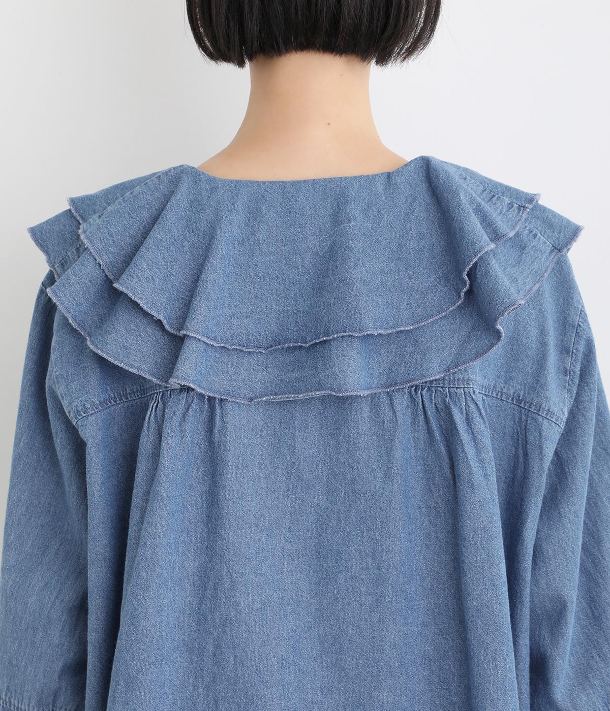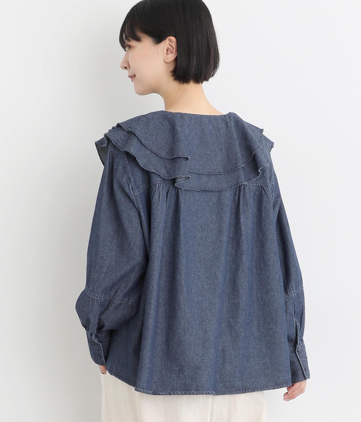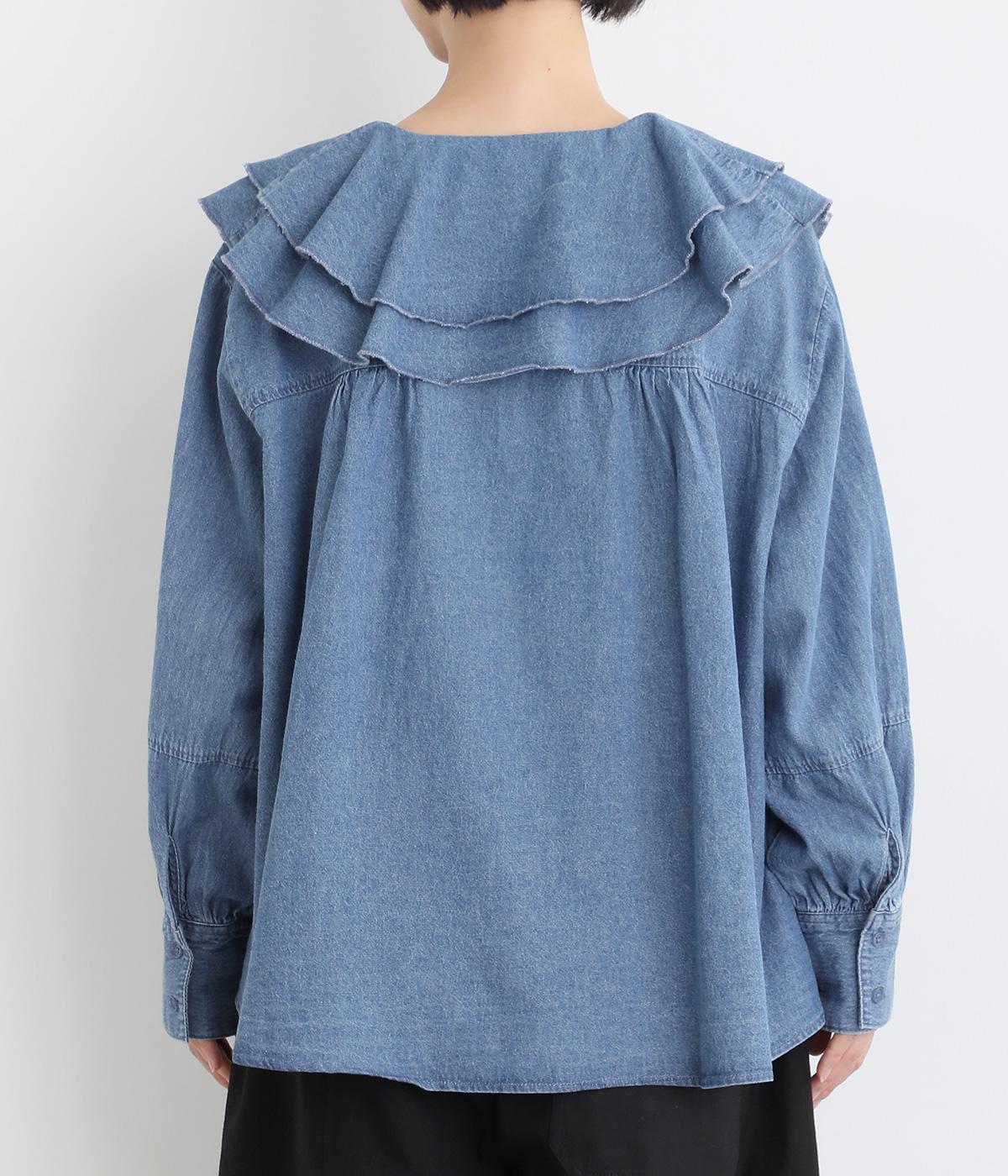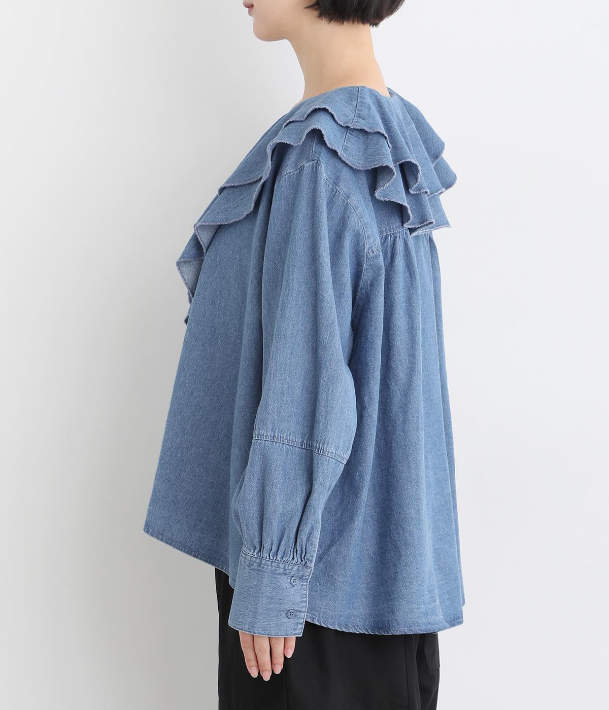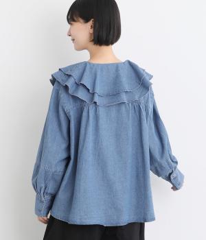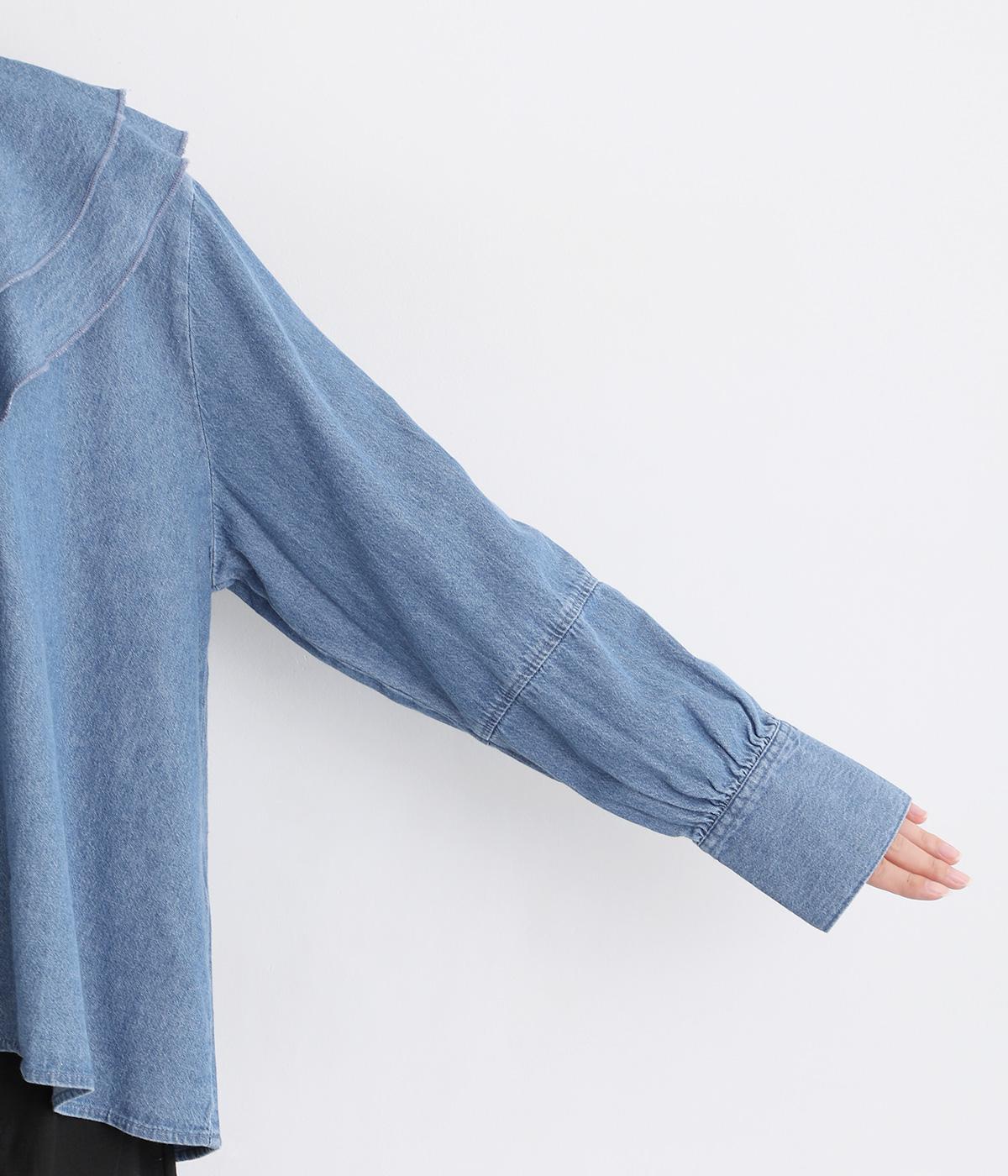 襟ぐりから前立てにかけたラッフルがデコラティブで着こなしのポイントになる一枚。カフスをつけてメリハリをつけたボリューム袖もロマンティックな雰囲気を盛り上げます。素材によってほどよくカジュアルダウンさせたバランス感も◎。