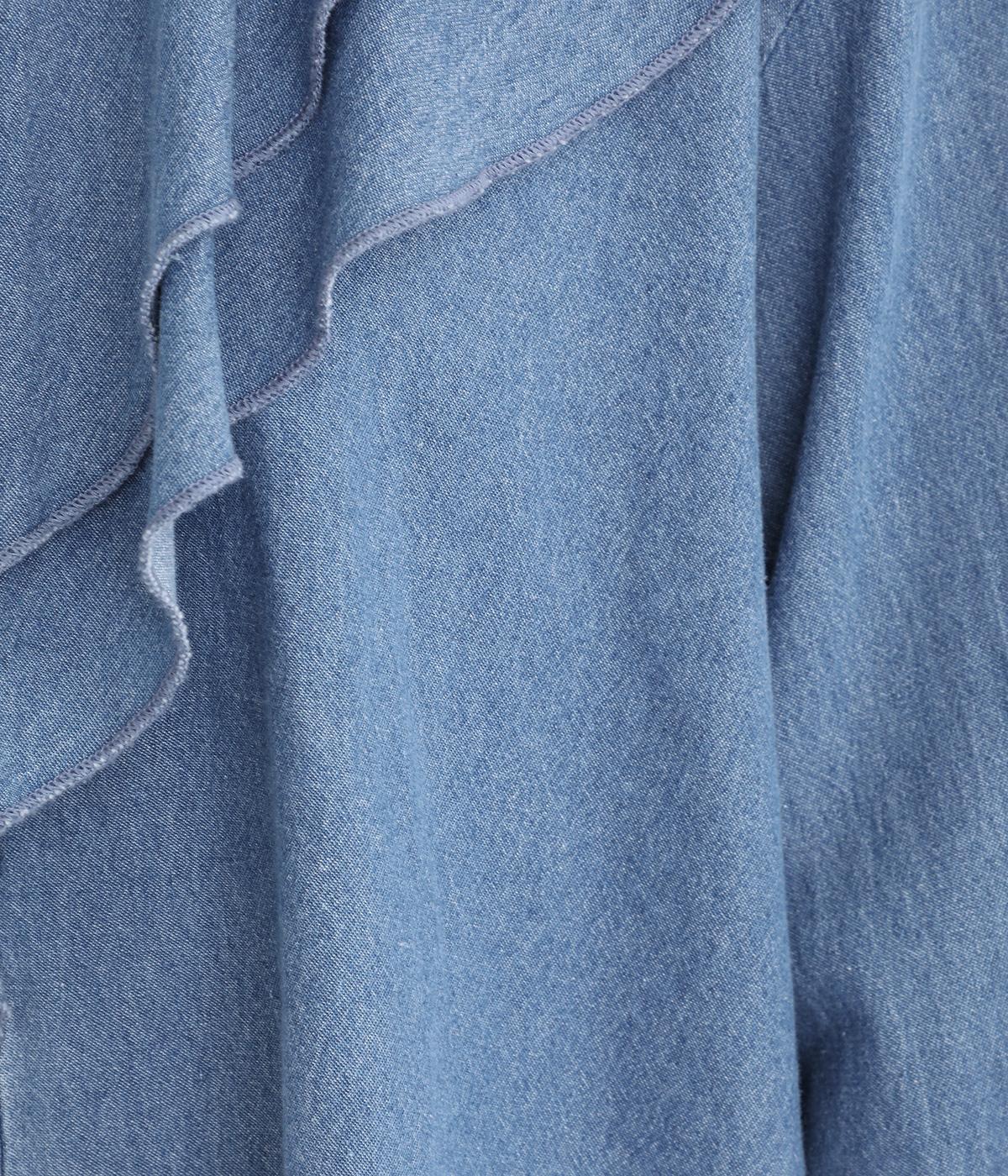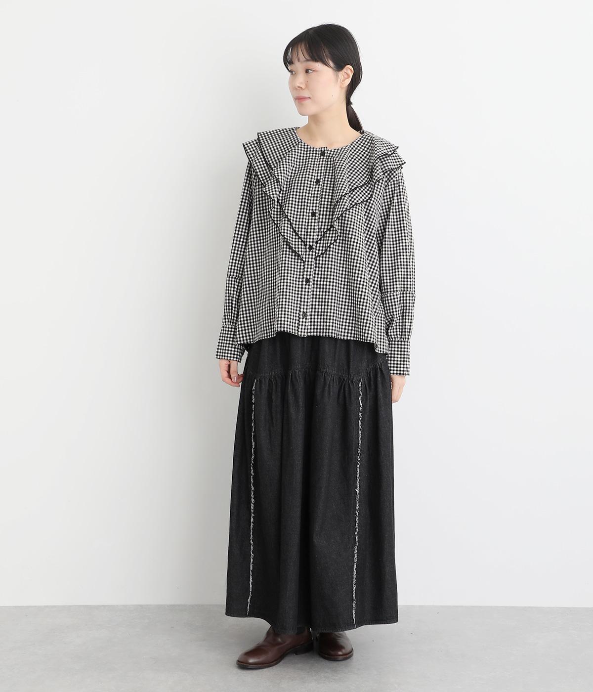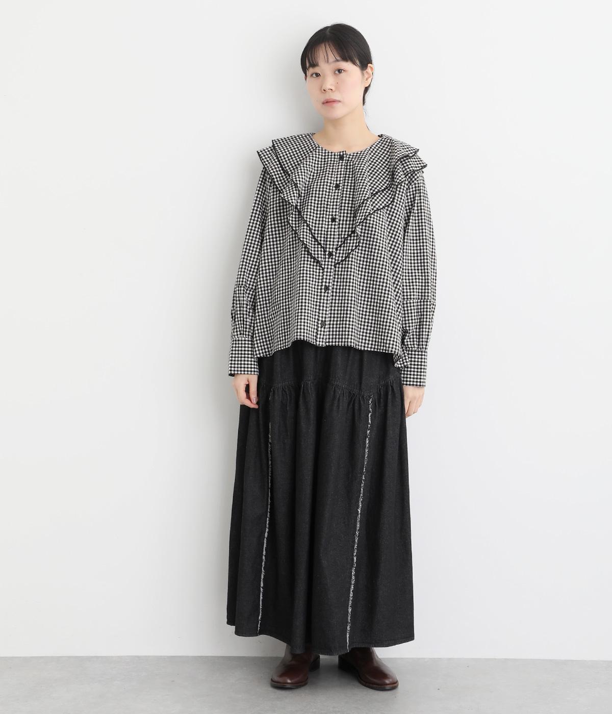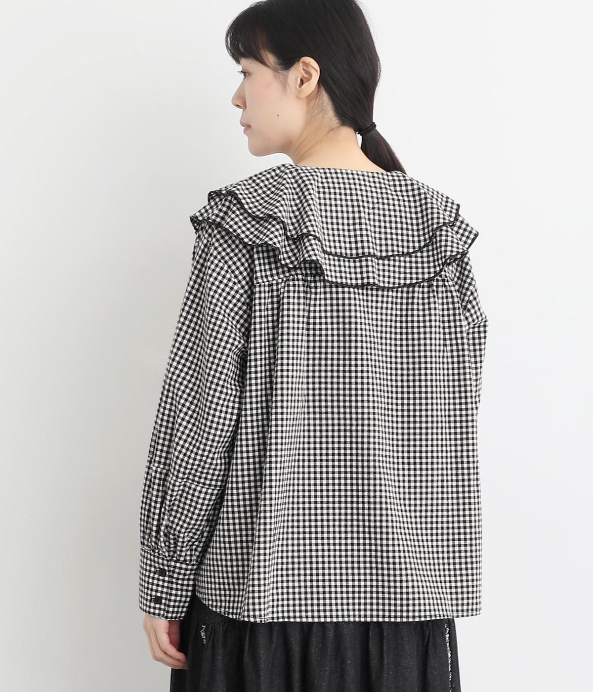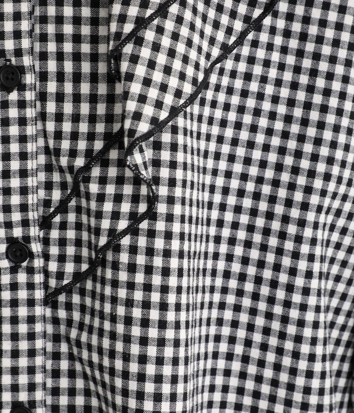襟ぐりから前立てにかけたラッフルがデコラティブで着こなしのポイントになる一枚。カフスをつけてメリハリをつけたボリューム袖もロマンティックな雰囲気を盛り上げます。素材によってほどよくカジュアルダウンさせたバランス感も◎。