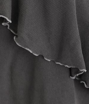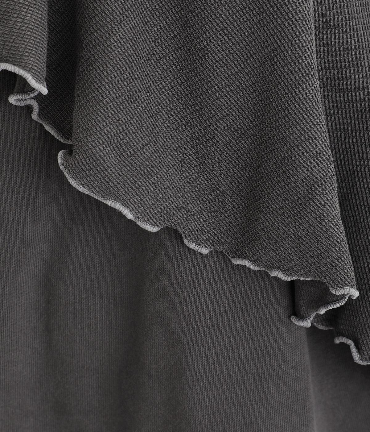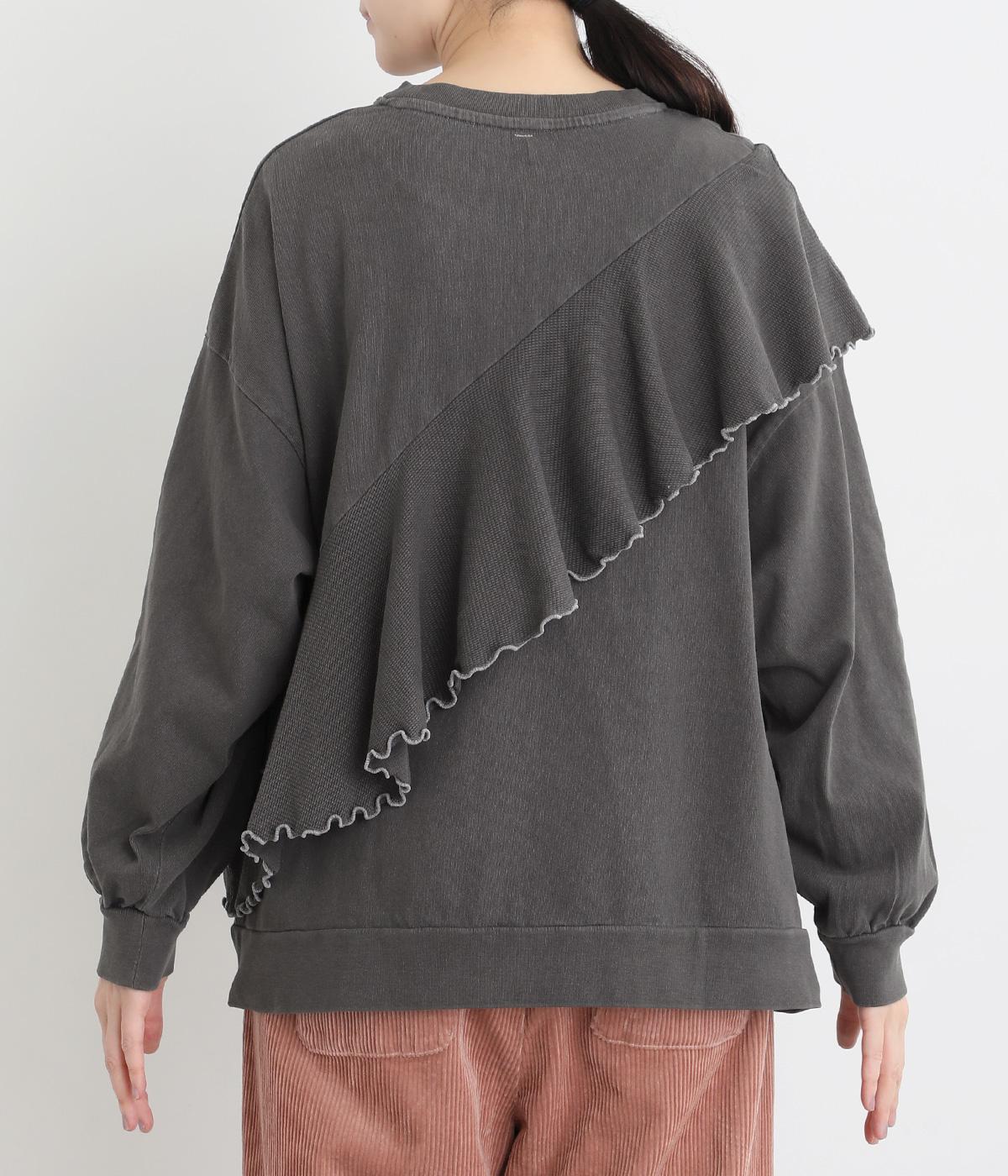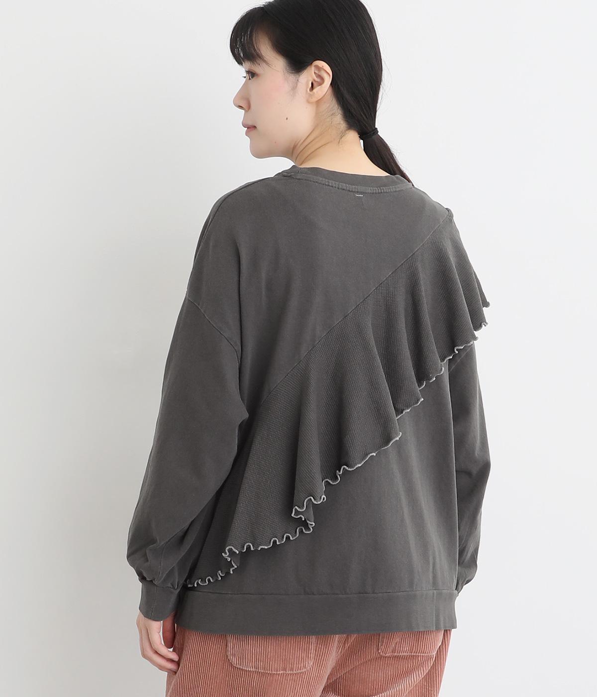 ヴィンテージ風に仕上がるピグメント加工をほどこしたやわらかなコットン生地をメインに使用しています。フリル部分は表面感のある異素材に切り替えて変化をプラス。着るたびに風合いが増し、こなれ感もアップ。
