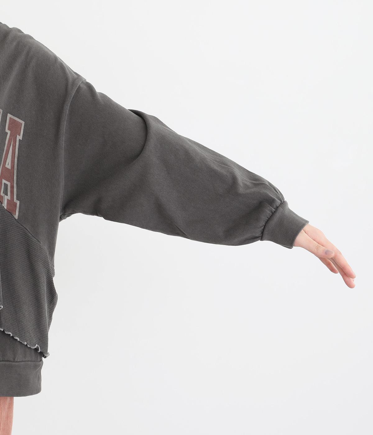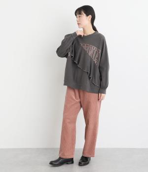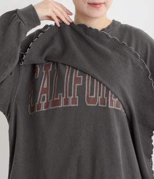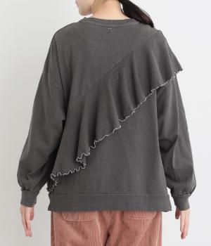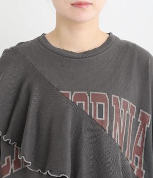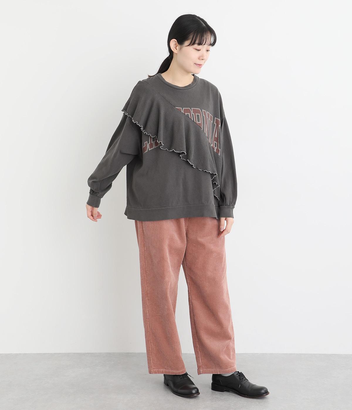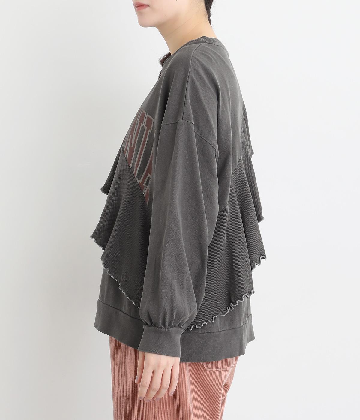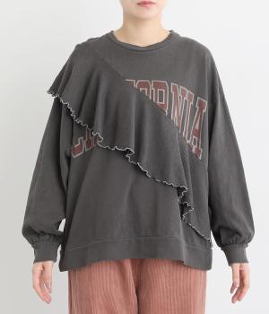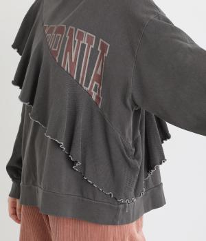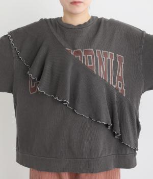 アメリカンカジュアルなロゴスウェットにラッフルをはしらせて甘辛テイストに仕上げました。リメイク風デザインが特徴的で、シンプルなボトム合わせでもスタイリングが決まります。いつものラフスタイルも新鮮に見せてくれる一枚です。
