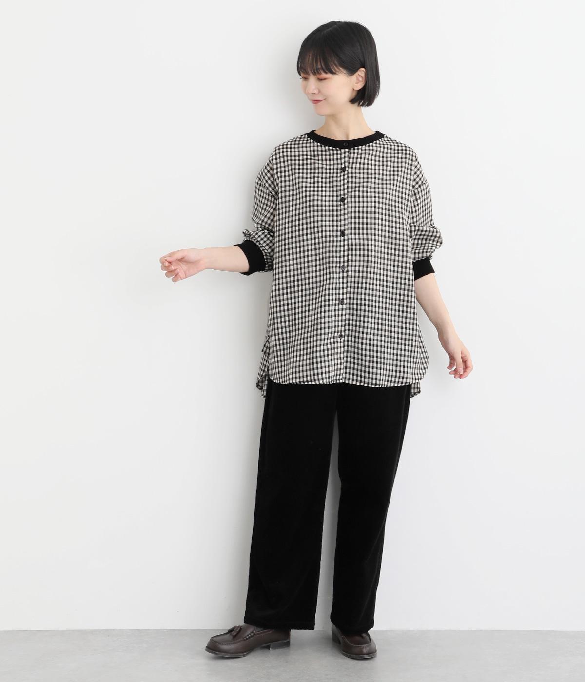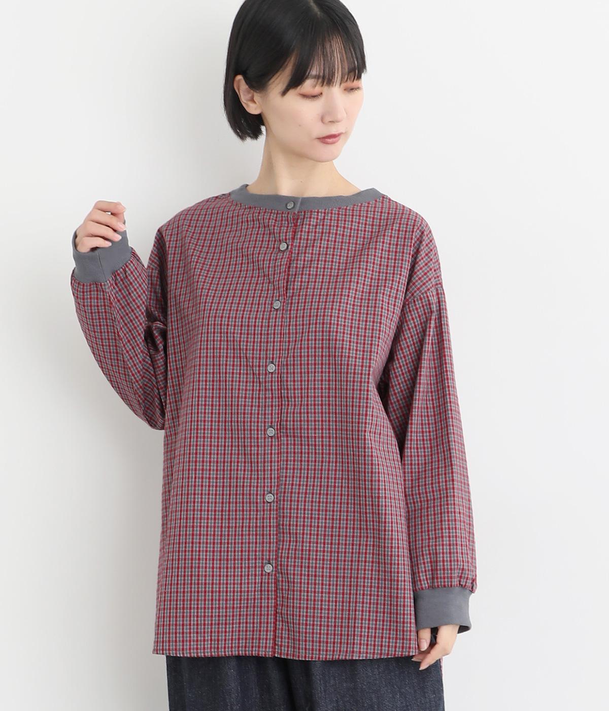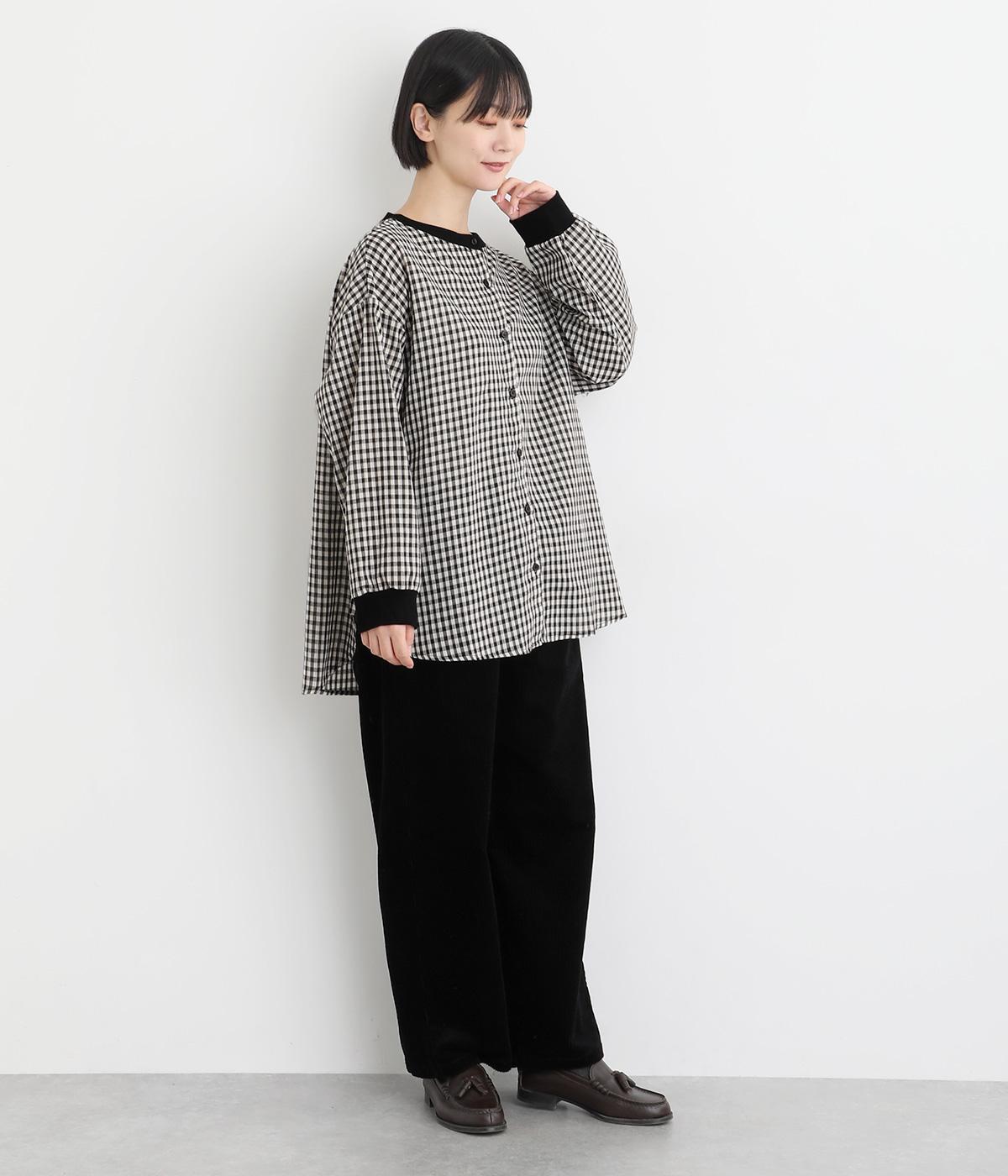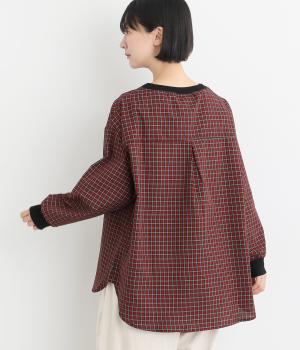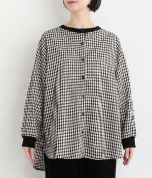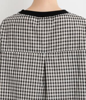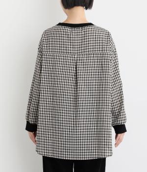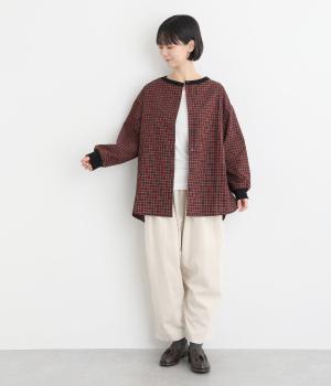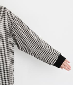 着こなしのポイントになるチェック柄生地は、スタンドネックと袖口にリブを配して心地よいメリハリをつけました。やや長めの着丈にラウンドヘムがお洒落ポイントで、ボトム合わせも自然にきまります。ボタンをあけた羽織り使いもすてき。