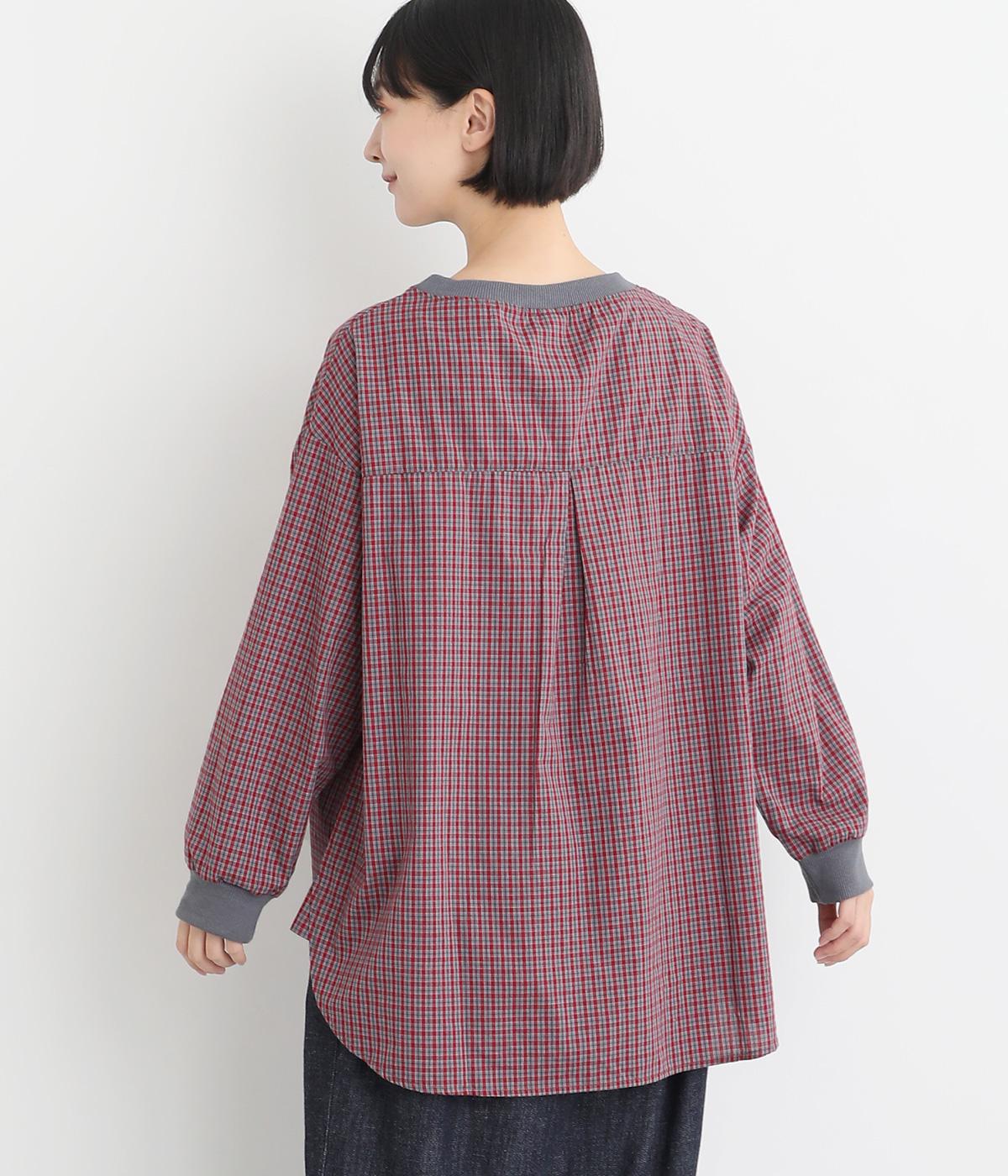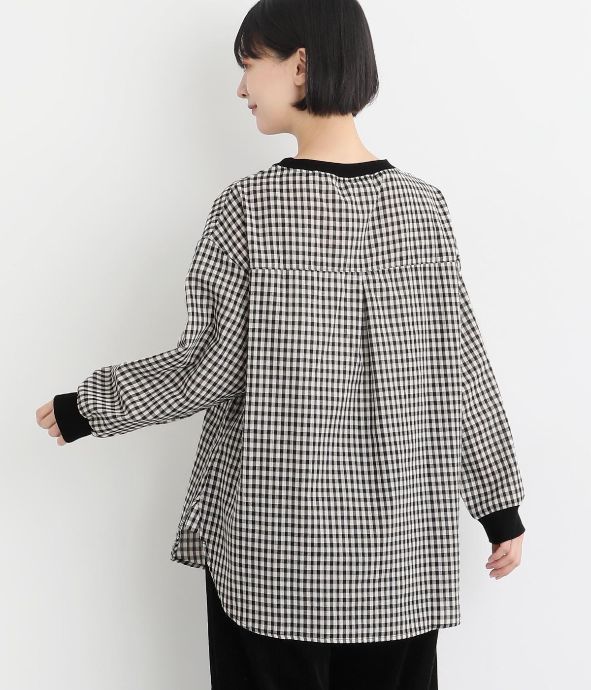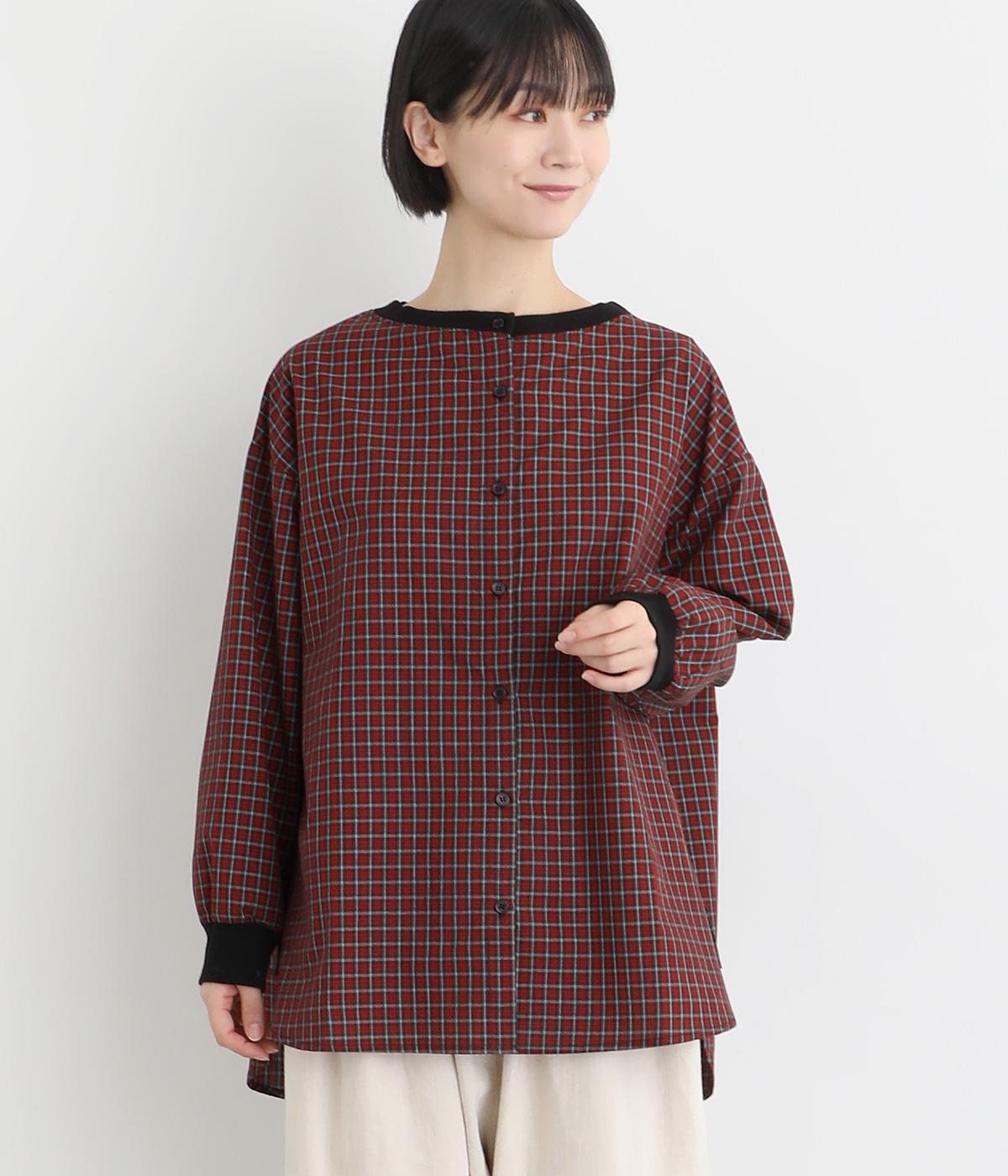 着こなしのポイントになるチェック柄生地は、スタンドネックと袖口にリブを配して心地よいメリハリをつけました。やや長めの着丈にラウンドヘムがお洒落ポイントで、ボトム合わせも自然にきまります。ボタンをあけた羽織り使いもすてき。