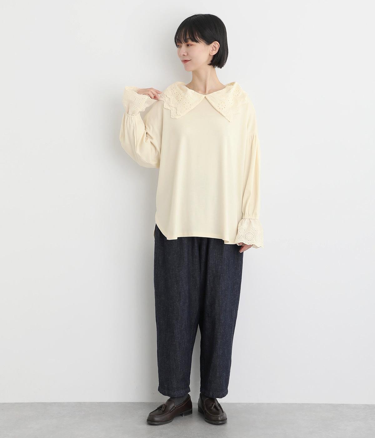 襟元と袖口の大振りレースがロマンティックで目を惹きます。カジュアルテイストなベースに立体感のあるレースが着映え力を高め、着こなしの主役になる一枚。サロペットなどのインナー使いでフリルを際立たせるのもおすすめ。