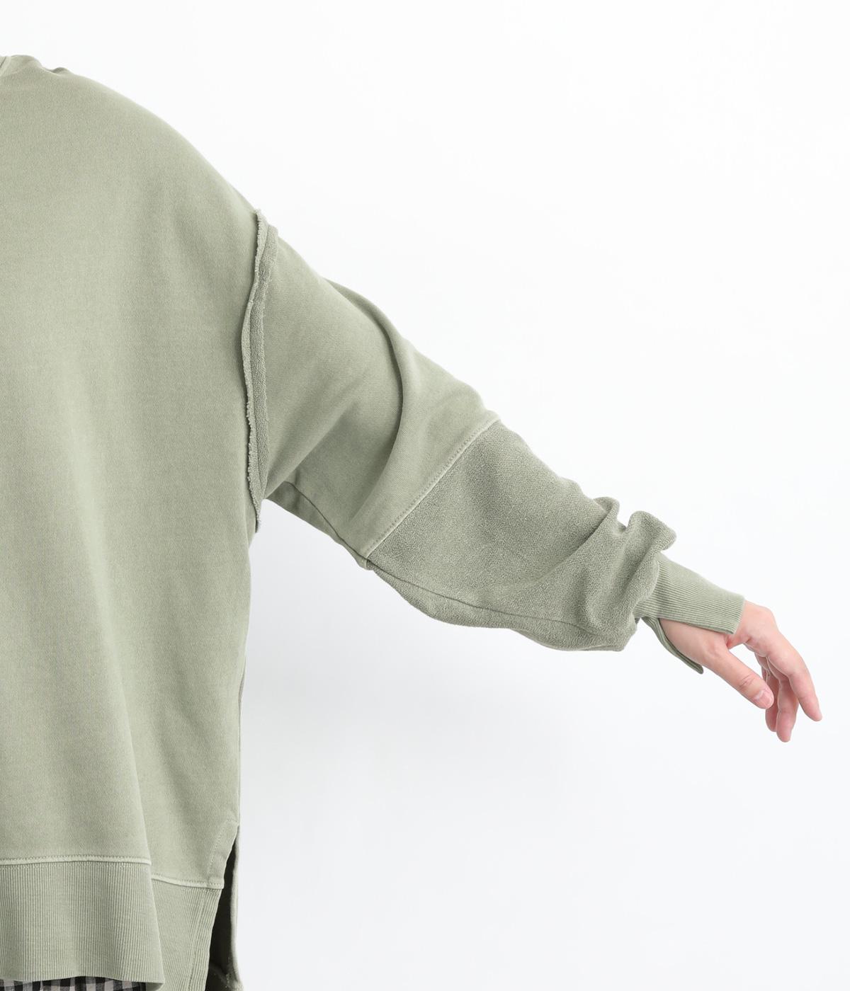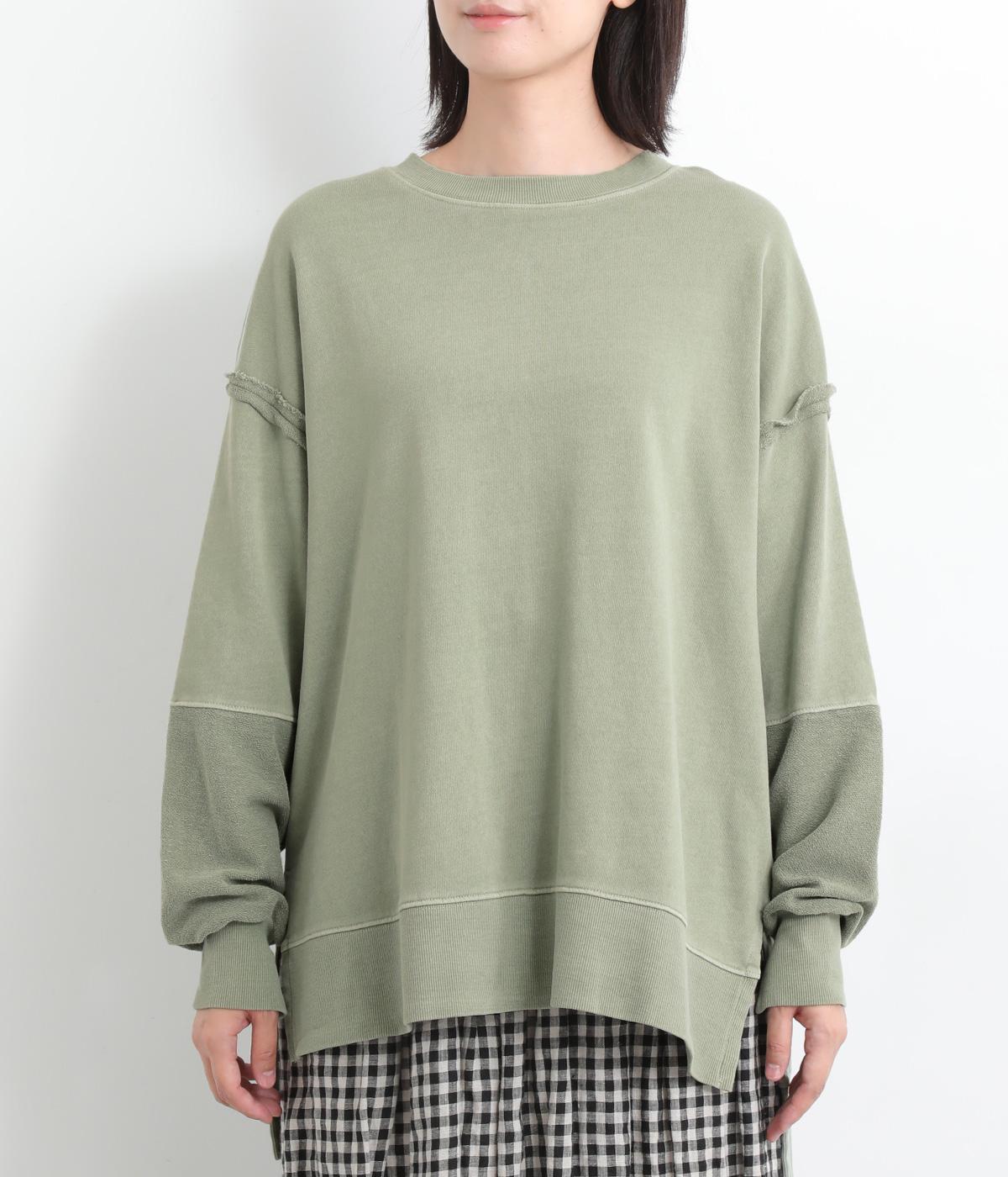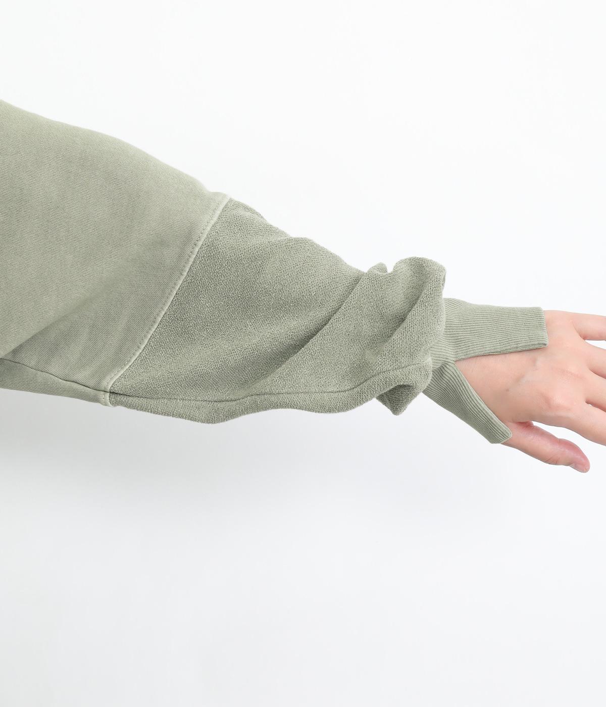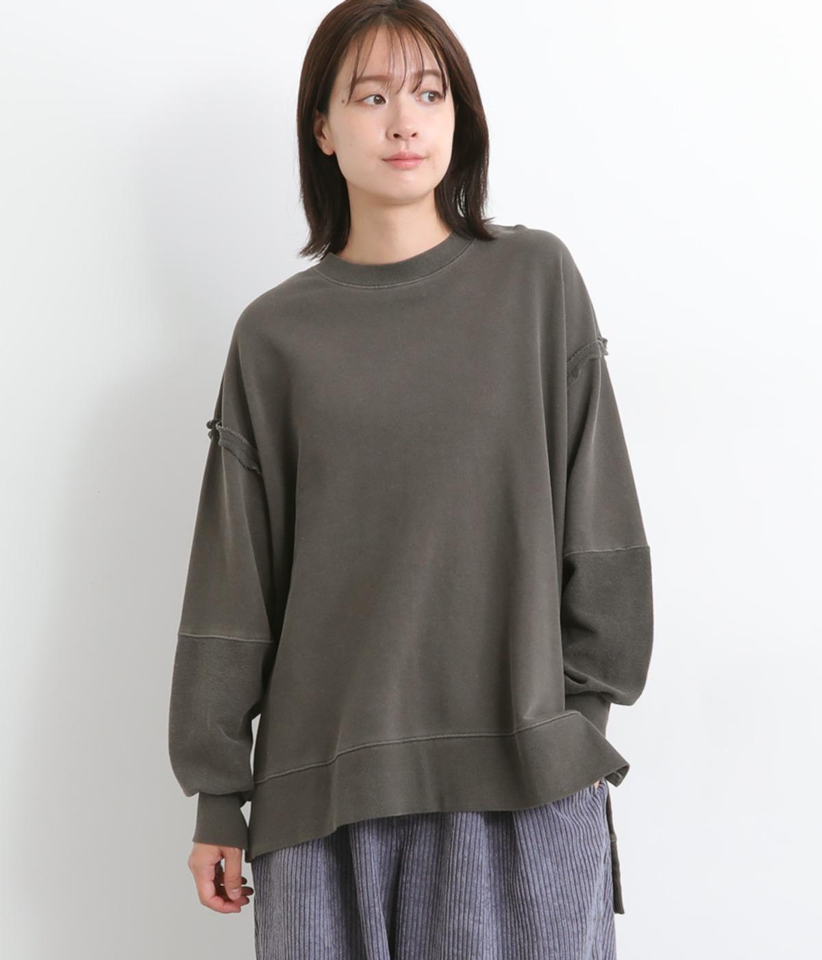 ソフトな手ざわりが心地いい裏毛素材。ピグメント加工によるユーズド感のある風合いが魅力です。肩口のラインと袖先の切り替え部分は裏面の素材を使用して表情に変化をつけました。