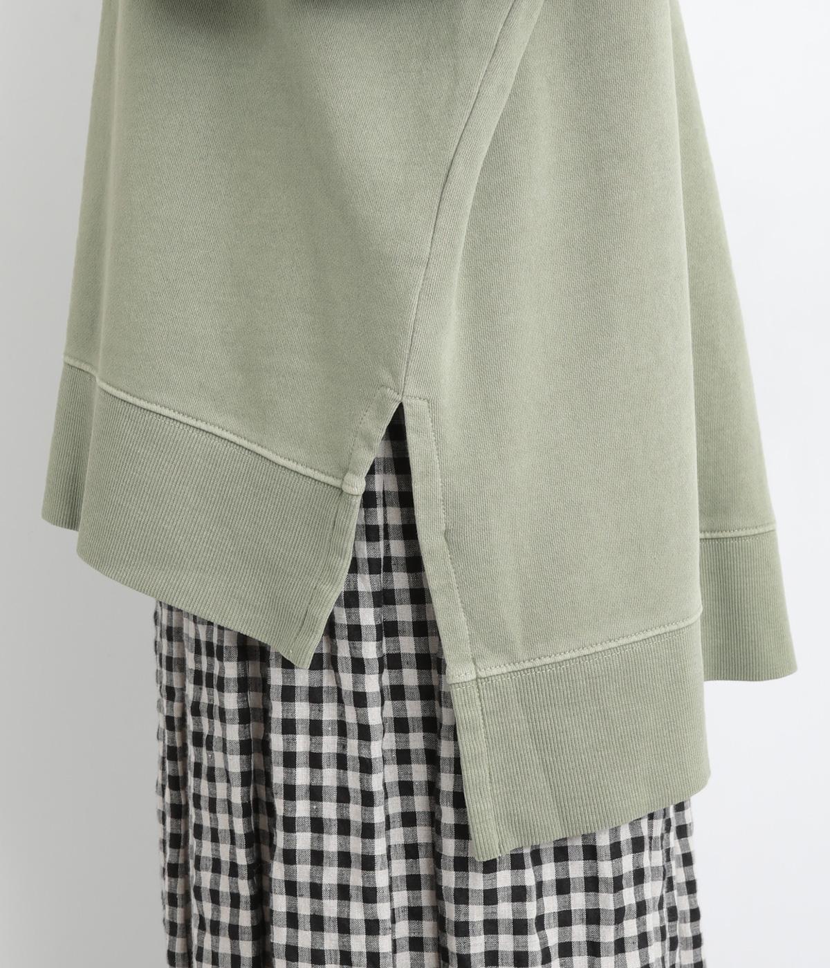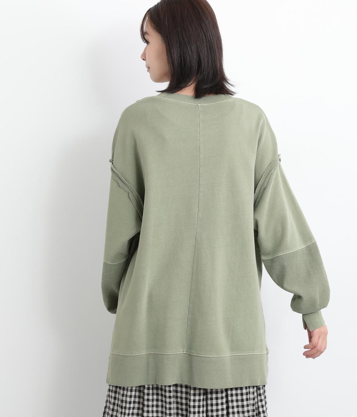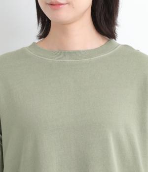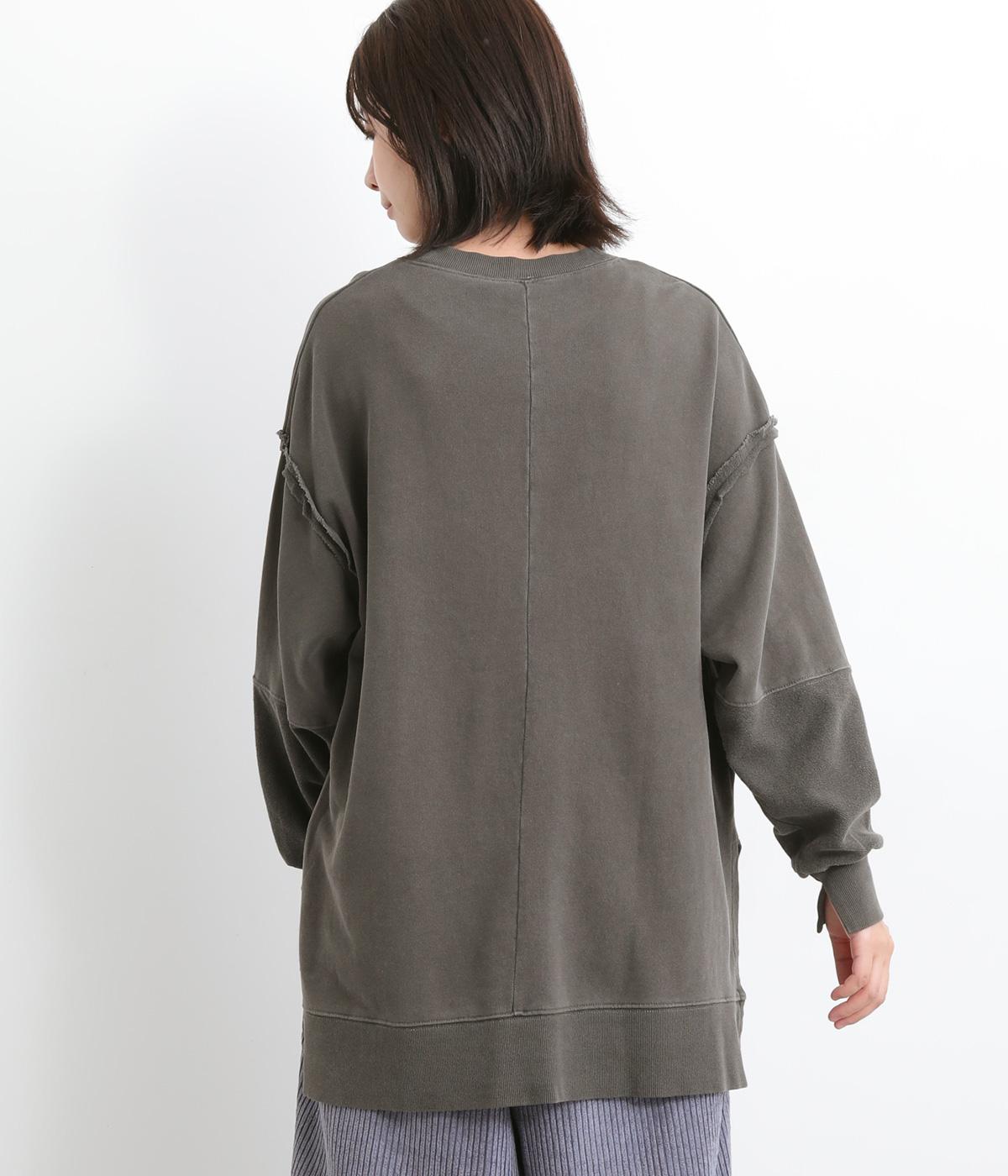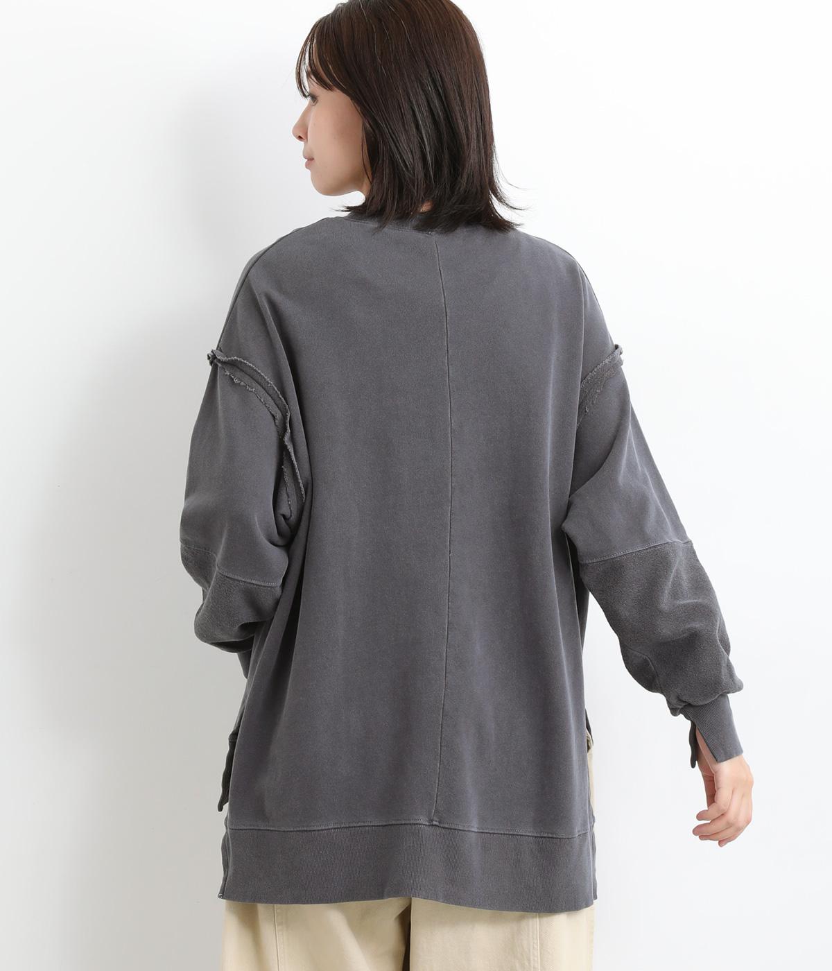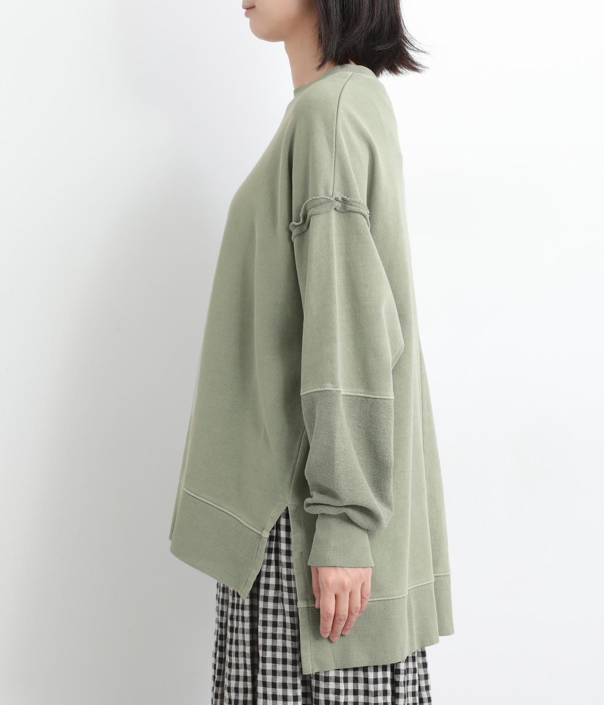 ソフトな手ざわりが心地いい裏毛素材。ピグメント加工によるユーズド感のある風合いが魅力です。肩口のラインと袖先の切り替え部分は裏面の素材を使用して表情に変化をつけました。