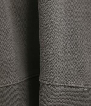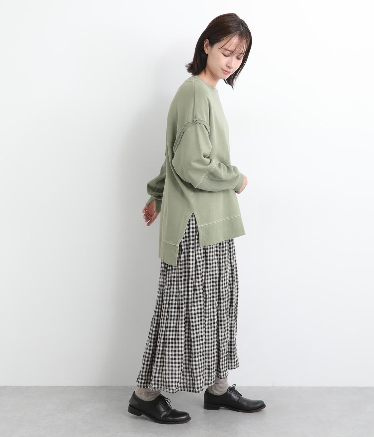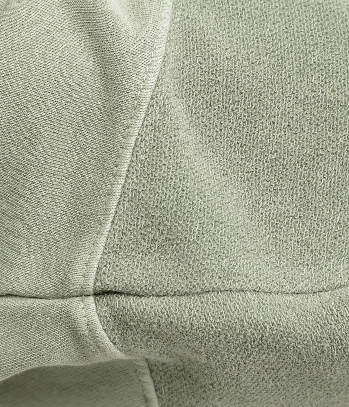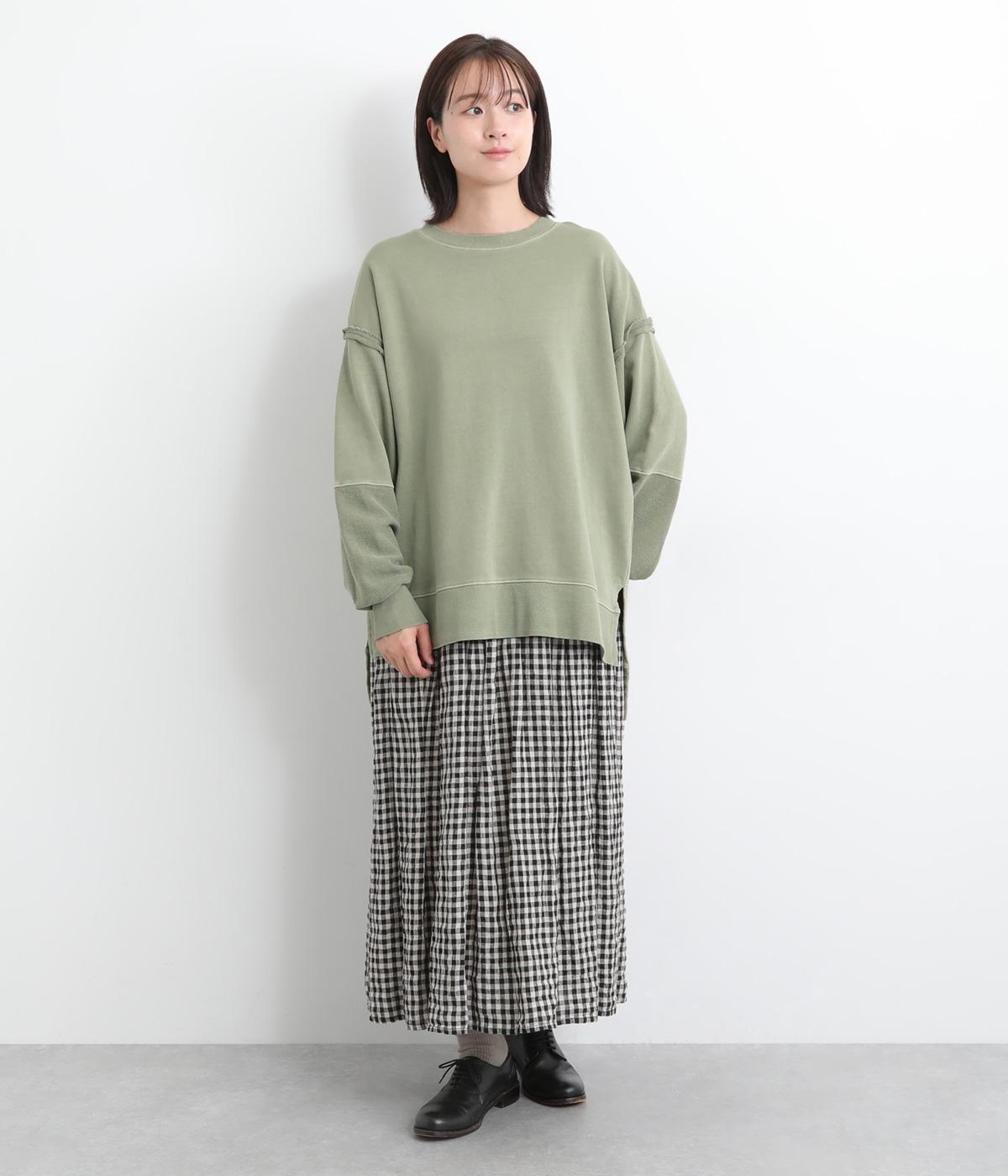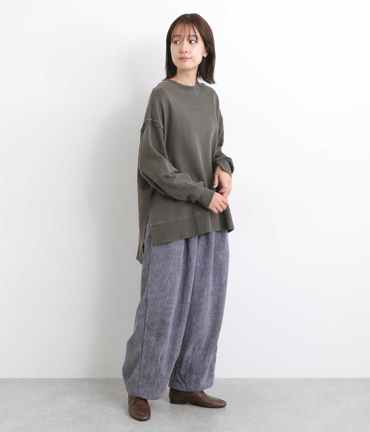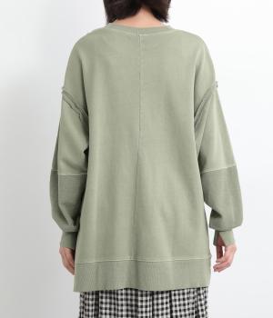 ソフトな手ざわりが心地いい裏毛素材。ピグメント加工によるユーズド感のある風合いが魅力です。肩口のラインと袖先の切り替え部分は裏面の素材を使用して表情に変化をつけました。