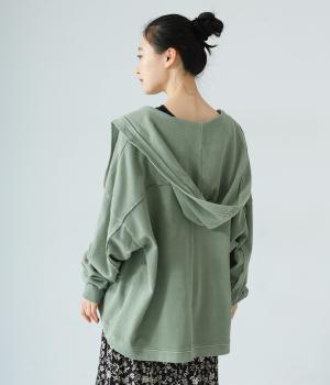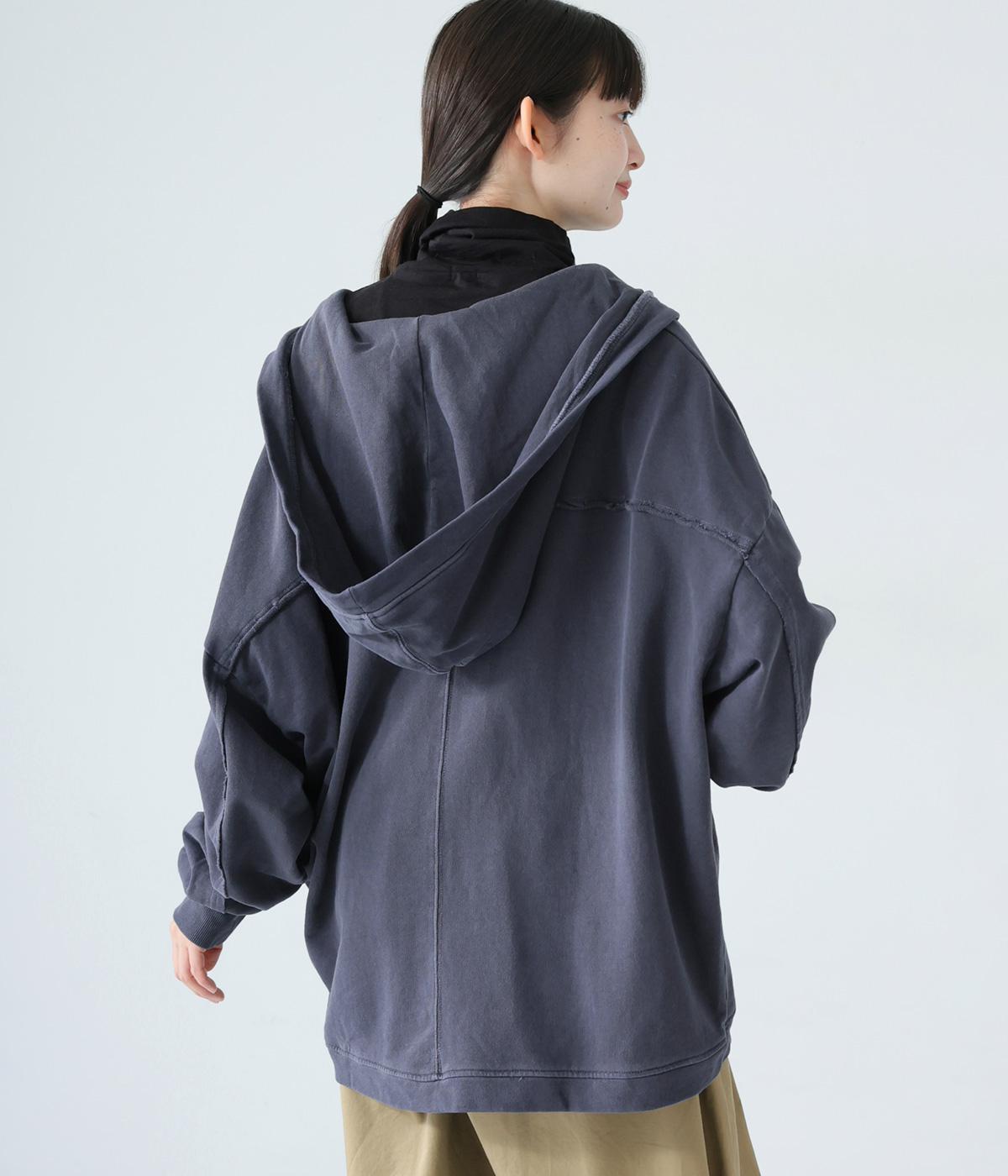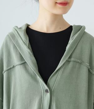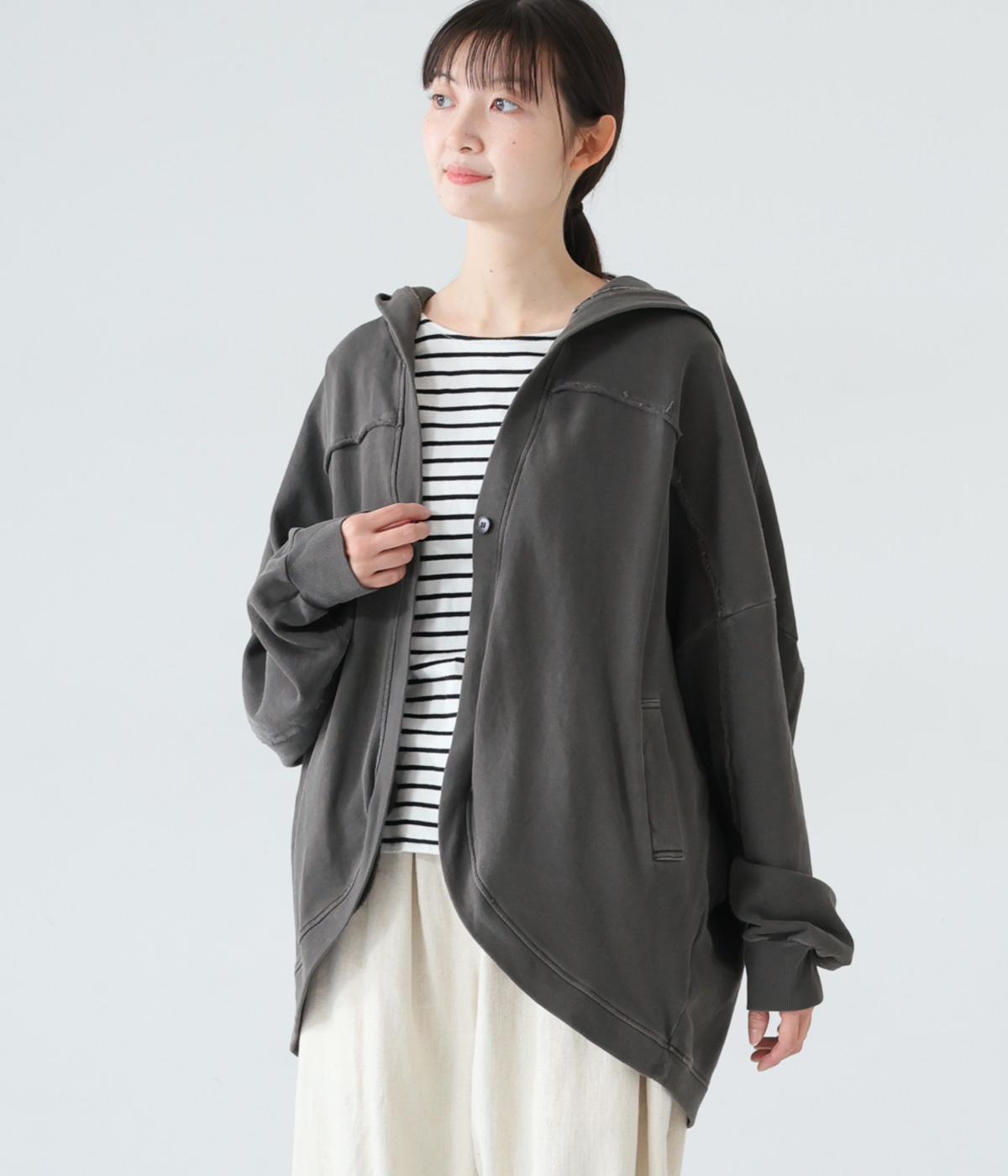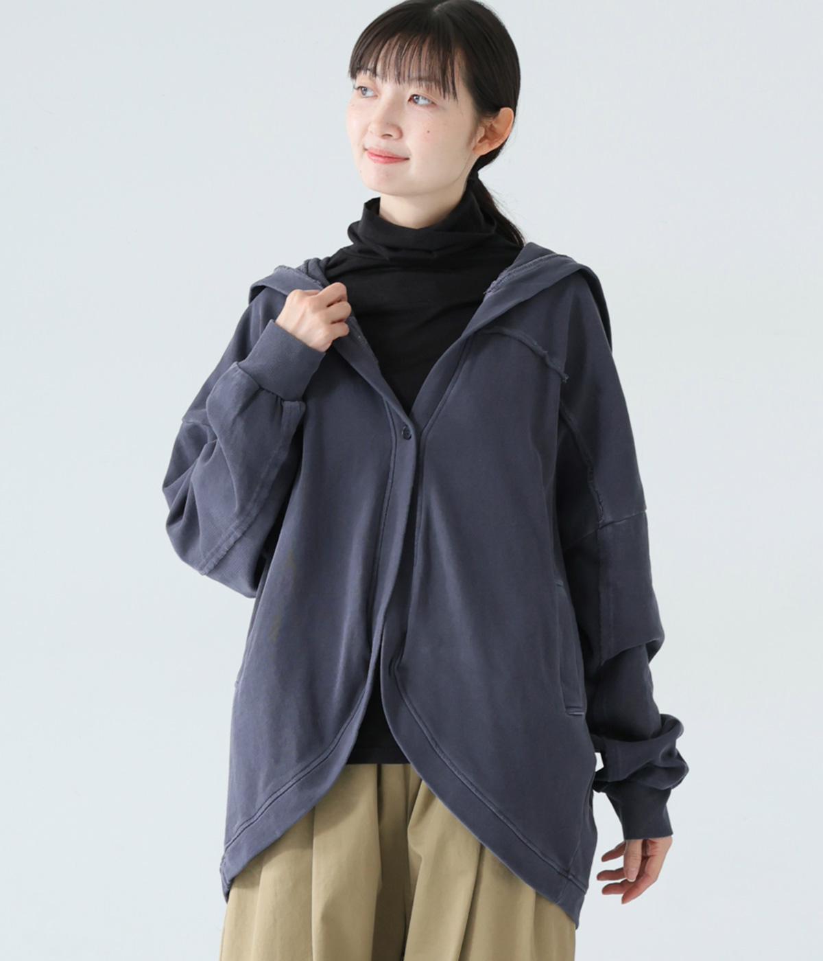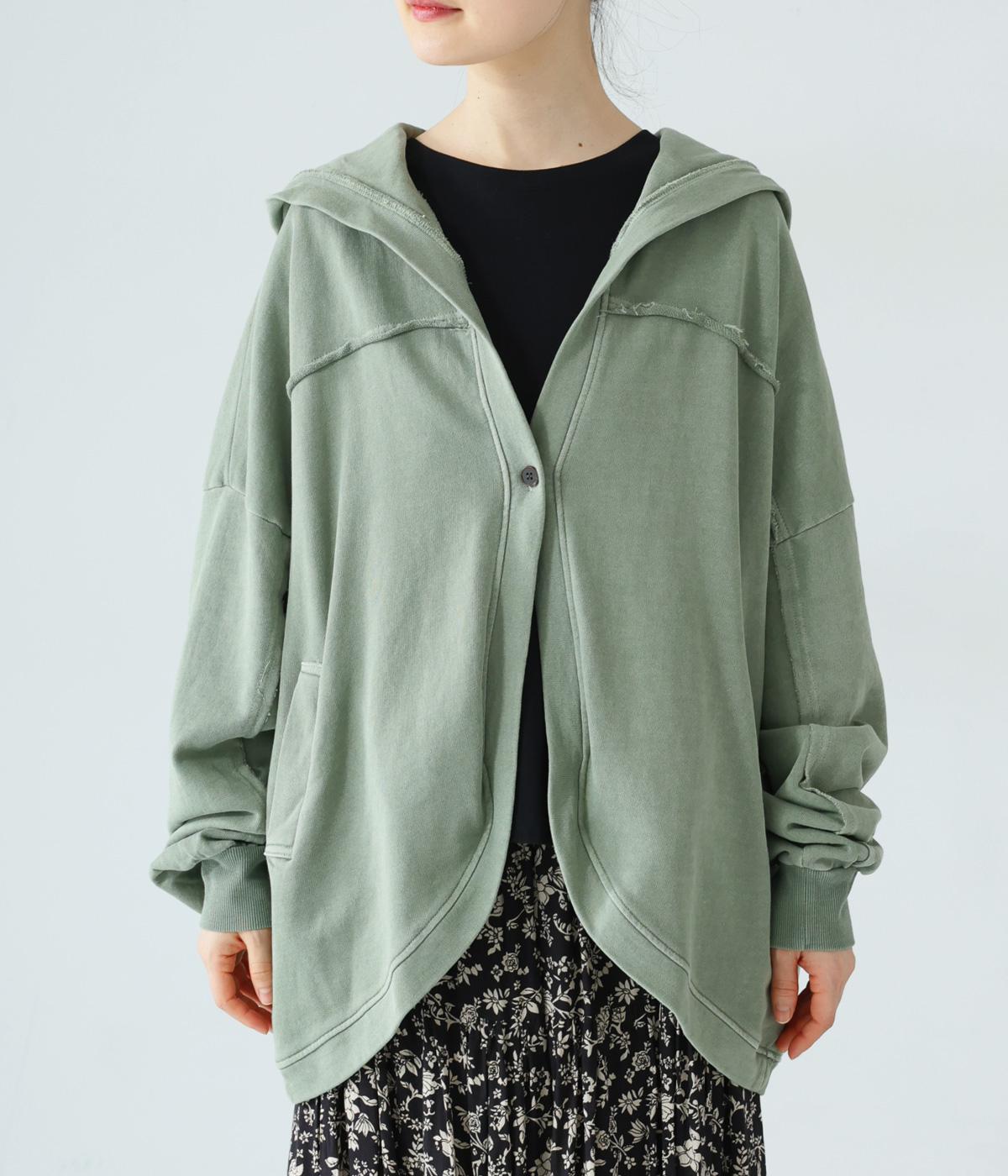 ひとつボタン仕様の抜け感のある表情が魅力。大きなフードとくしゅっとたまる長めの袖、ゆったりとしたシルエットがこなれ感を運びます。曲線を描く裾ラインで前からのルックスに軽さをプラス。おしゃれ感をグッと高める、カットオフの切り替えデザインにも注目です。