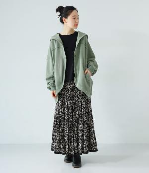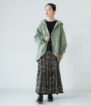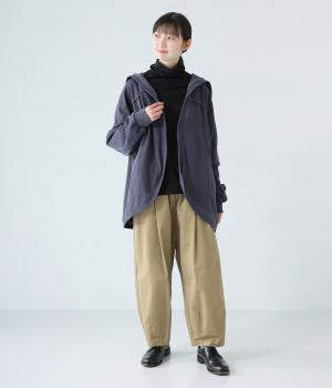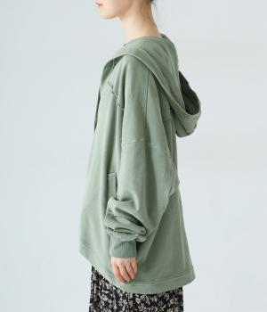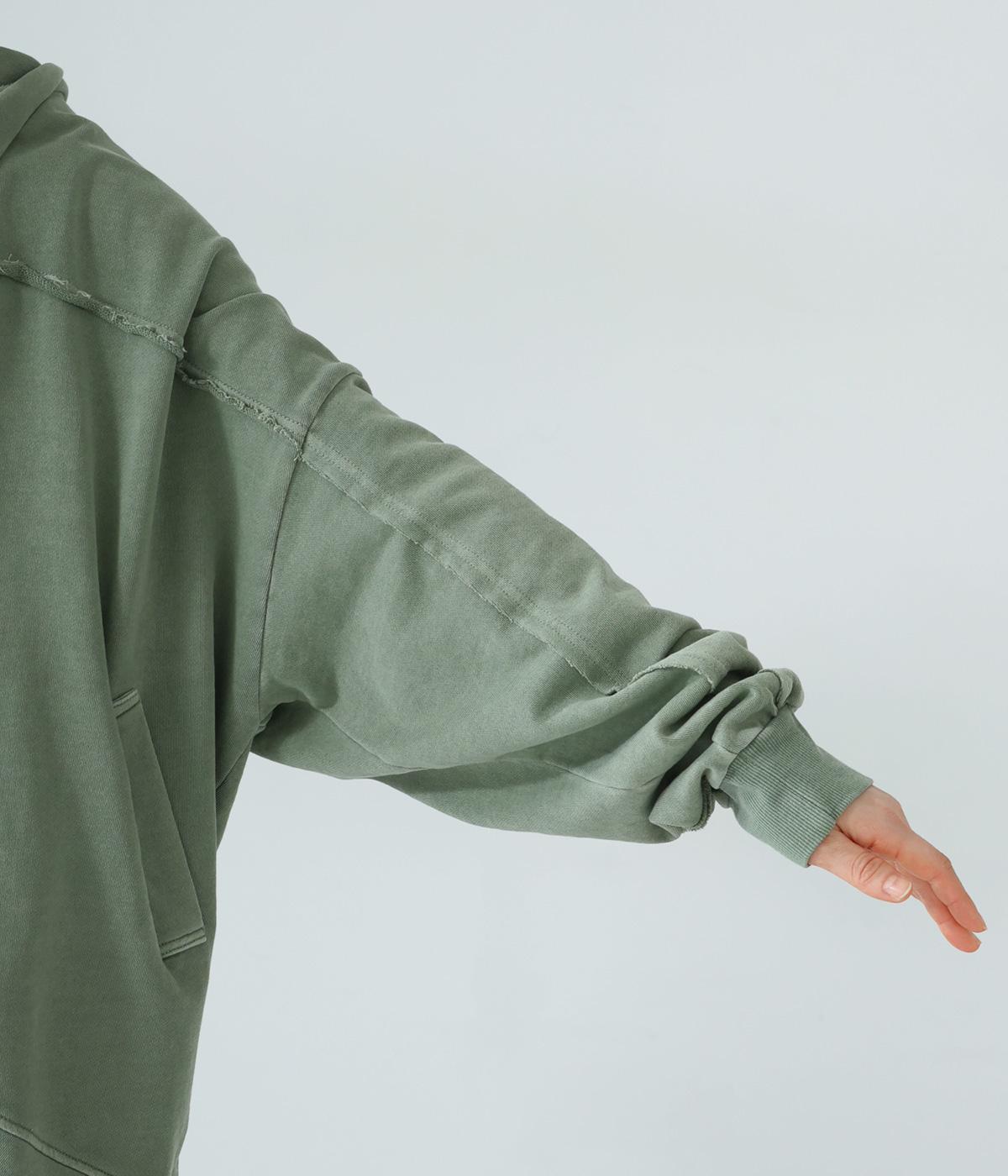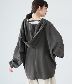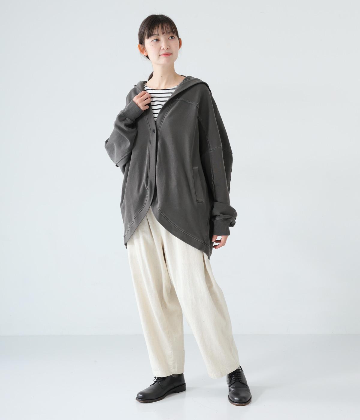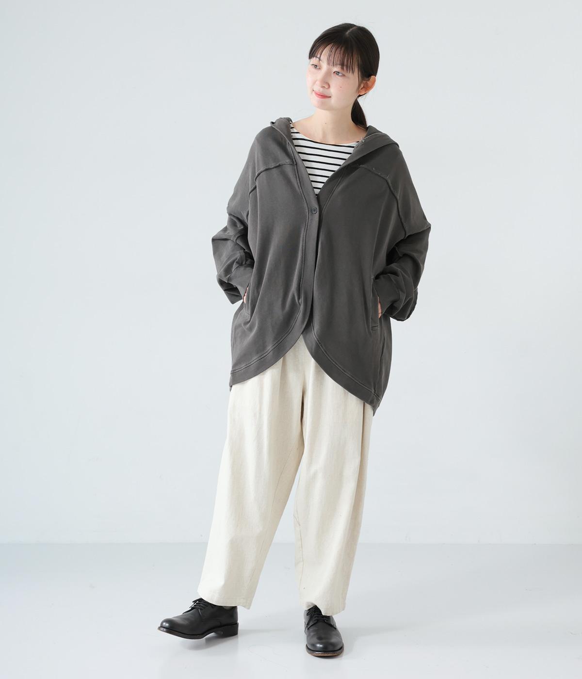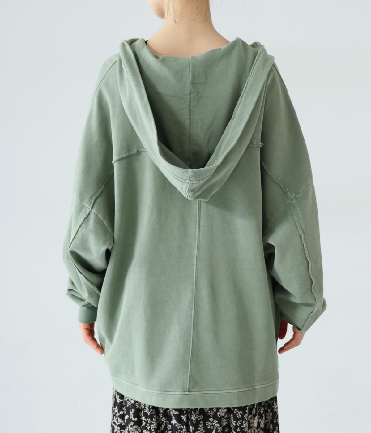 ひとつボタン仕様の抜け感のある表情が魅力。大きなフードとくしゅっとたまる長めの袖、ゆったりとしたシルエットがこなれ感を運びます。曲線を描く裾ラインで前からのルックスに軽さをプラス。おしゃれ感をグッと高める、カットオフの切り替えデザインにも注目です。