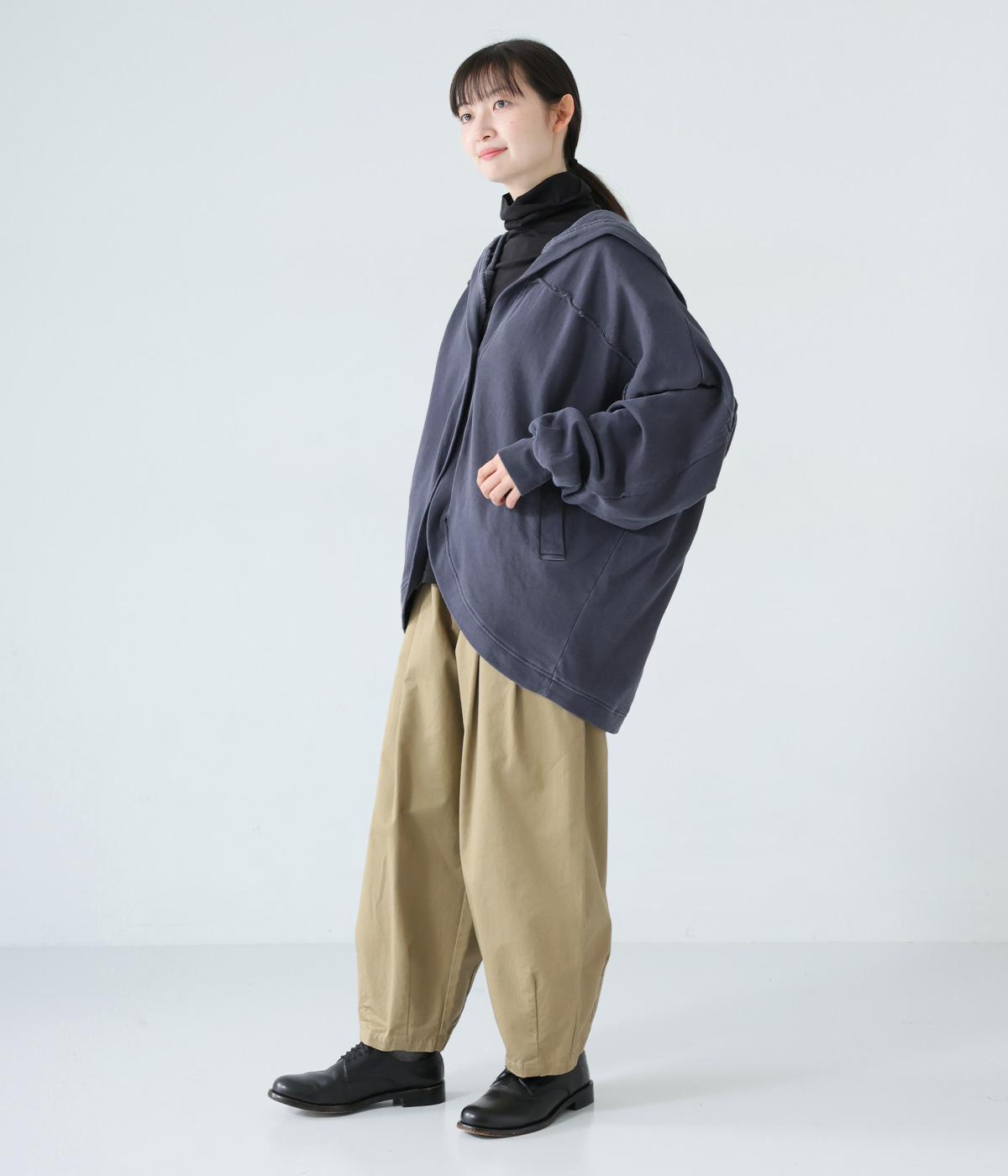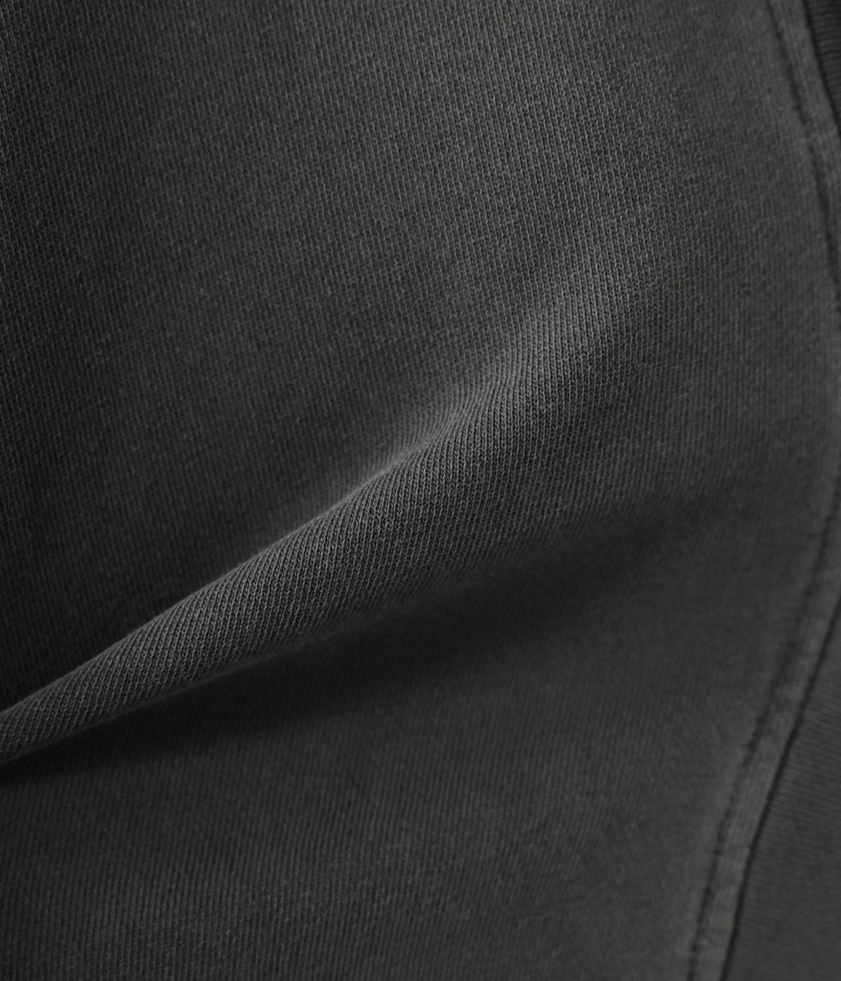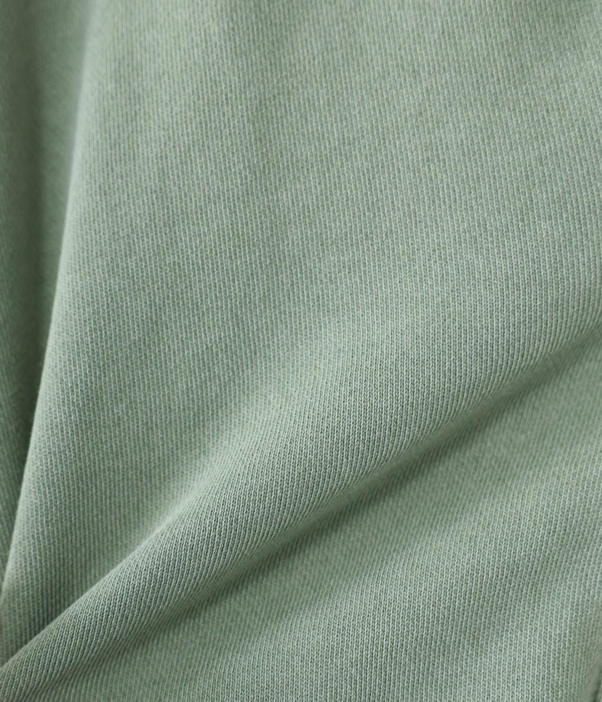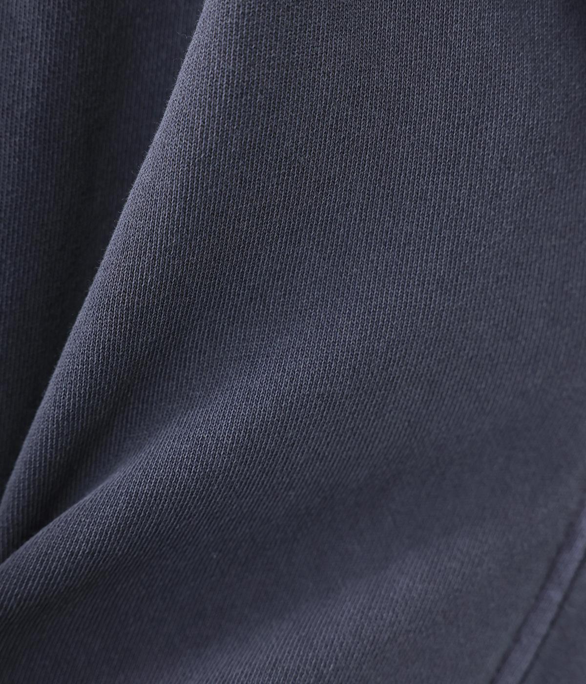 やわらかな風合いと通気性の高さが魅力のコットン裏毛生地で仕立てています。ピグメント加工によってヴィンテージ風のマットでかすれた色合いと独特な風合いを表現しました。