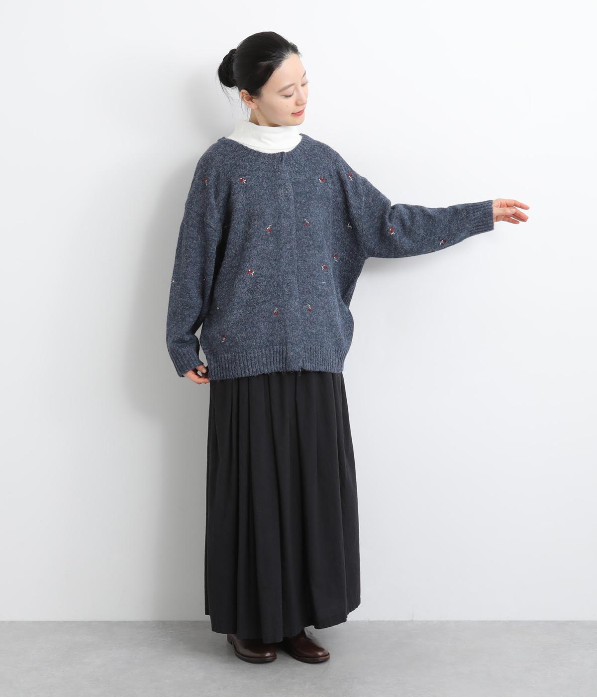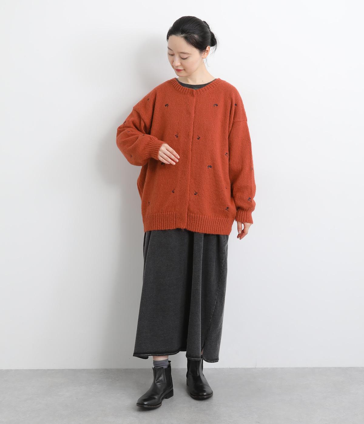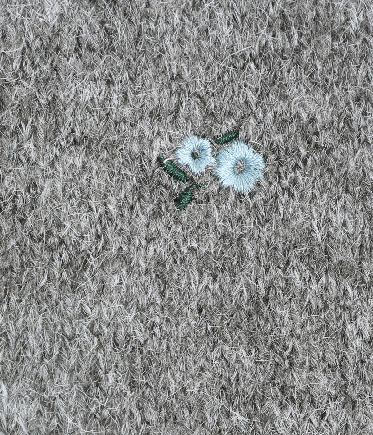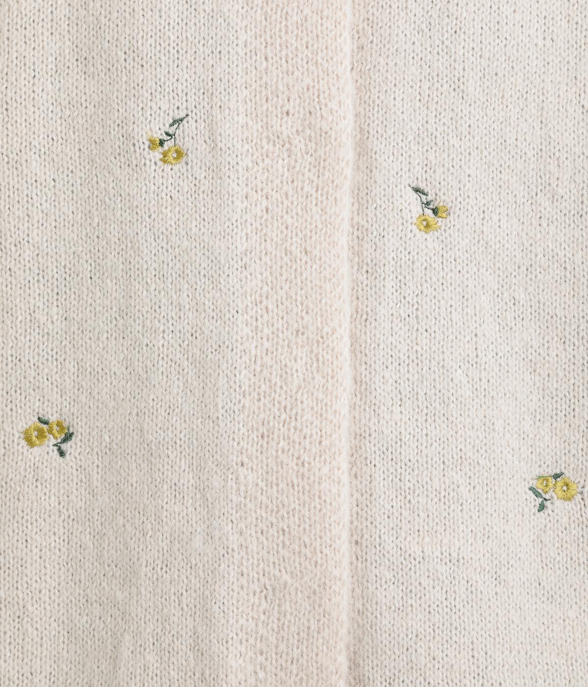 起毛感があり、あたたかみのある自然な風合いのニット生地です。軽やかでやわらかく体になじみ、やさしい着心地です。レトロでかわいらしい花柄の刺しゅうをところどころにほどこしました。