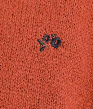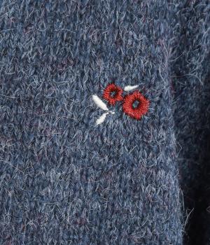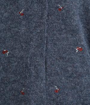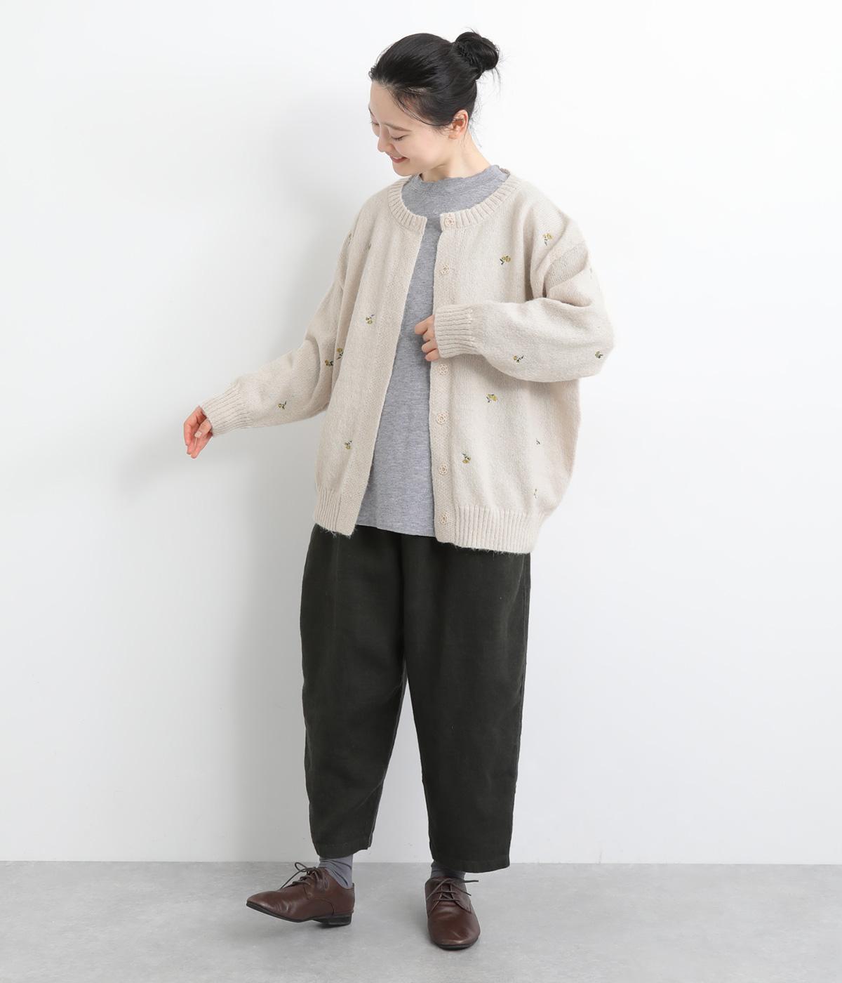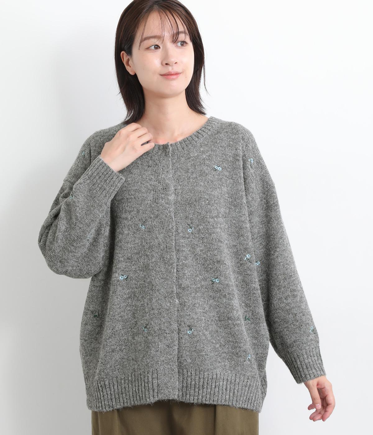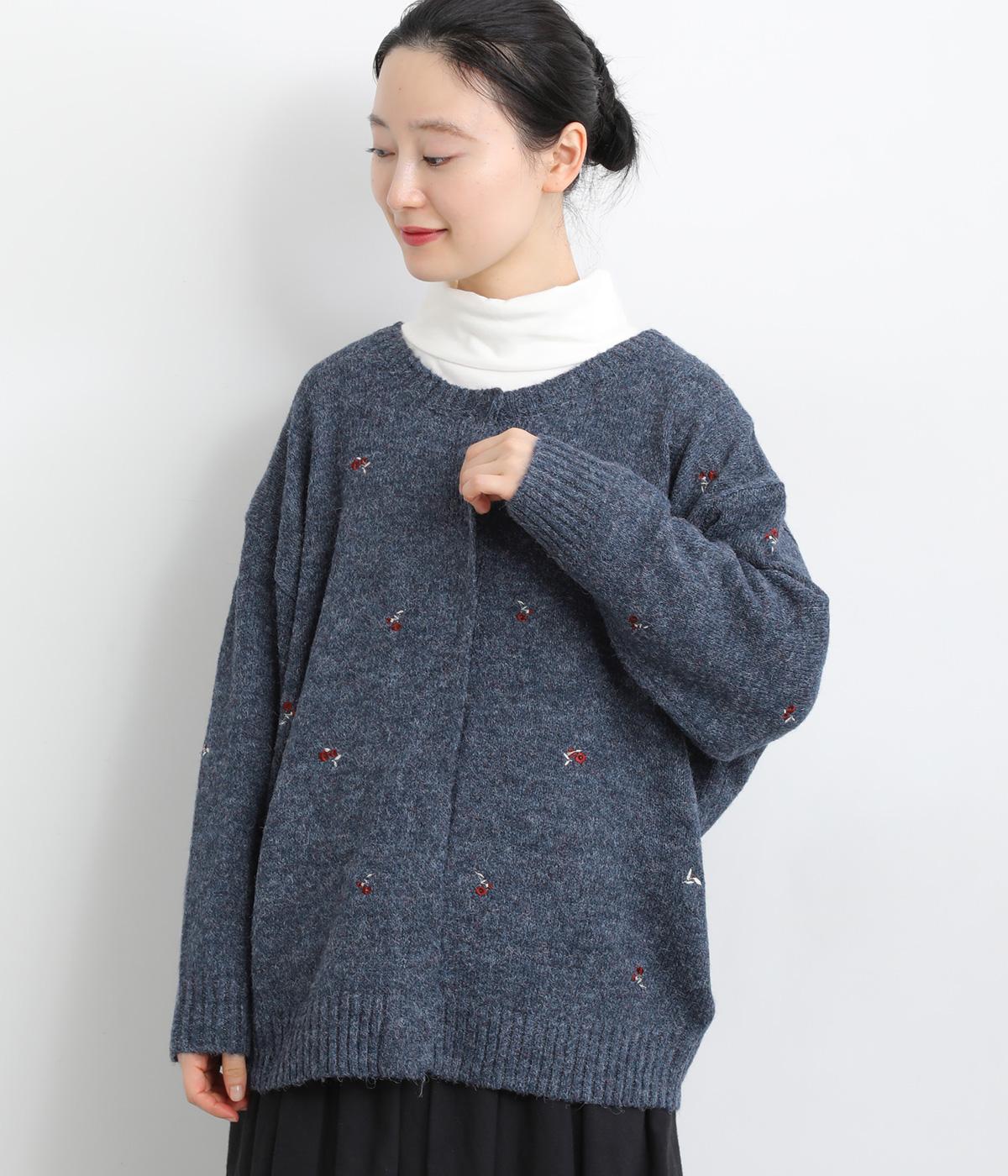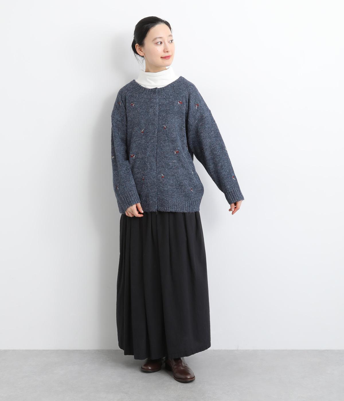 起毛感があり、あたたかみのある自然な風合いのニット生地です。軽やかでやわらかく体になじみ、やさしい着心地です。レトロでかわいらしい花柄の刺しゅうをところどころにほどこしました。