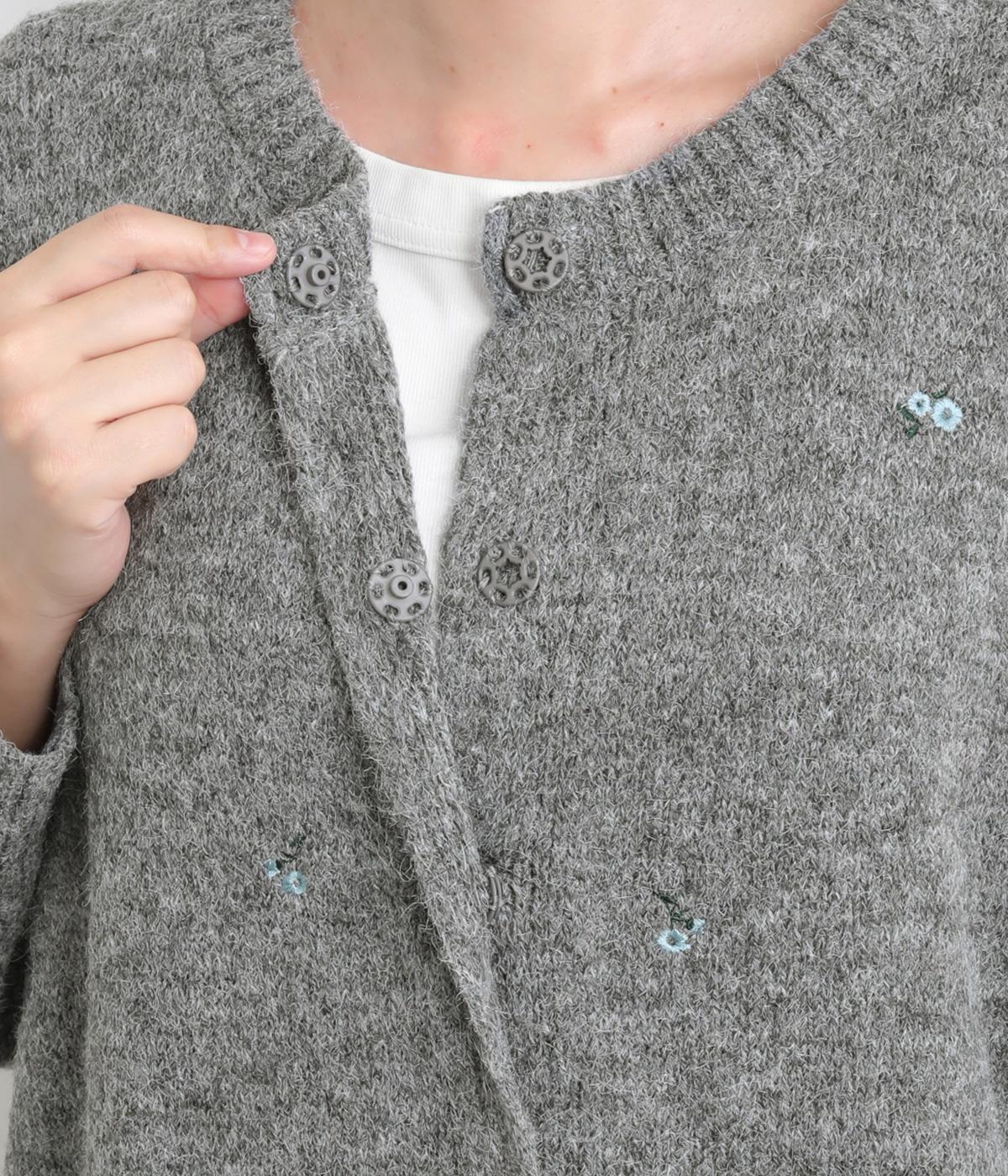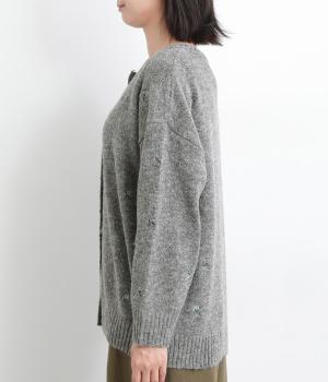 かわいらしい花柄刺しゅうとあたたかみのある素材感で素朴な風合いに仕上がりました。前開きボタンは比翼仕立てですっきりと見せ、ボタンを開けて羽織ってもサマになります。ゆったりとしたシルエットと長めの丈でリラックス感のある着心地です。