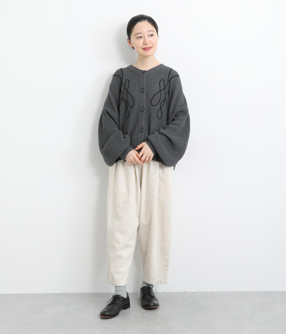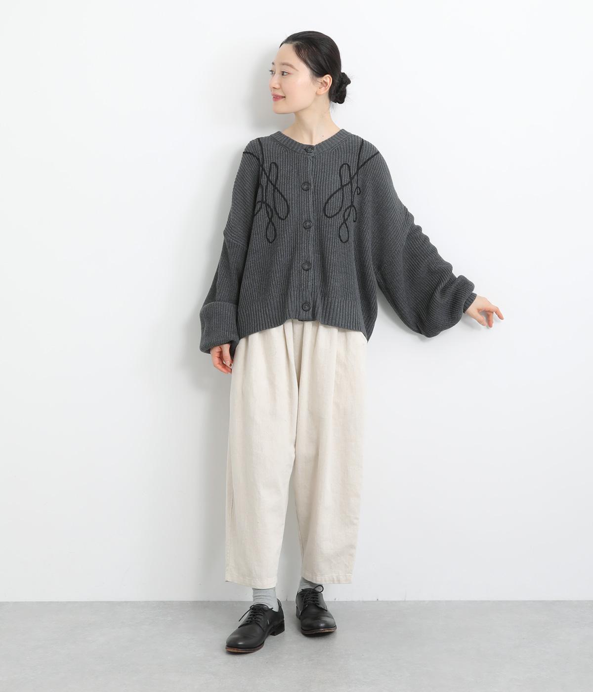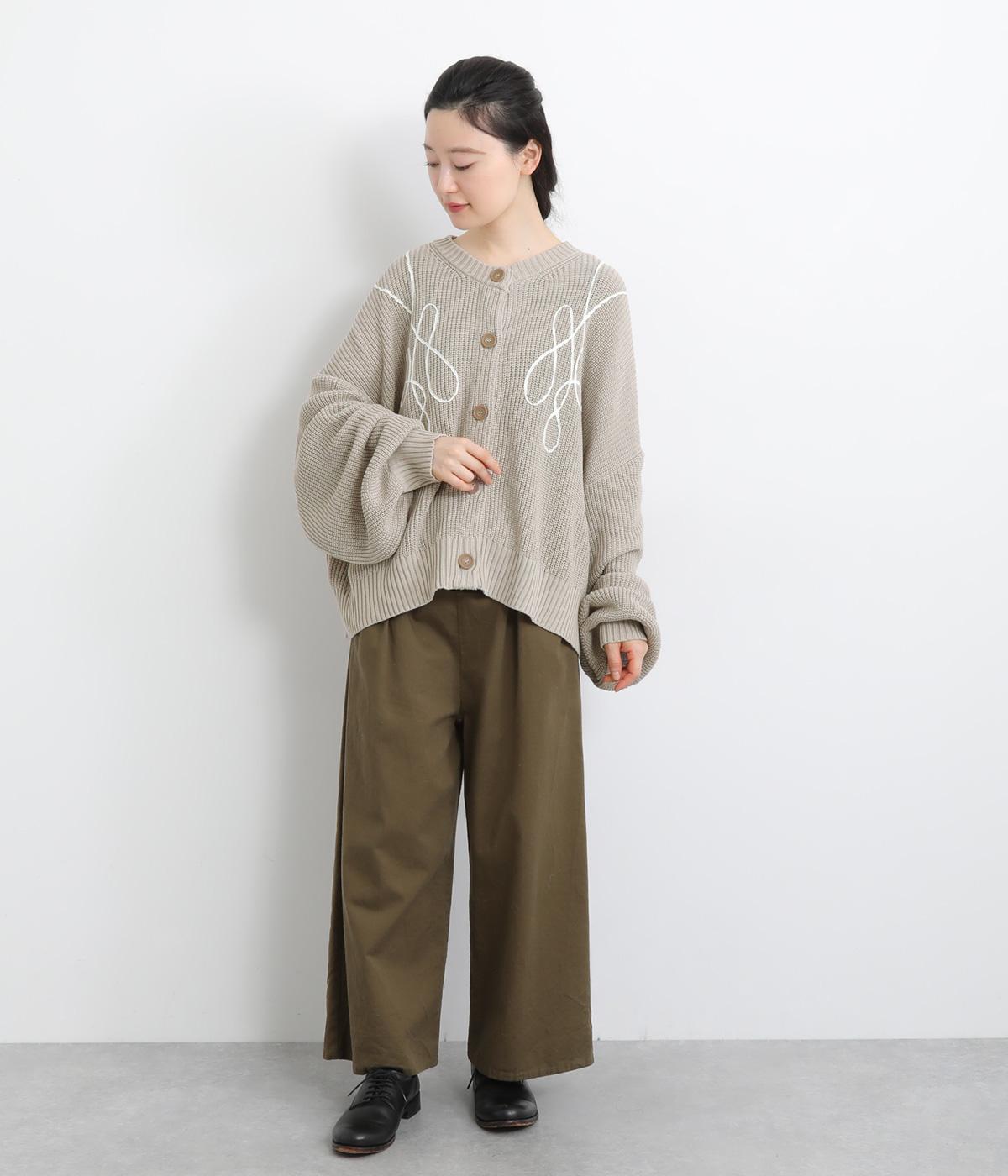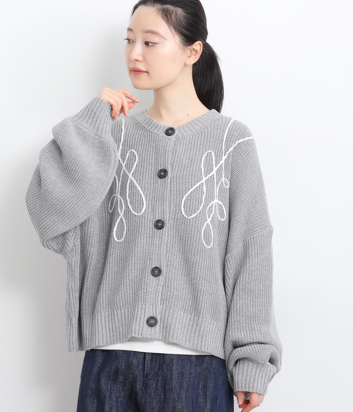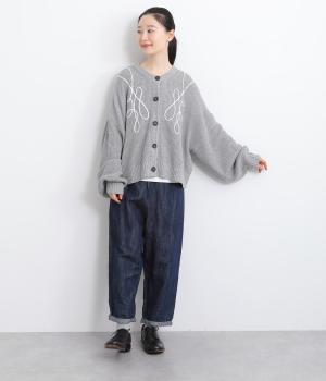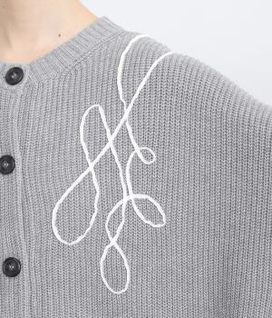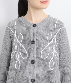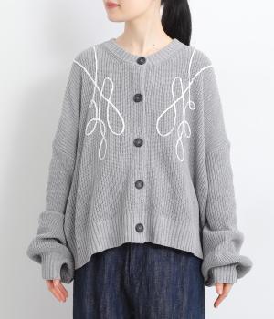コード刺しゅうのラインデザインが印象的なカーディガン。ゆったりとしたルーズシルエットにボリューム袖が特徴で、リラックス&フェミニンな印象を醸します。ラフに羽織っても前を留めてメインにしてもさまになる一枚。