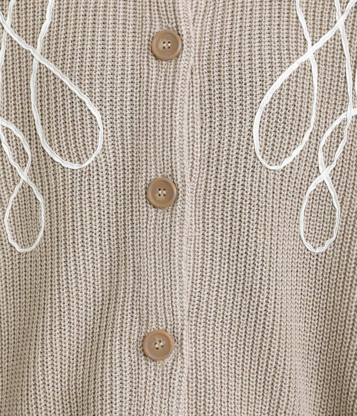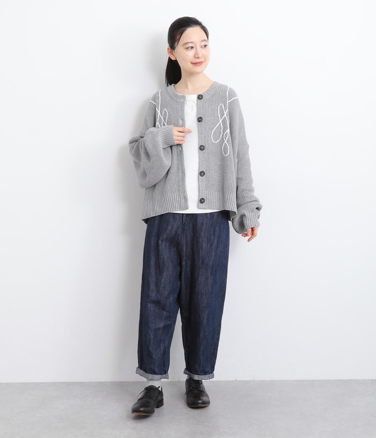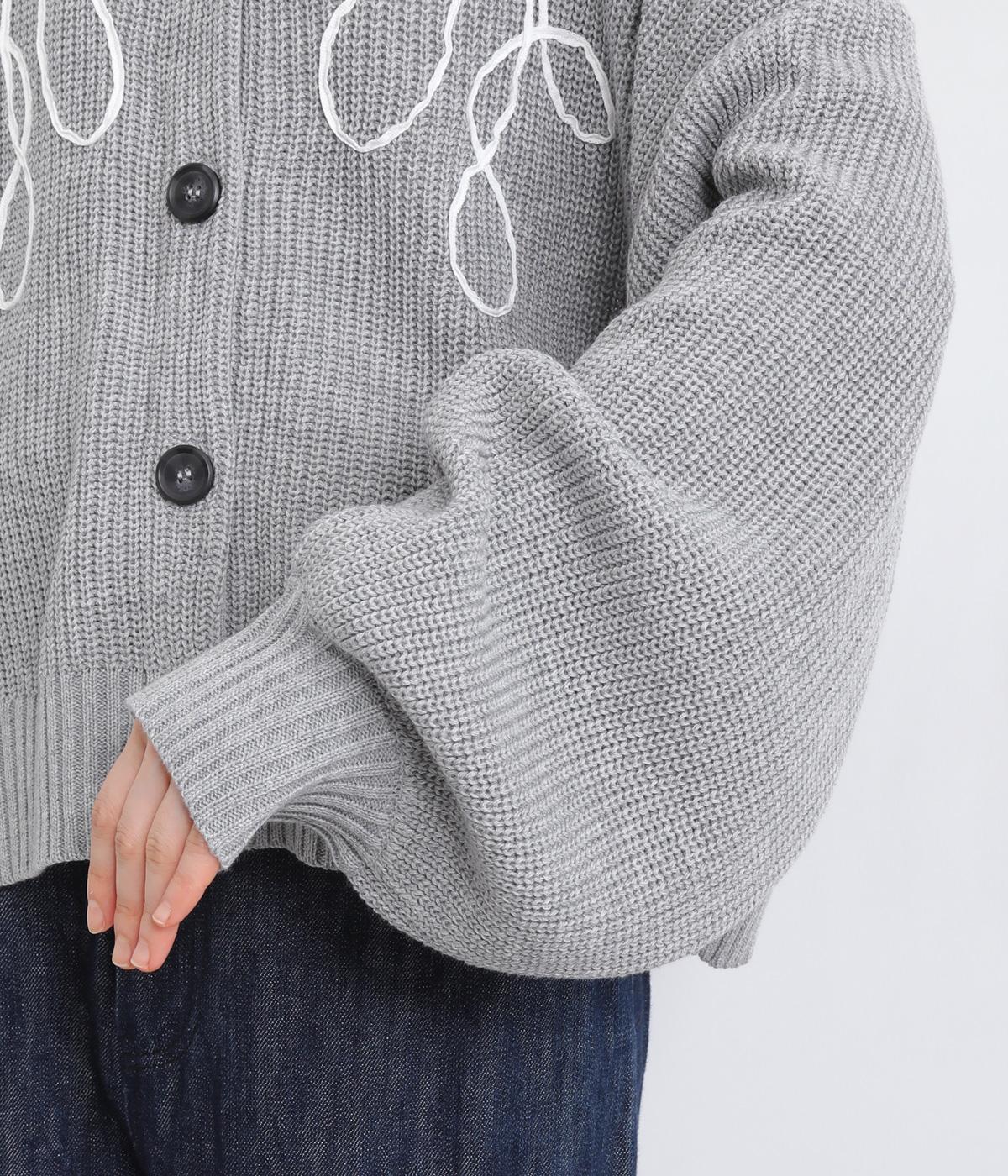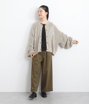 コード刺しゅうのラインデザインが印象的なカーディガン。ゆったりとしたルーズシルエットにボリューム袖が特徴で、リラックス&フェミニンな印象を醸します。ラフに羽織っても前を留めてメインにしてもさまになる一枚。