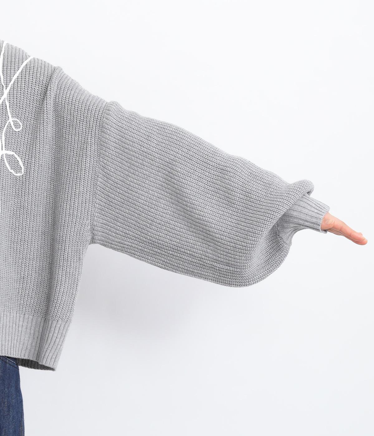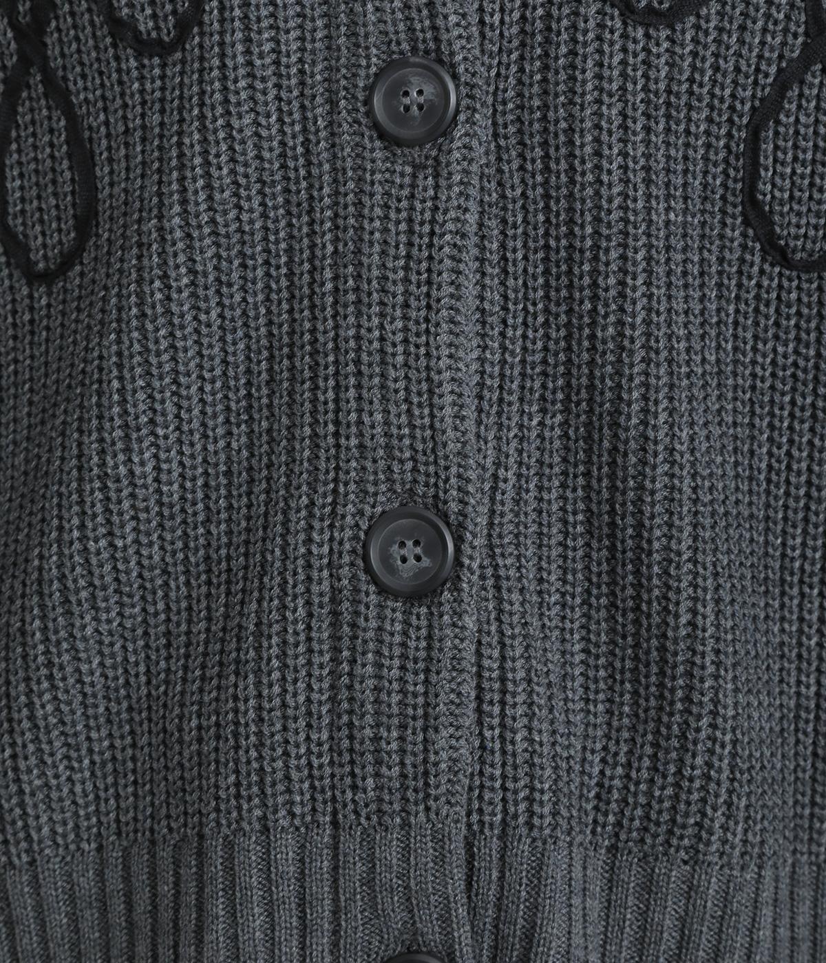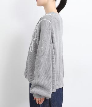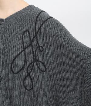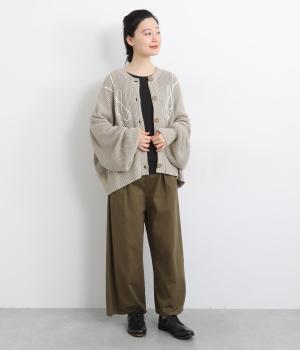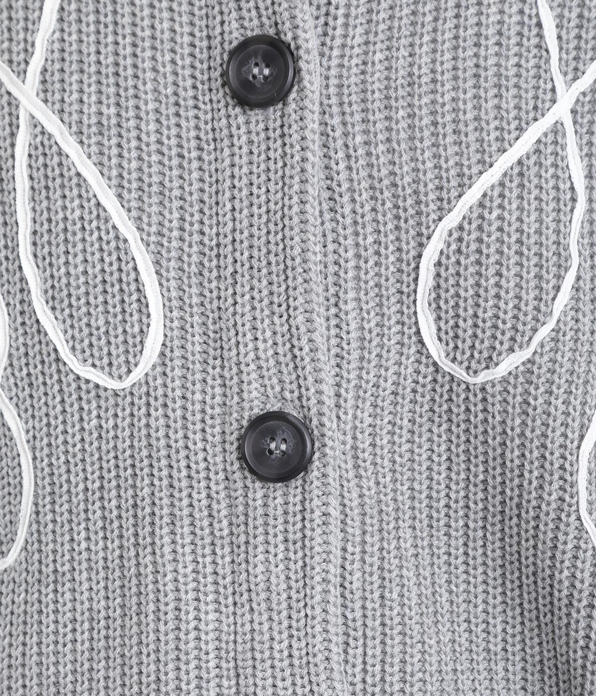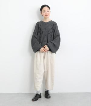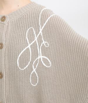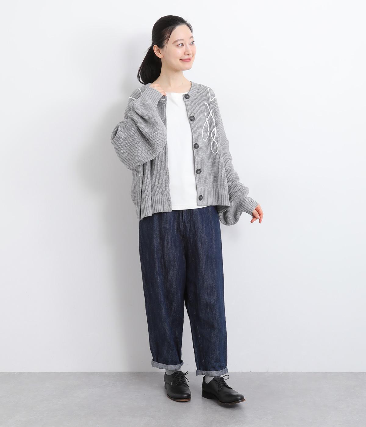 コード刺しゅうのラインデザインが印象的なカーディガン。ゆったりとしたルーズシルエットにボリューム袖が特徴で、リラックス&フェミニンな印象を醸します。ラフに羽織っても前を留めてメインにしてもさまになる一枚。