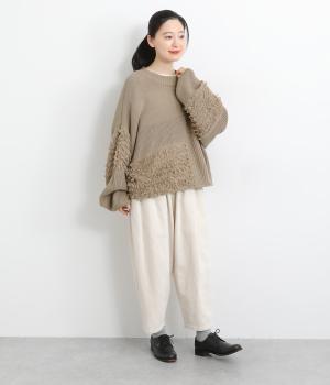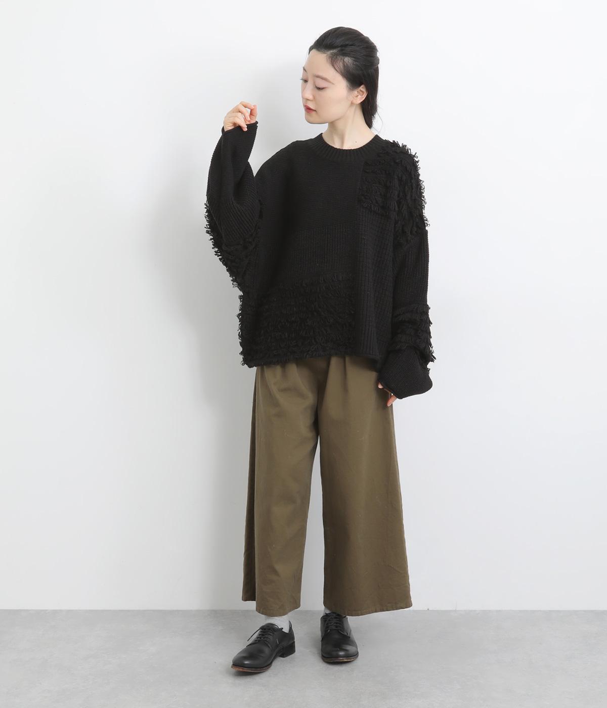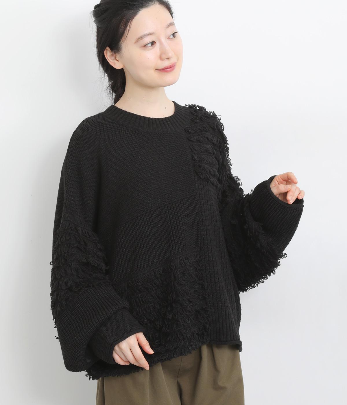 異なる編み組織でパッチワーク風に切り替え、ループ状のフリンジも加えて表情豊かに仕立てました。アクリル素材ならではのふんわりとした軽さが魅力です。