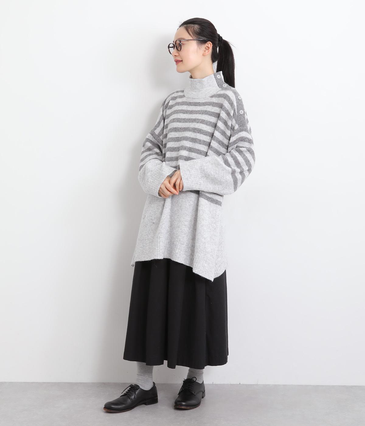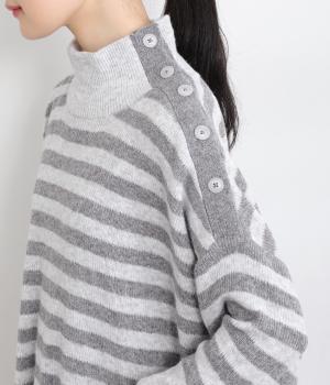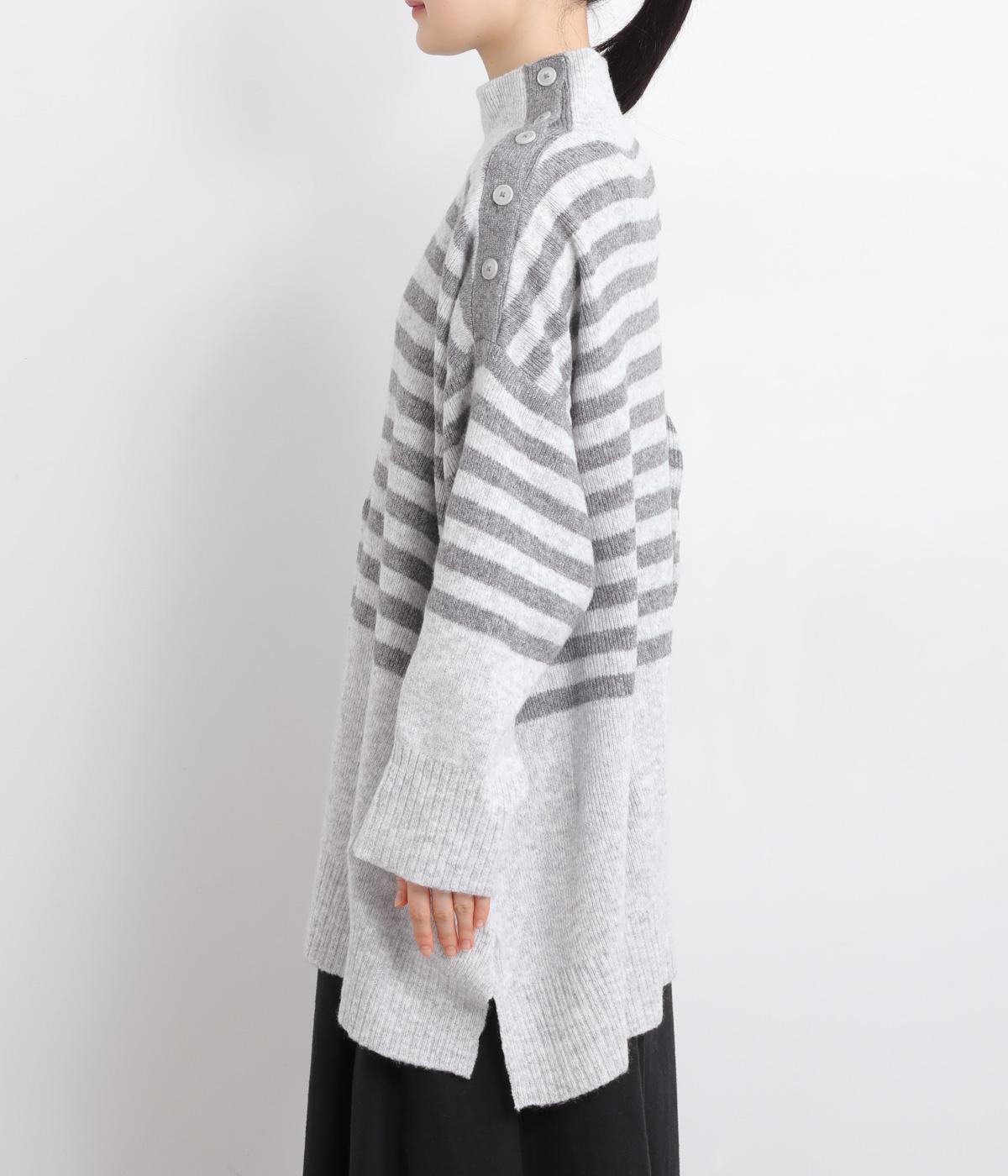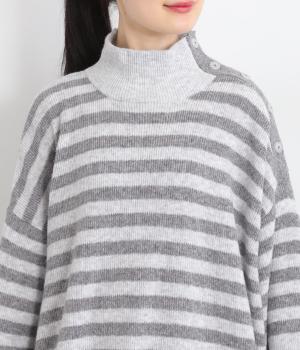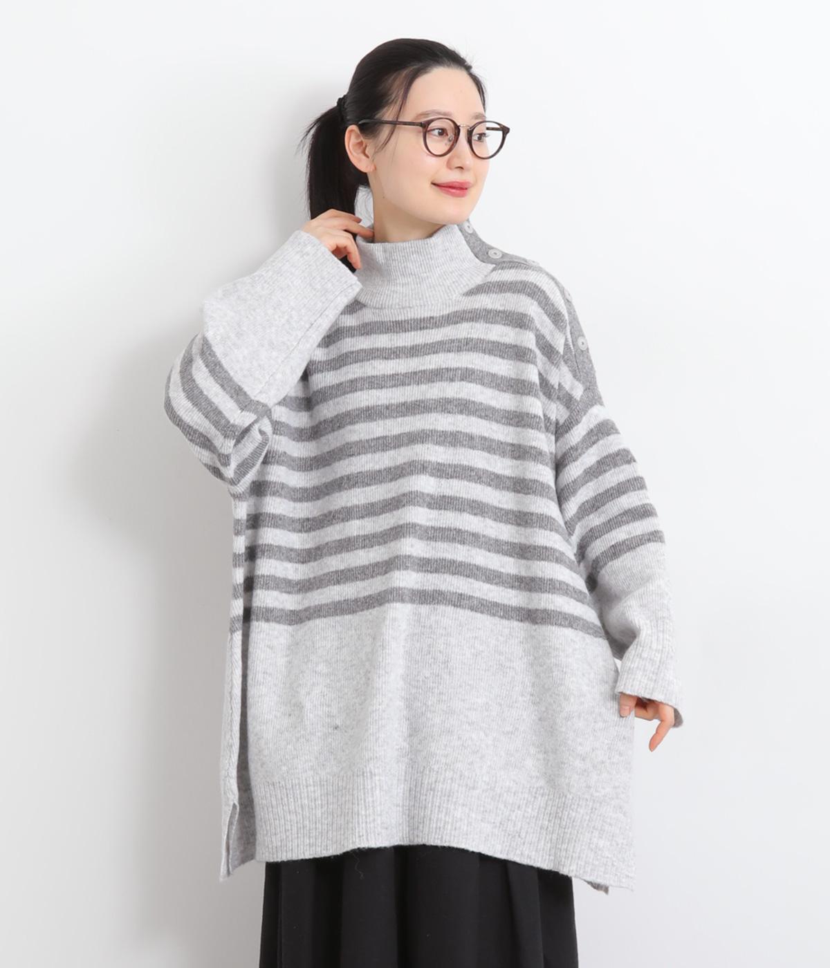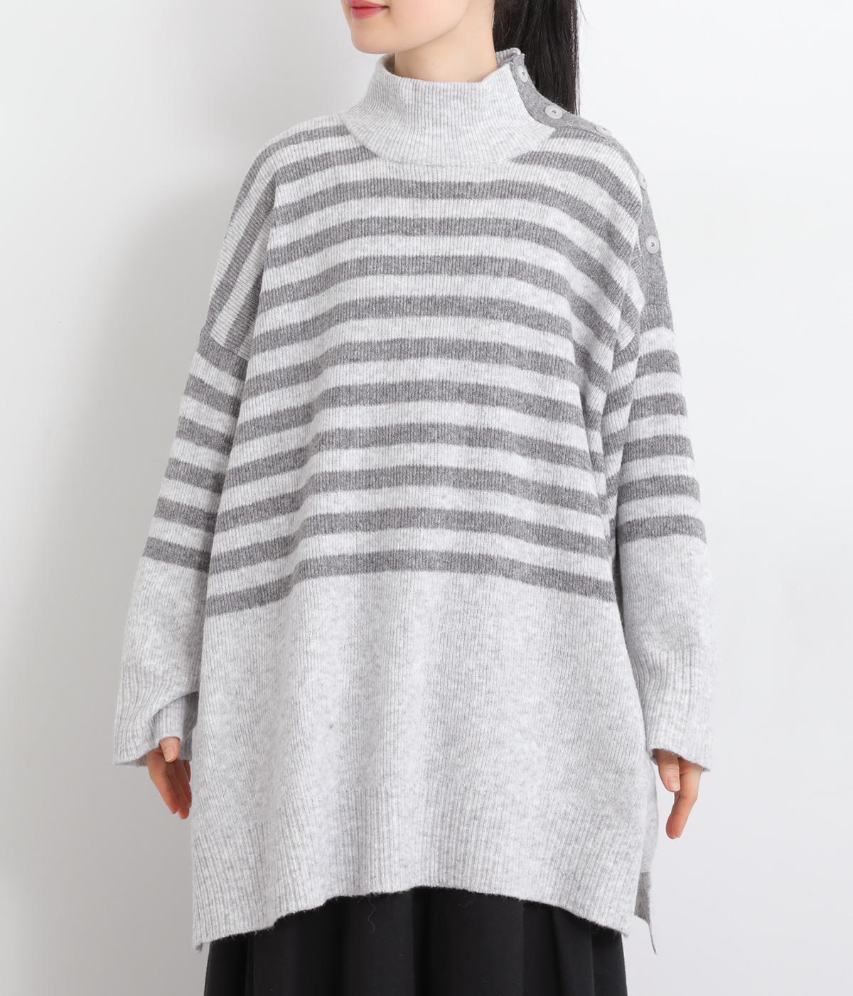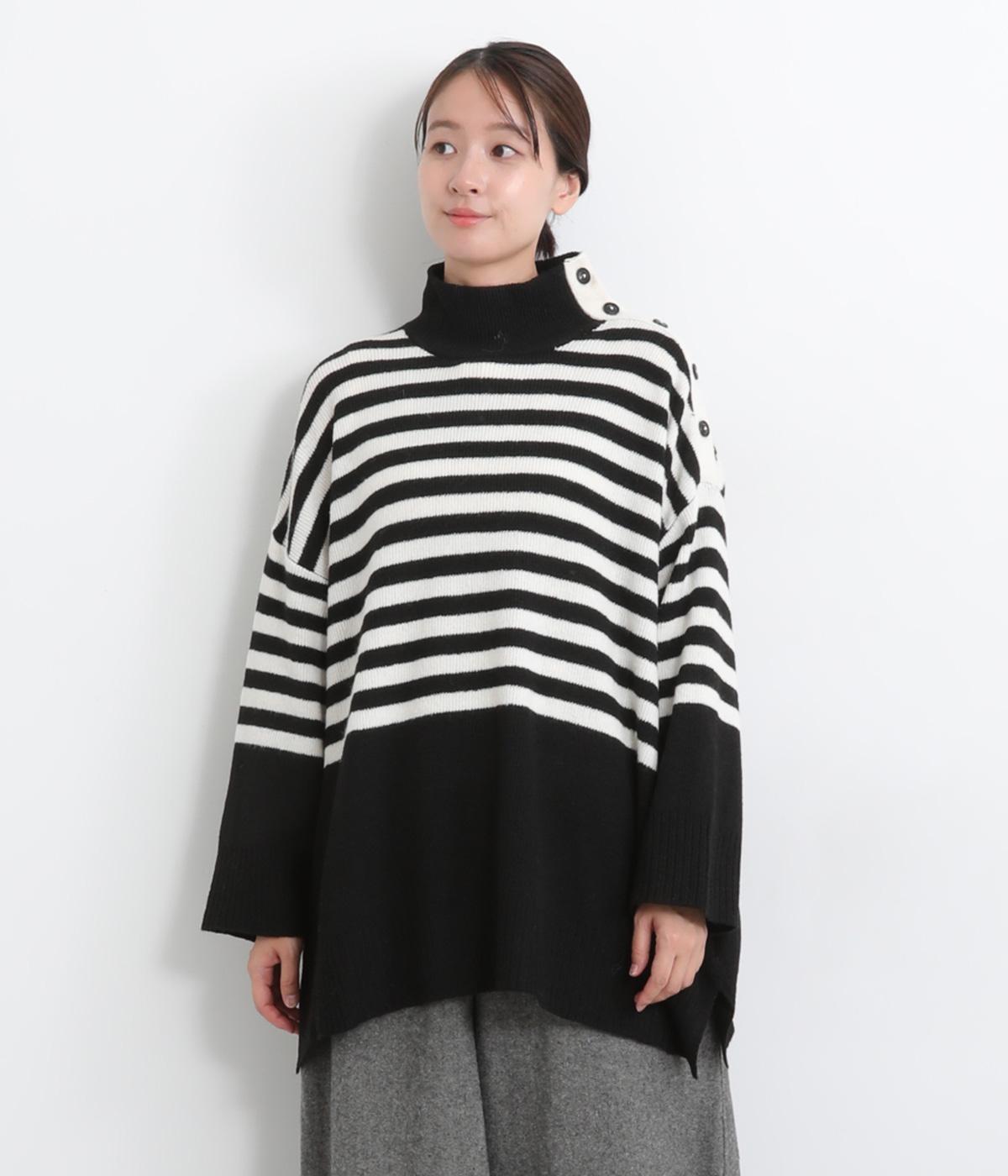 配色ボーダーに肩あきのボタンがデザインポイントの一枚。ゆったりとしたシルエットは自然なドレープが生まれてニュアンス良く着こなせます。首元まであたためてくれるハイネックは、ボタン開閉で被りやすさも◎。