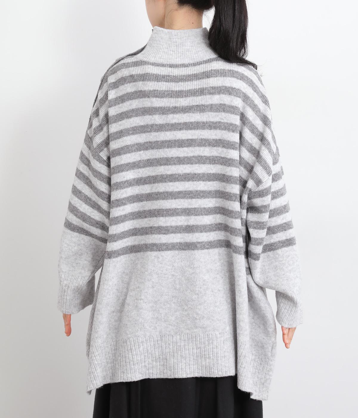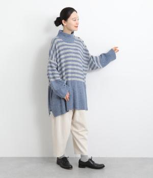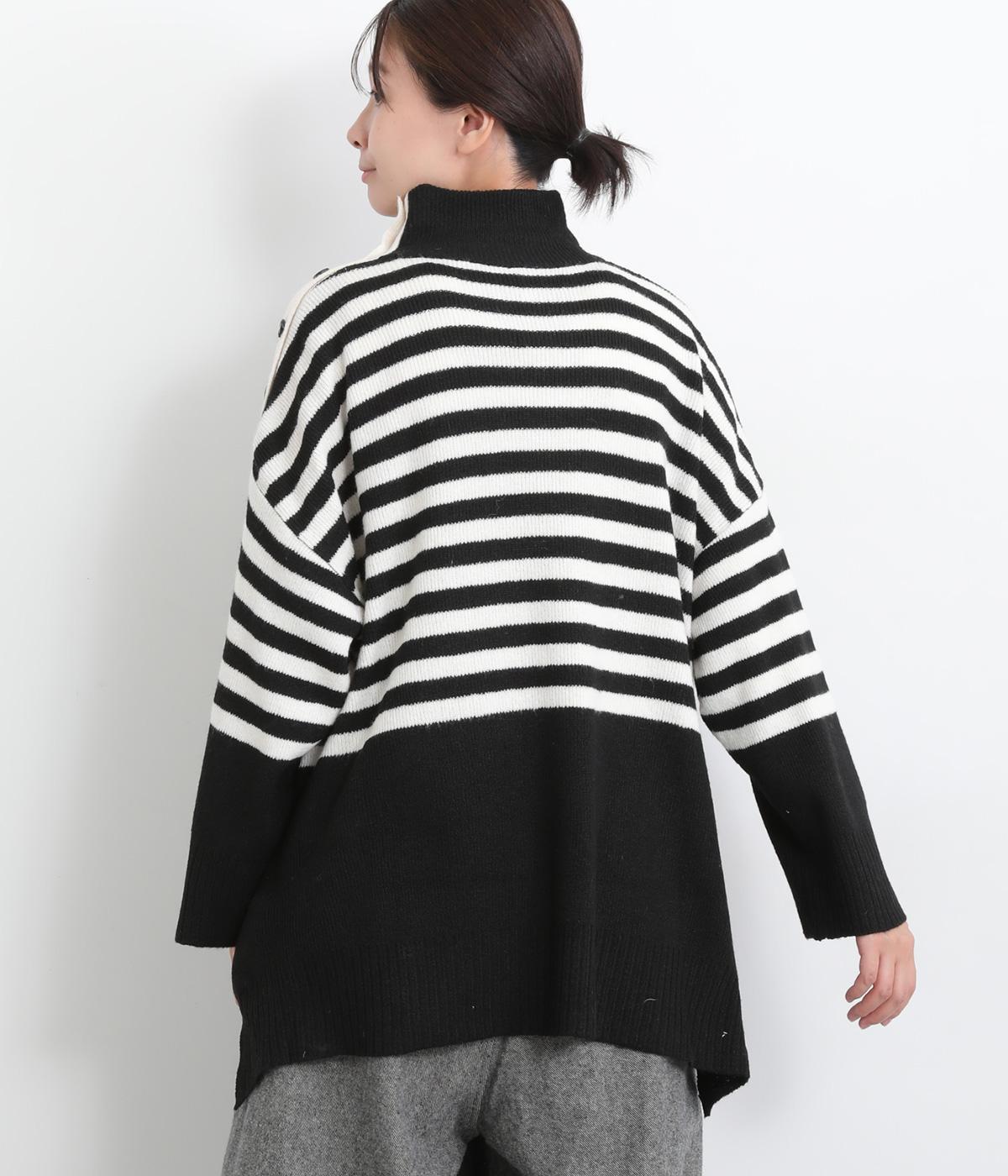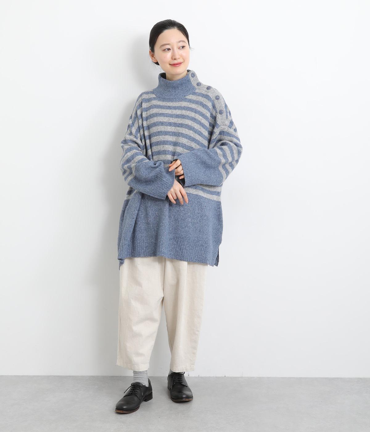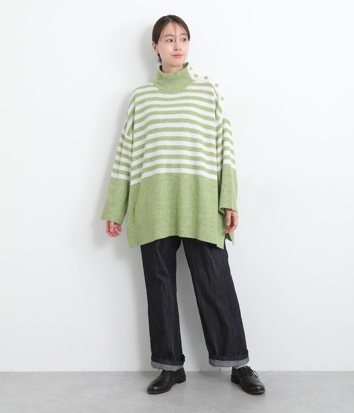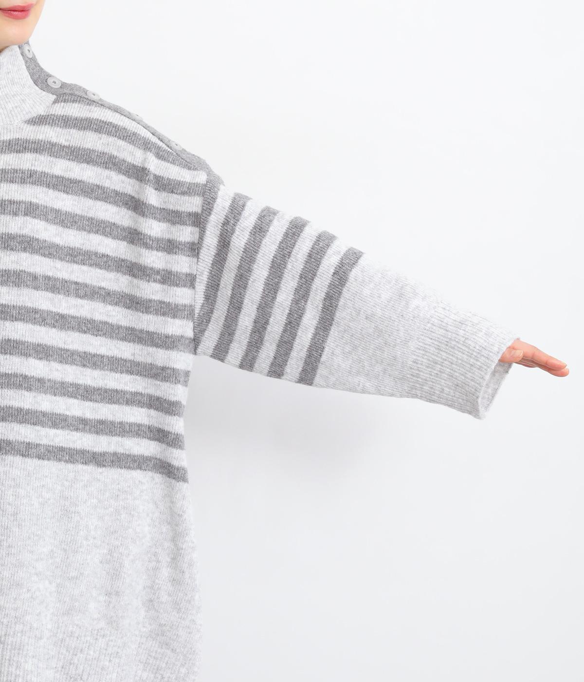 配色ボーダーに肩あきのボタンがデザインポイントの一枚。ゆったりとしたシルエットは自然なドレープが生まれてニュアンス良く着こなせます。首元まであたためてくれるハイネックは、ボタン開閉で被りやすさも◎。