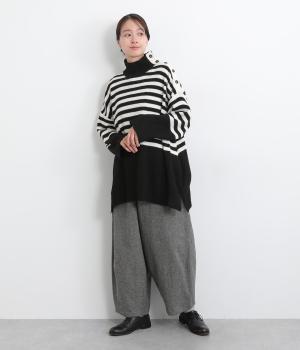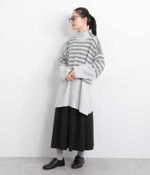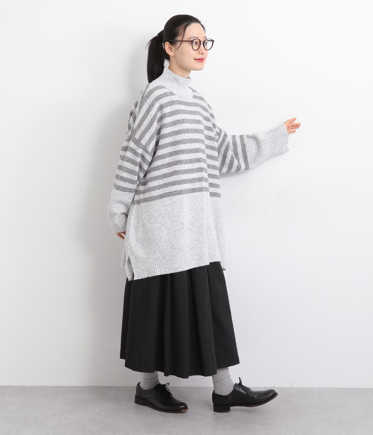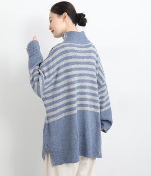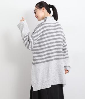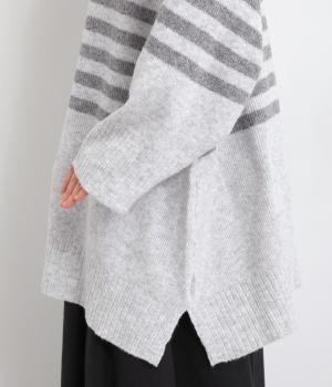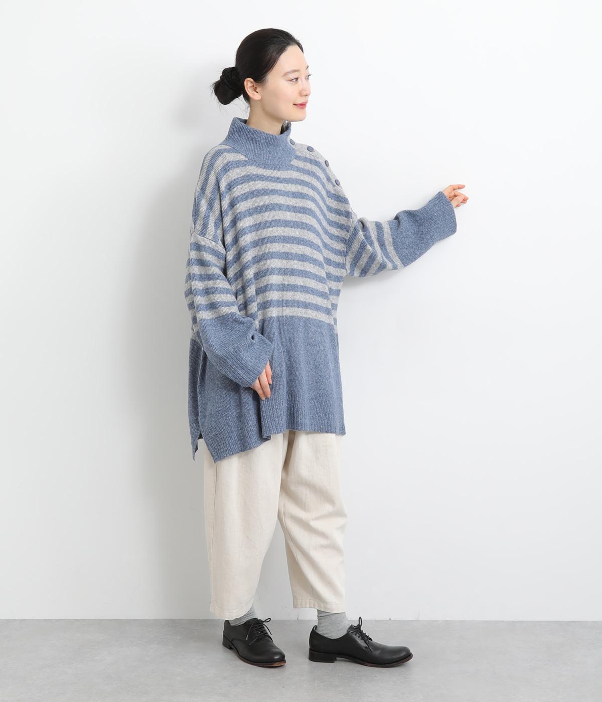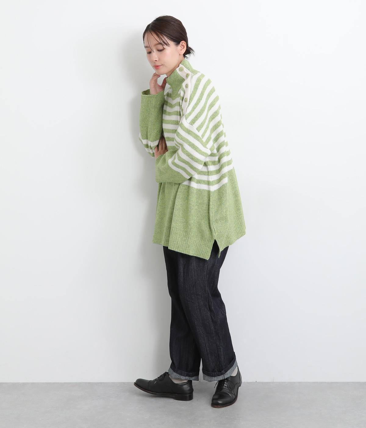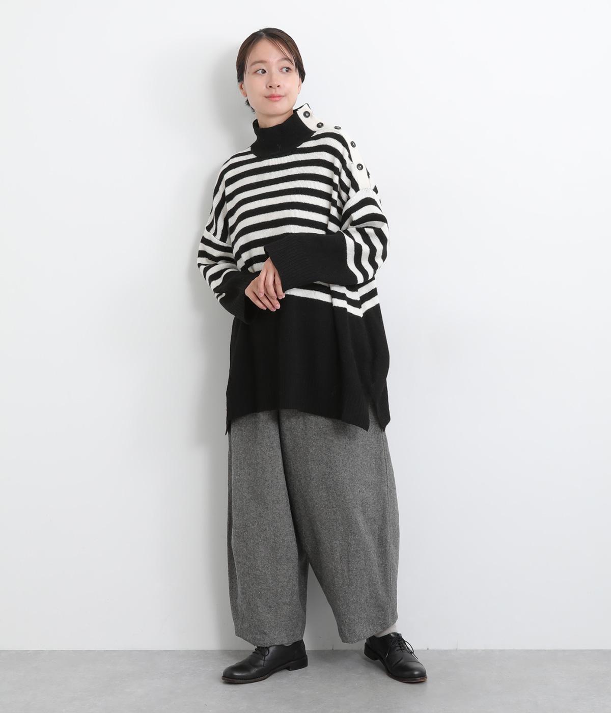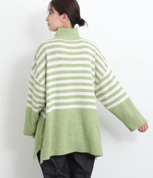配色ボーダーに肩あきのボタンがデザインポイントの一枚。ゆったりとしたシルエットは自然なドレープが生まれてニュアンス良く着こなせます。首元まであたためてくれるハイネックは、ボタン開閉で被りやすさも◎。