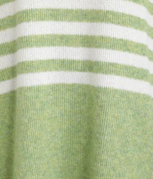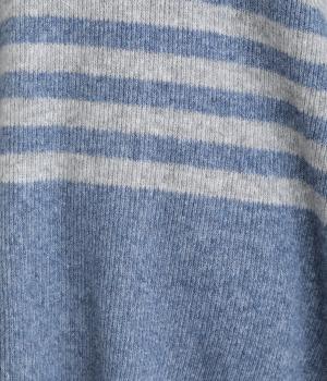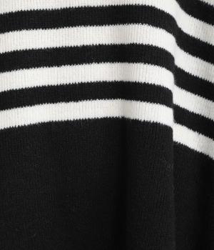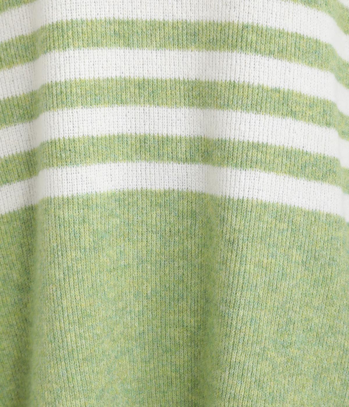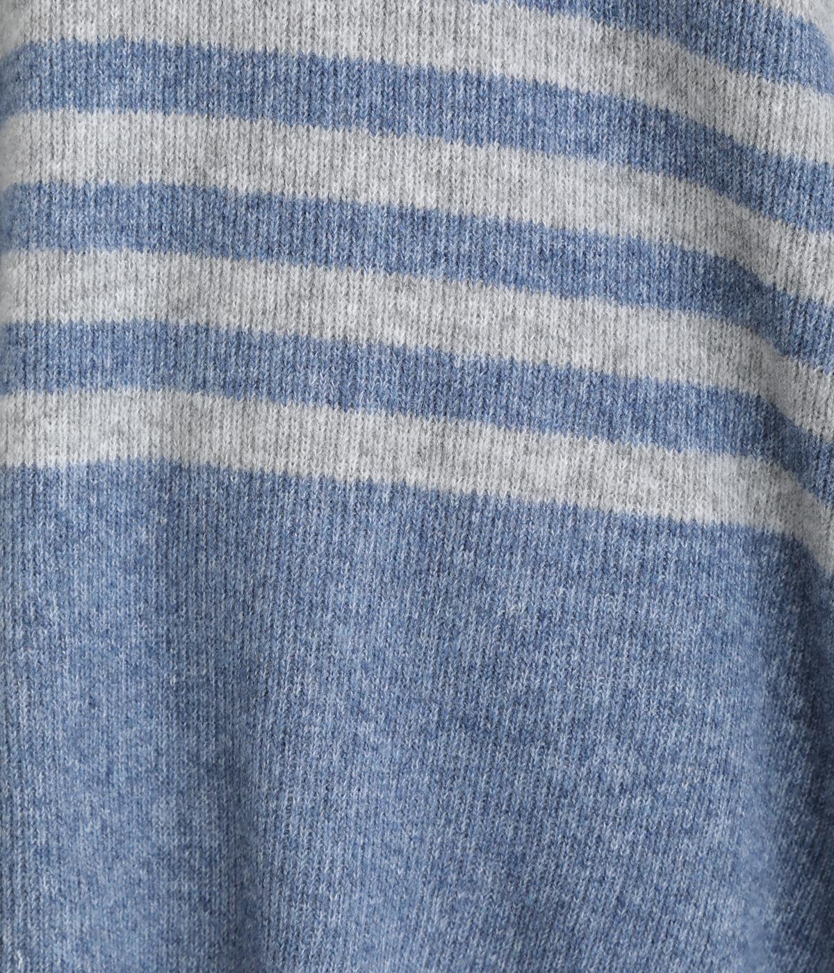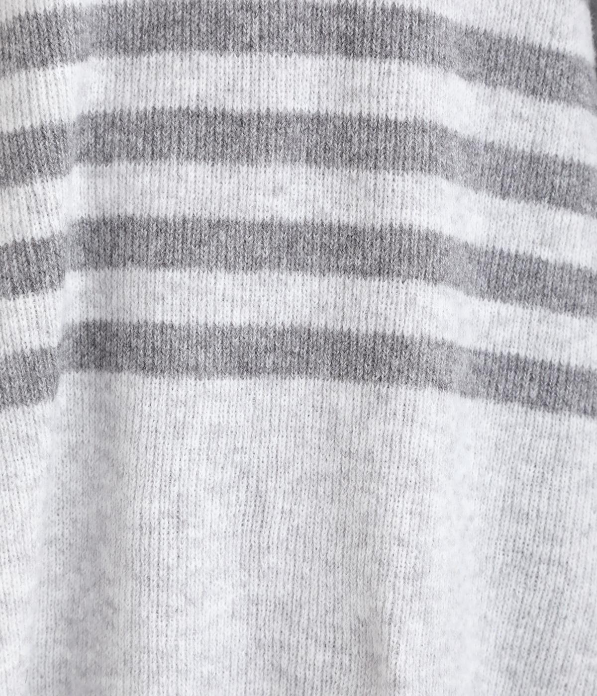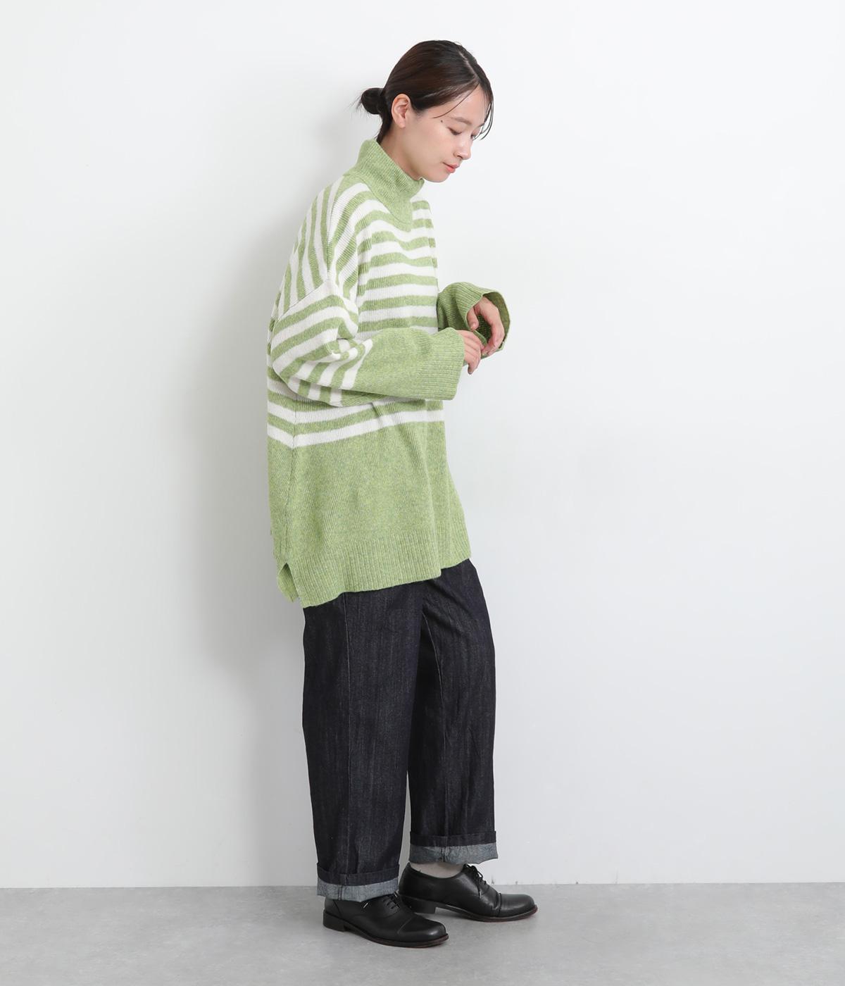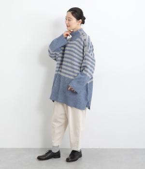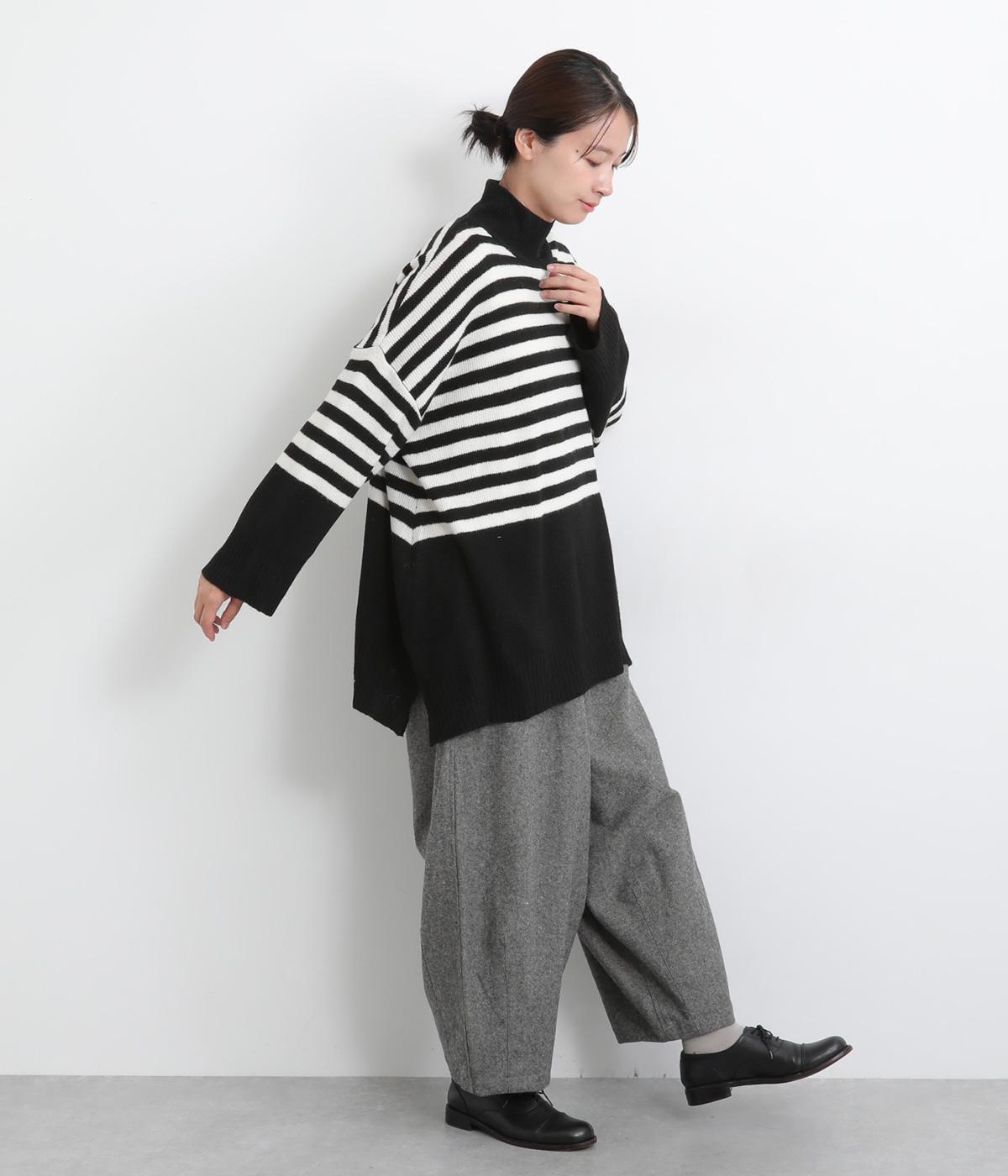 配色ボーダーに肩あきのボタンがデザインポイントの一枚。ゆったりとしたシルエットは自然なドレープが生まれてニュアンス良く着こなせます。首元まであたためてくれるハイネックは、ボタン開閉で被りやすさも◎。