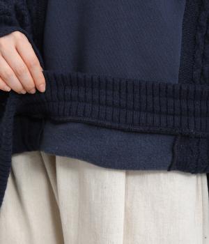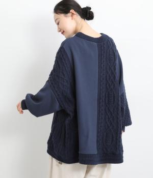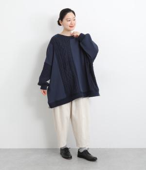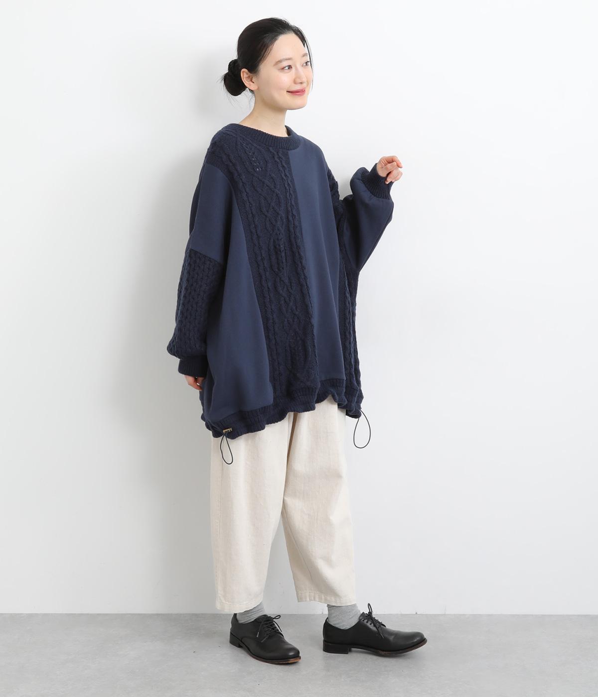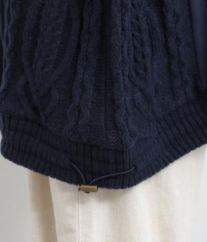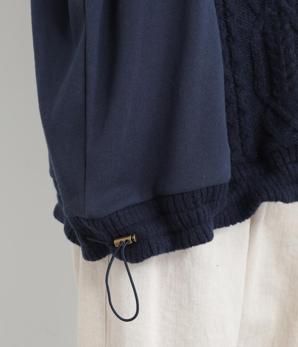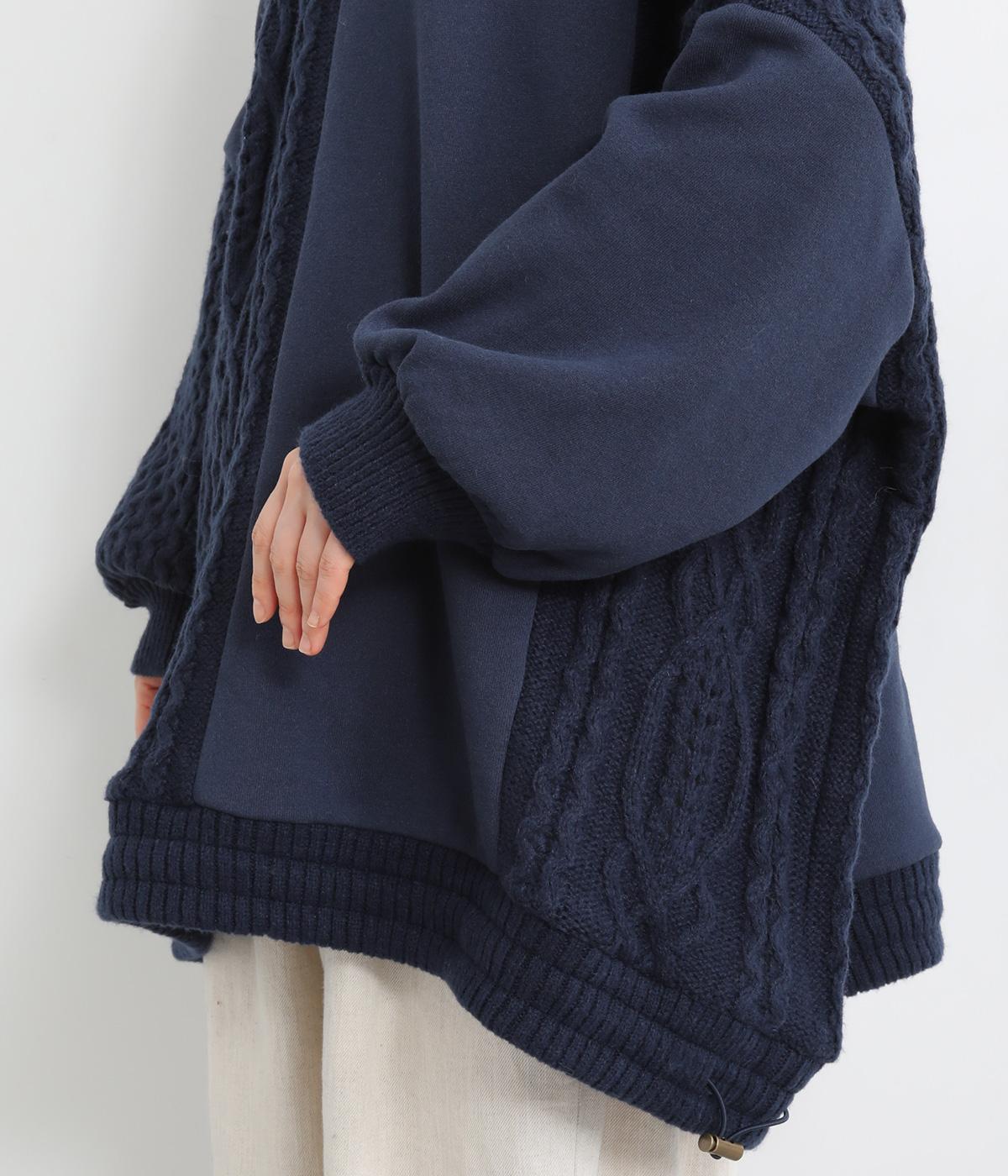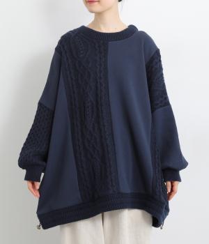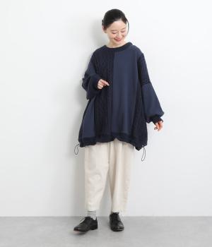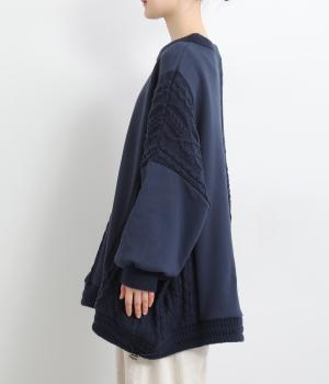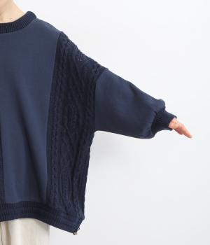 立体的なケーブル編みニットと裏毛スウェットの異素材を組み合わせました。裏毛はやわらかく保温性がありながらも通気性を確保し、ケーブル編みはポリエステル製で軽さとあたたかさを両立。