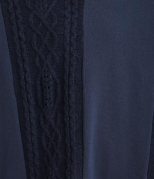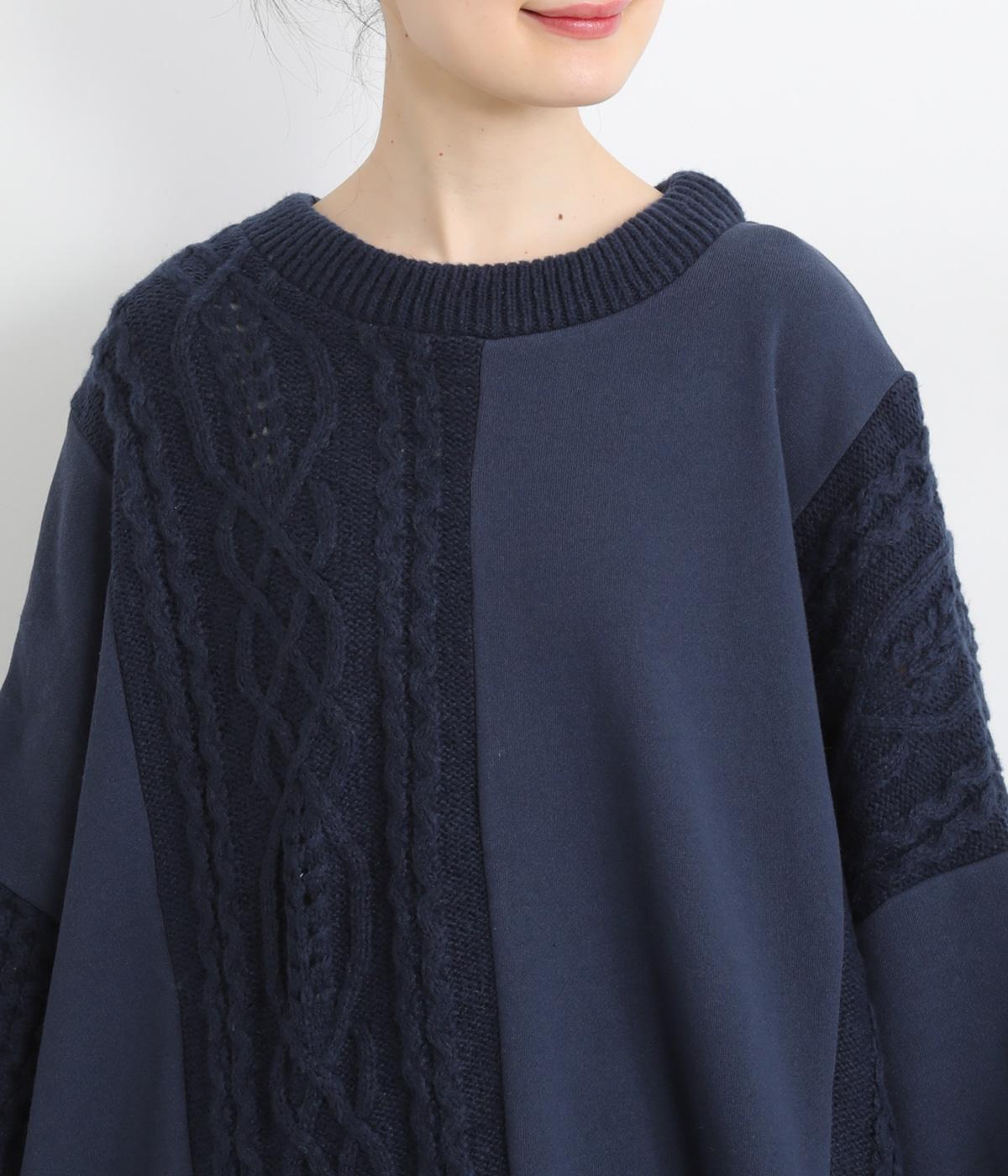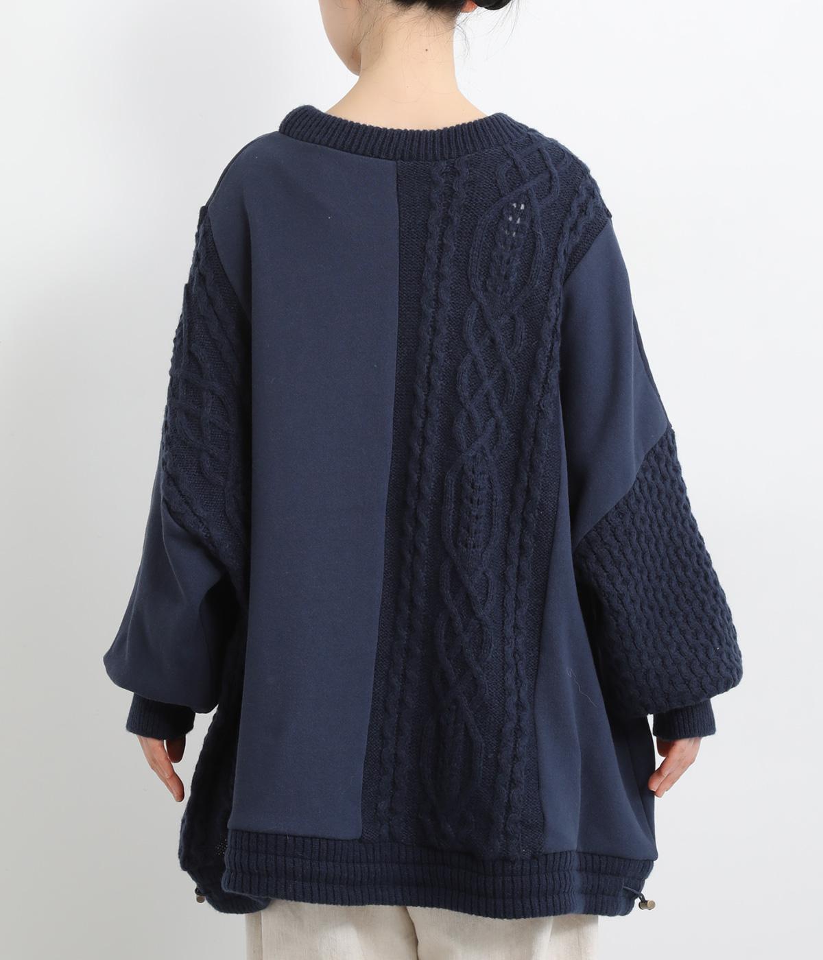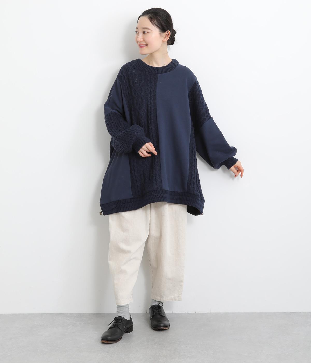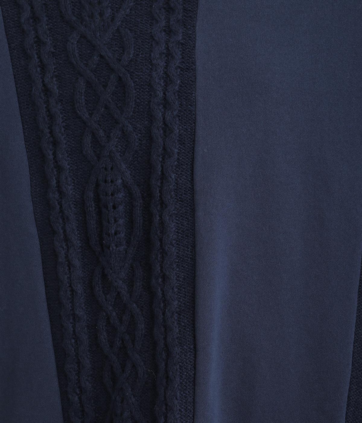 立体的なケーブル編みニットと裏毛スウェットの異素材を組み合わせました。裏毛はやわらかく保温性がありながらも通気性を確保し、ケーブル編みはポリエステル製で軽さとあたたかさを両立。