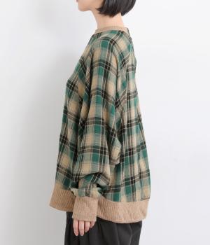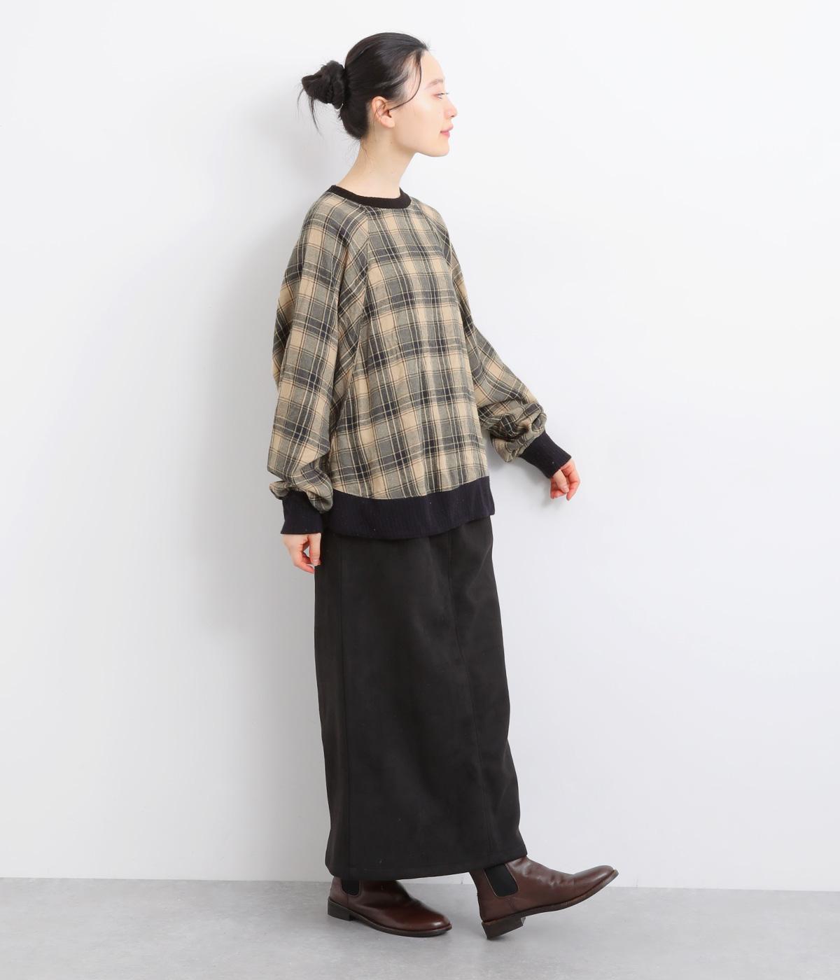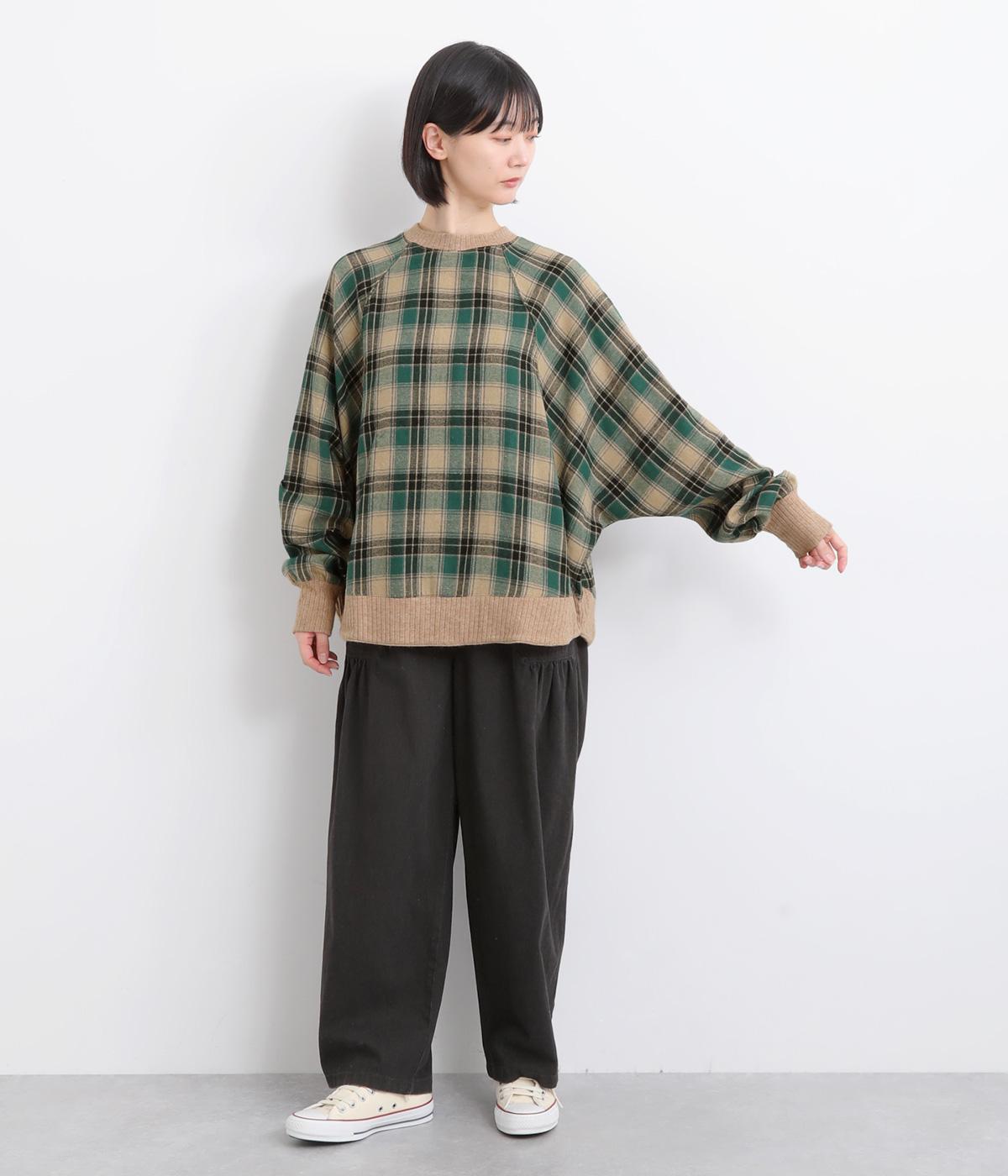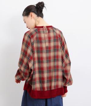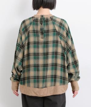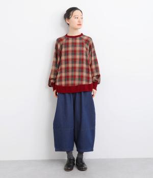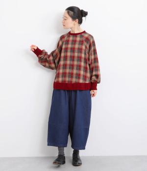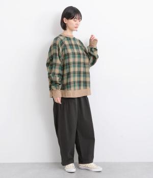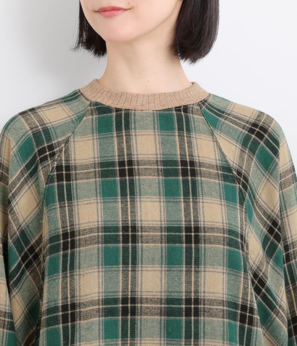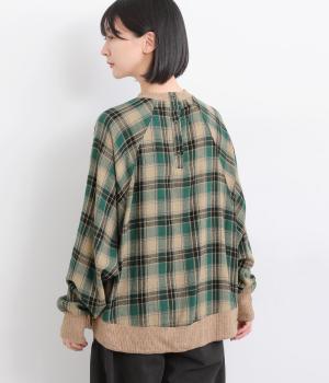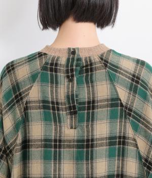色の重なりやラインの太さをていねいに組み合わせたチェック柄が印象的なプルオーバーです。ドルマンスリーブのゆるやかなシルエットが肩まわりをつつみ込み、重ね着しやすいデザインに。後ろには小さなボタンが並び、さりげないアクセントになっています。絶妙な丈感が、腰まわりをふんわりとカバーしてくれるのも◎。