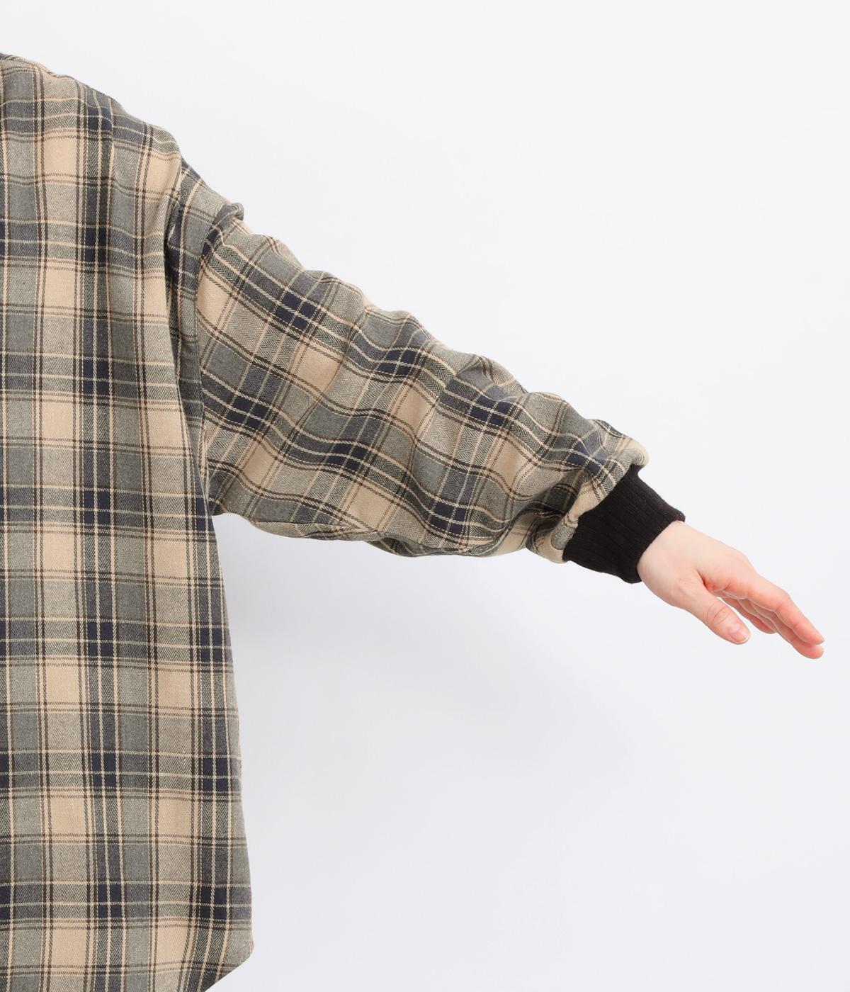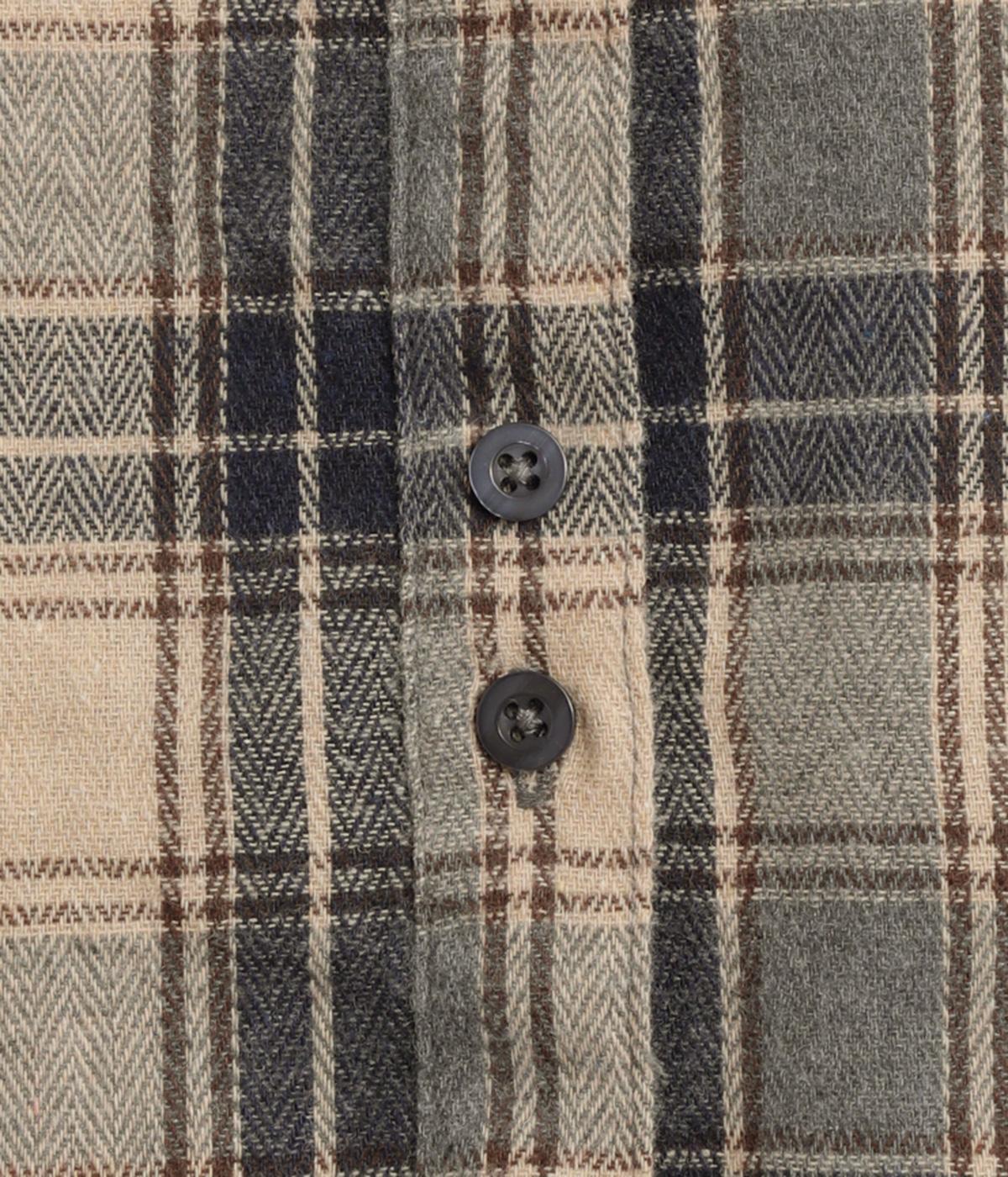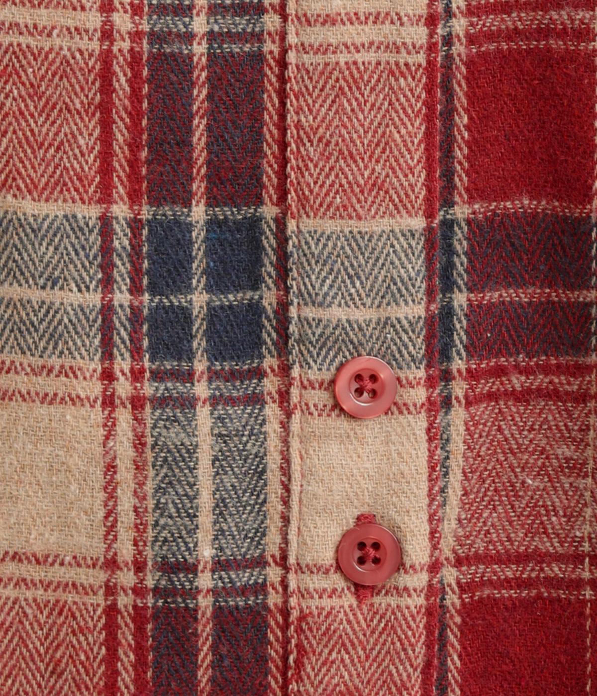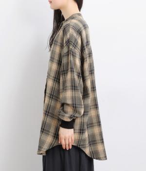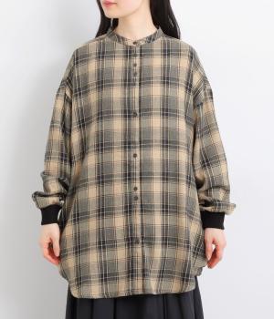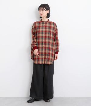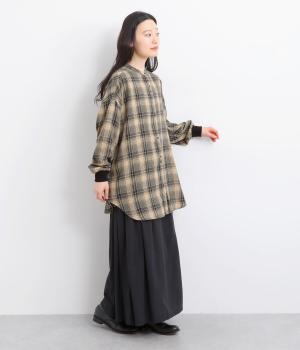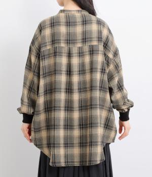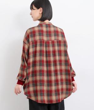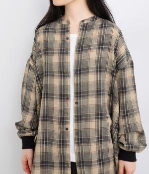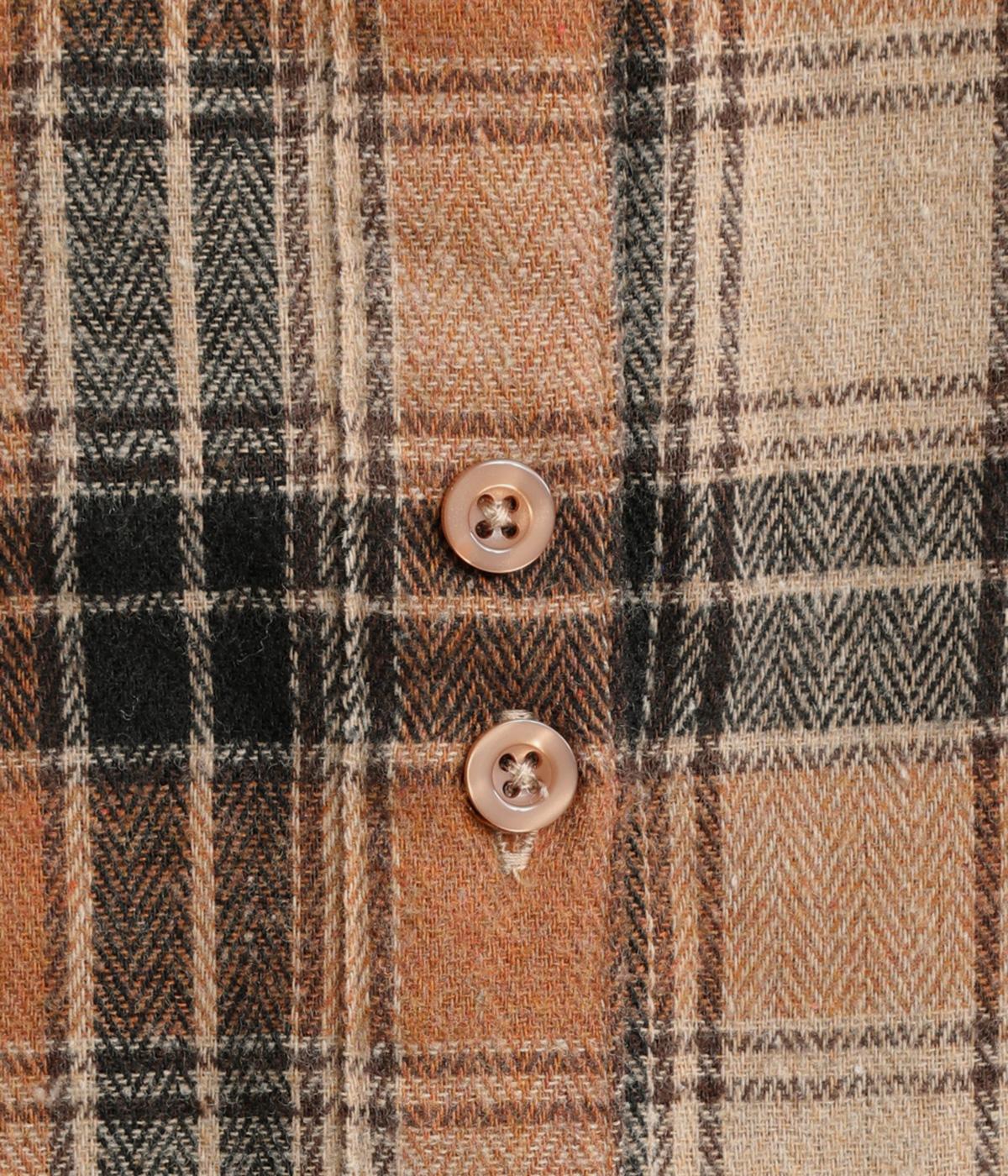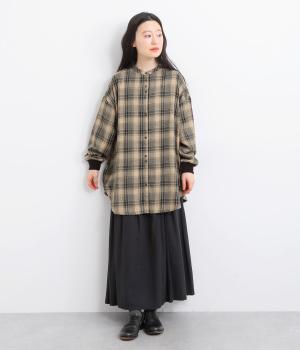 色の重なりやラインの太さをていねいに組み合わせたチェック柄が印象的な一枚。フロントボタンをあえてランダムに並べた個性と抜け感が魅力です。長めの丈で体のラインをカバーしつつ、袖口にはリブを施し、シルエットにメリハリをつくりました。