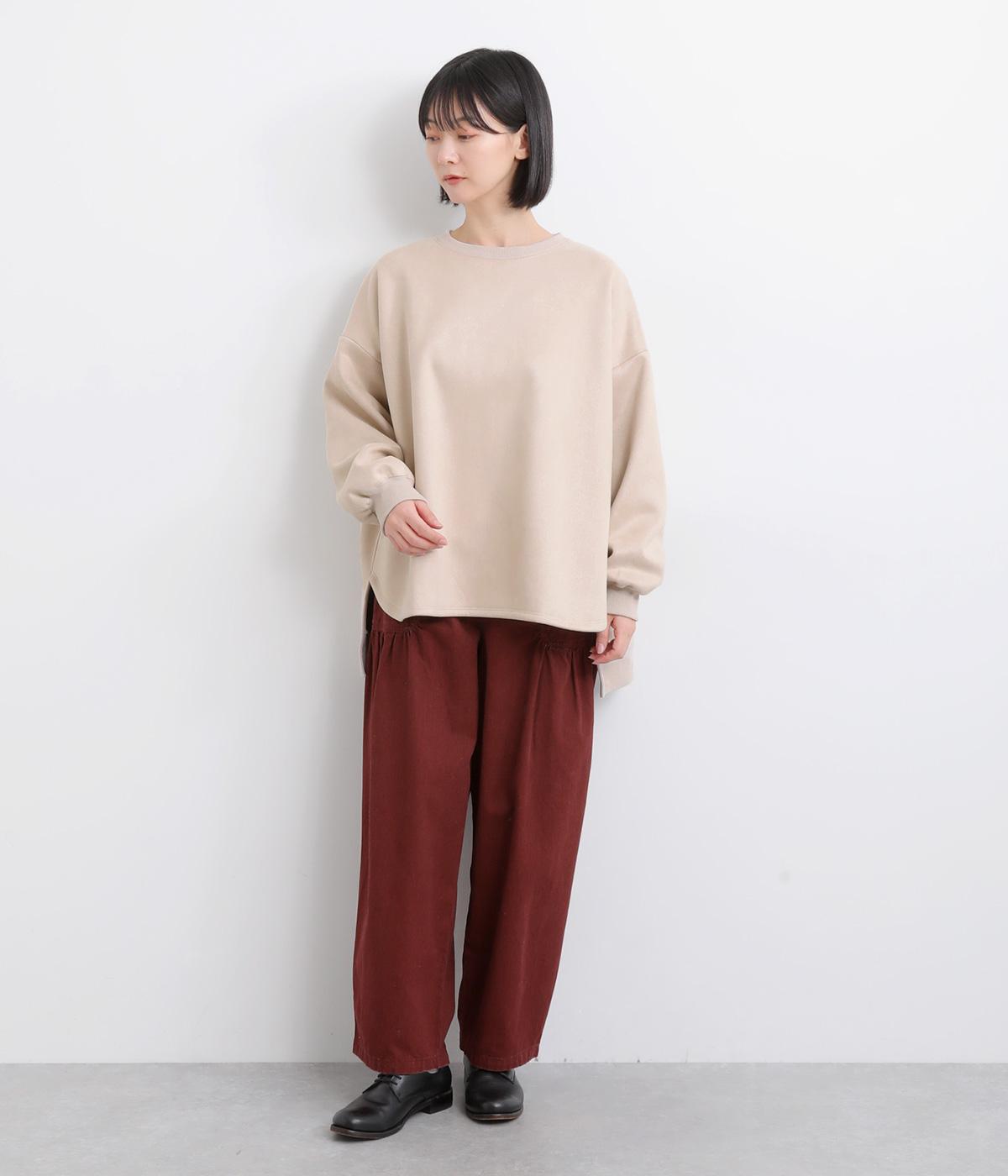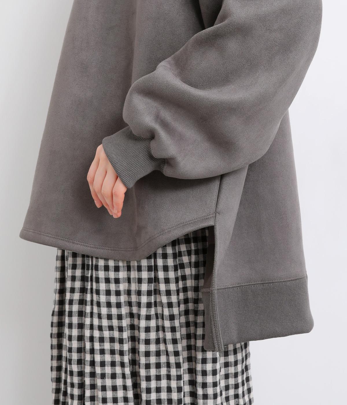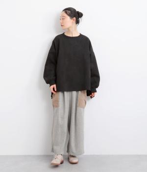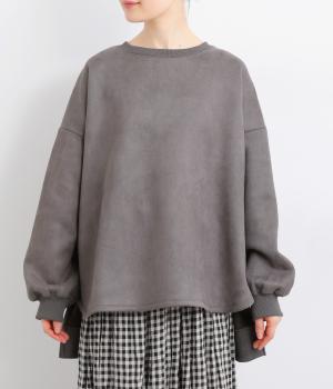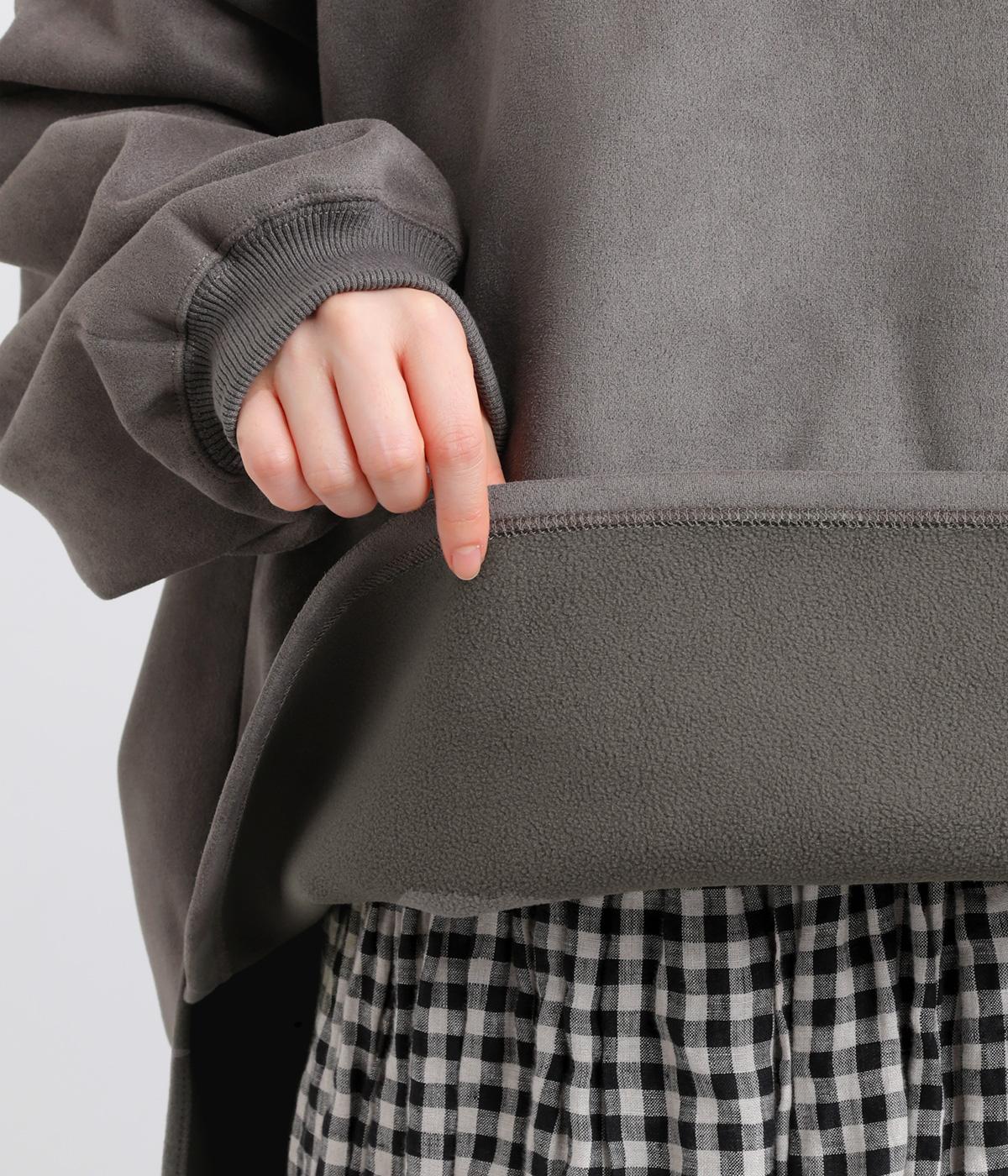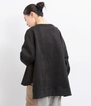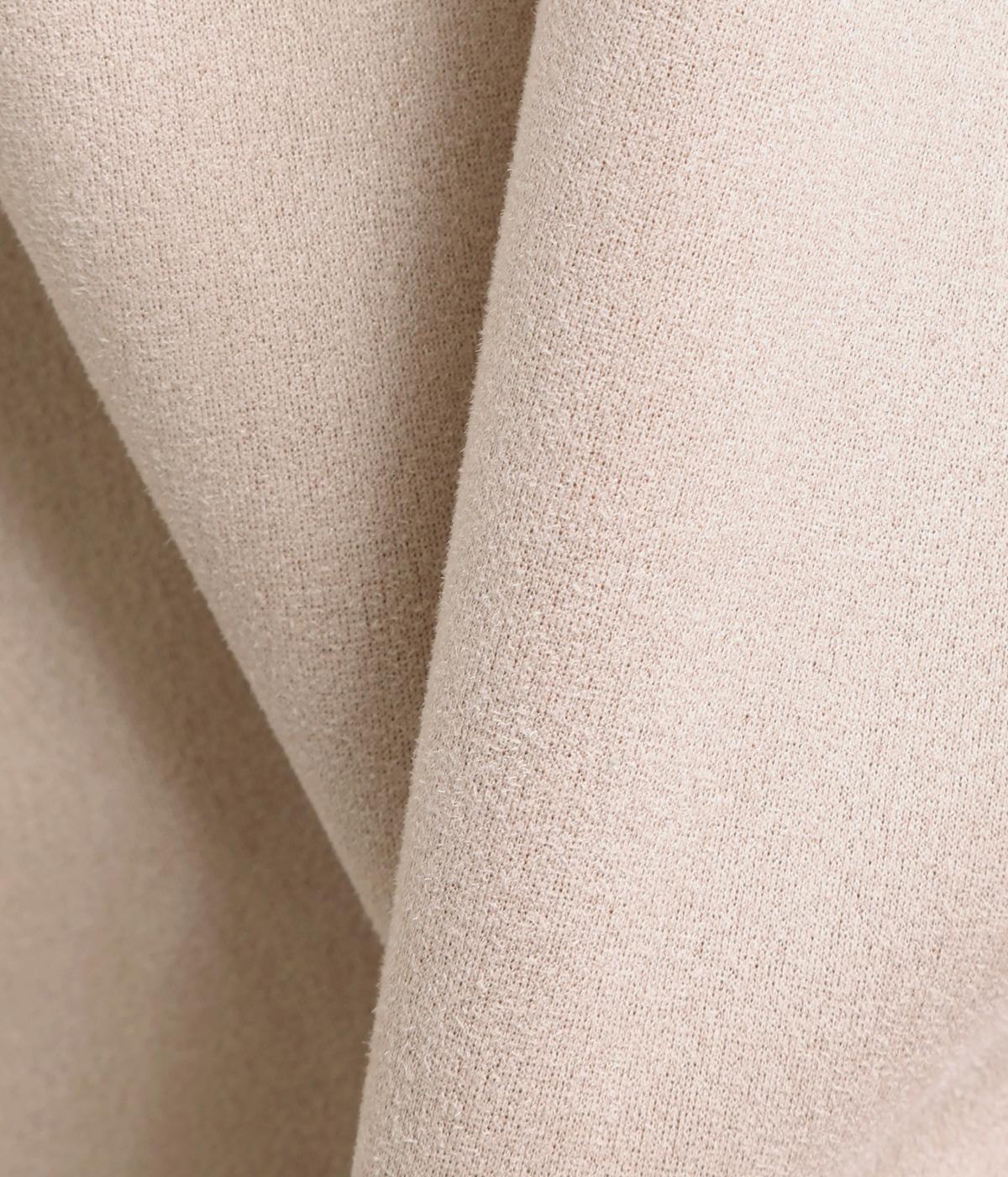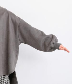 表側はフェイクスエードならではの微起毛がなめらかで、しっとりとした手ざわりが魅力。光の当たり方でやわらかな陰影が生まれ、上品な表情を見せます。裏地には、ふんわりとあたたかなフリースを重ねました。軽さもありつつほどよいハリで、シルエットがきれいにきまる素材です。